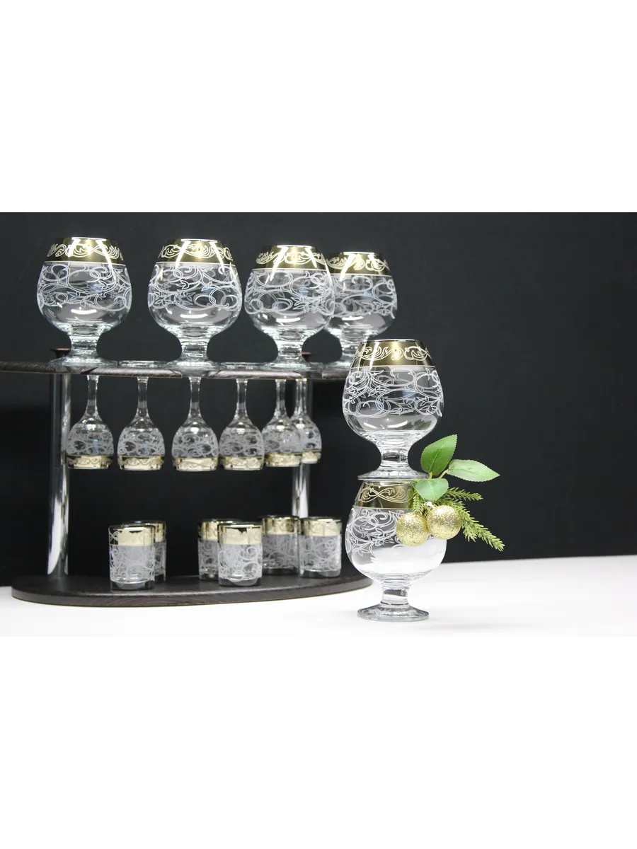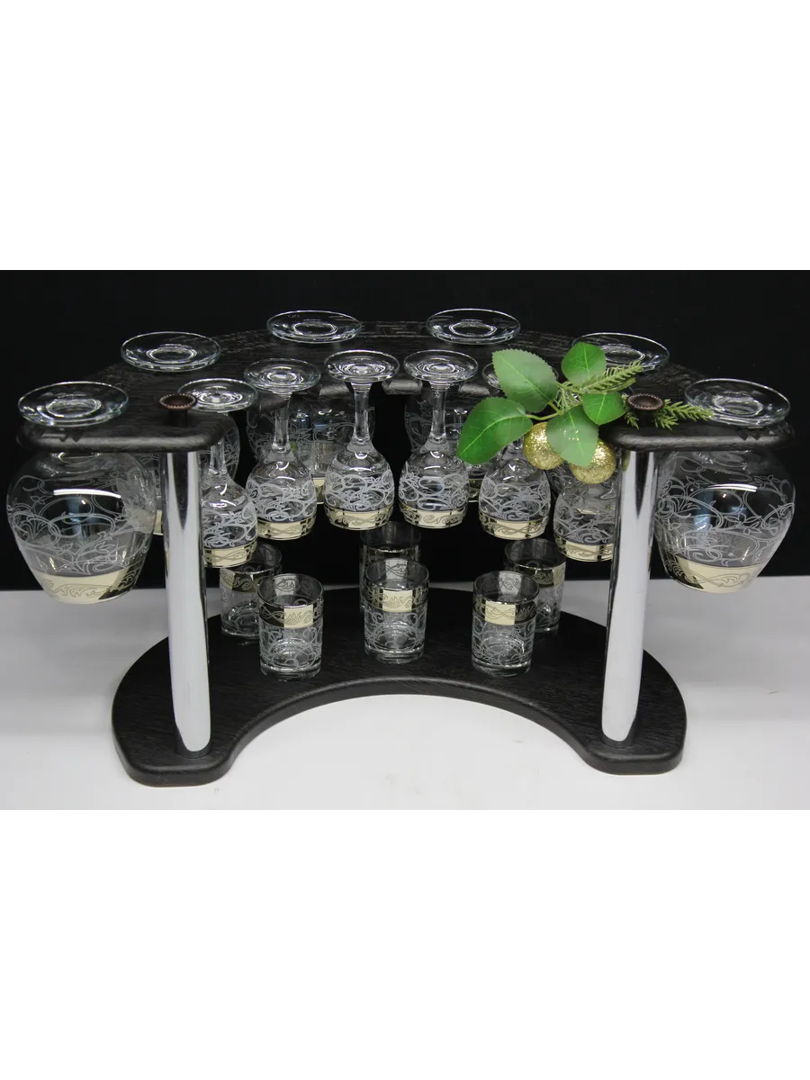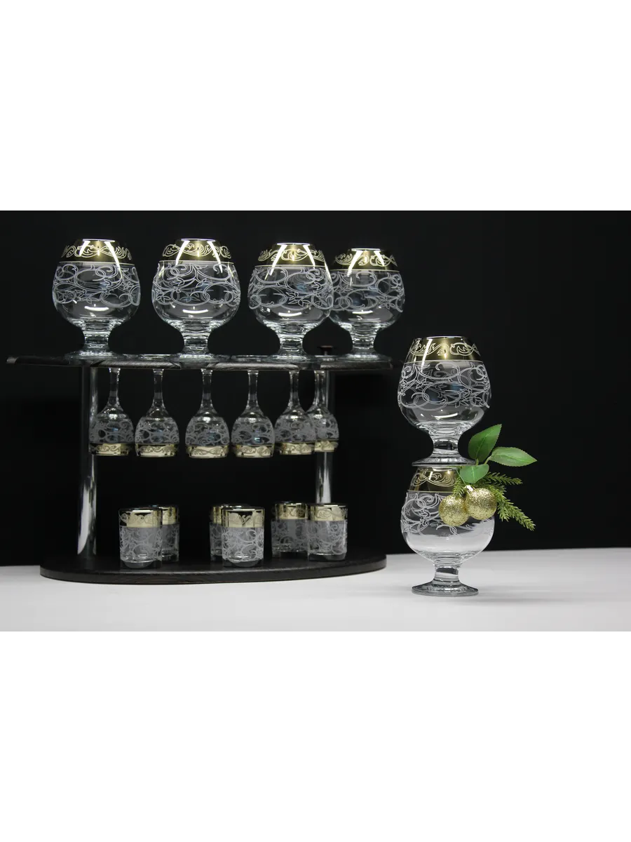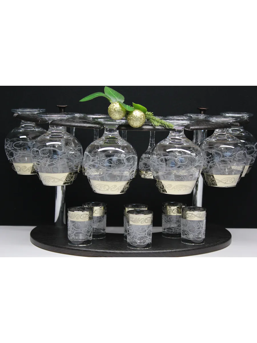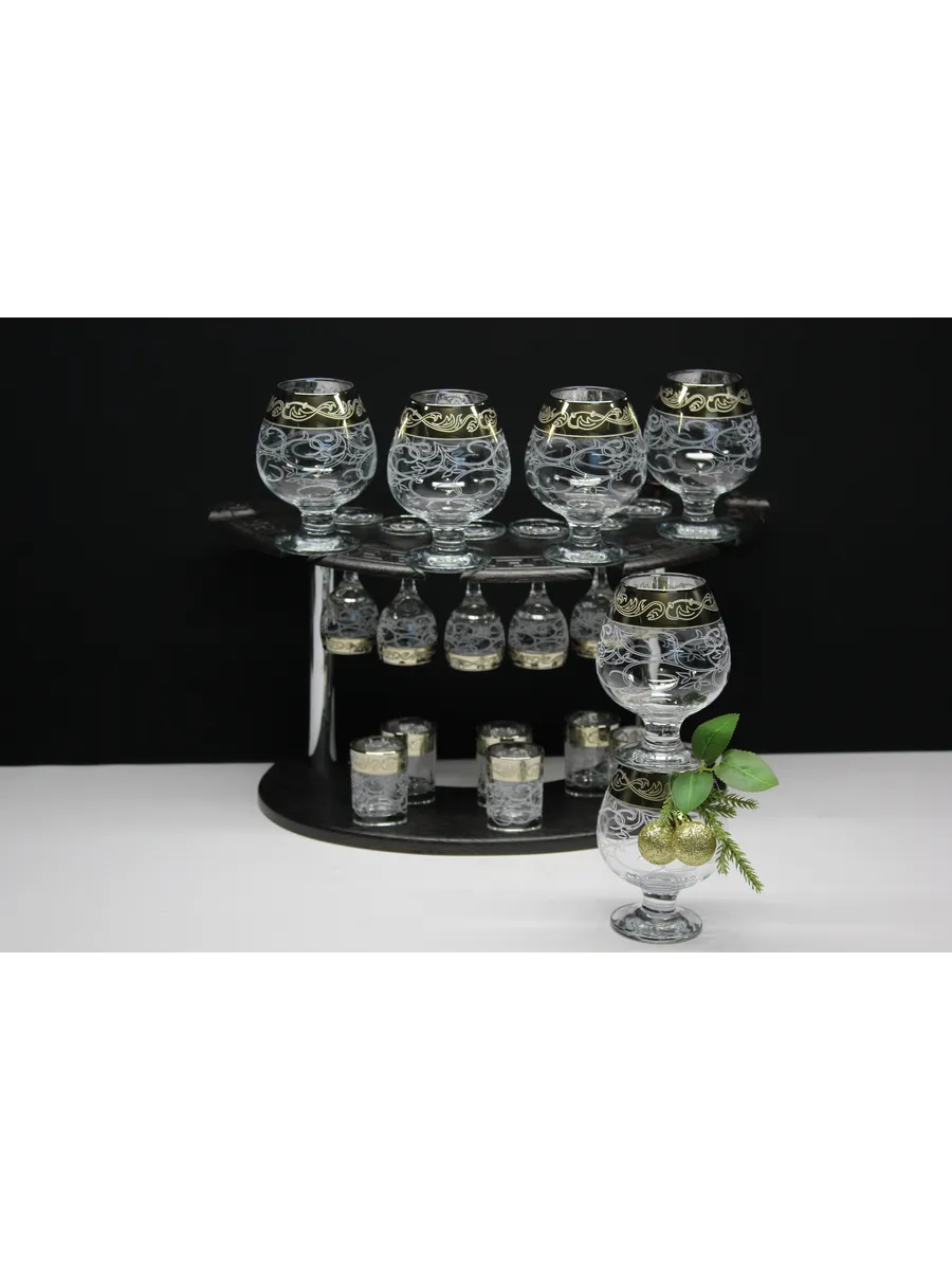 Барный набор 18 предметов из 6 фужеров, 6 рюмок и 6 стопок с гравировкой и золотым напылением на барной стойке из МДФ - это не только функциональная вещь, но и настоящий предмет искусства, который будет радовать глаз и душу на многие годы. Закажите сейчас и наслаждайтесь настоящими напитками в стильном и роскошном дизайне!