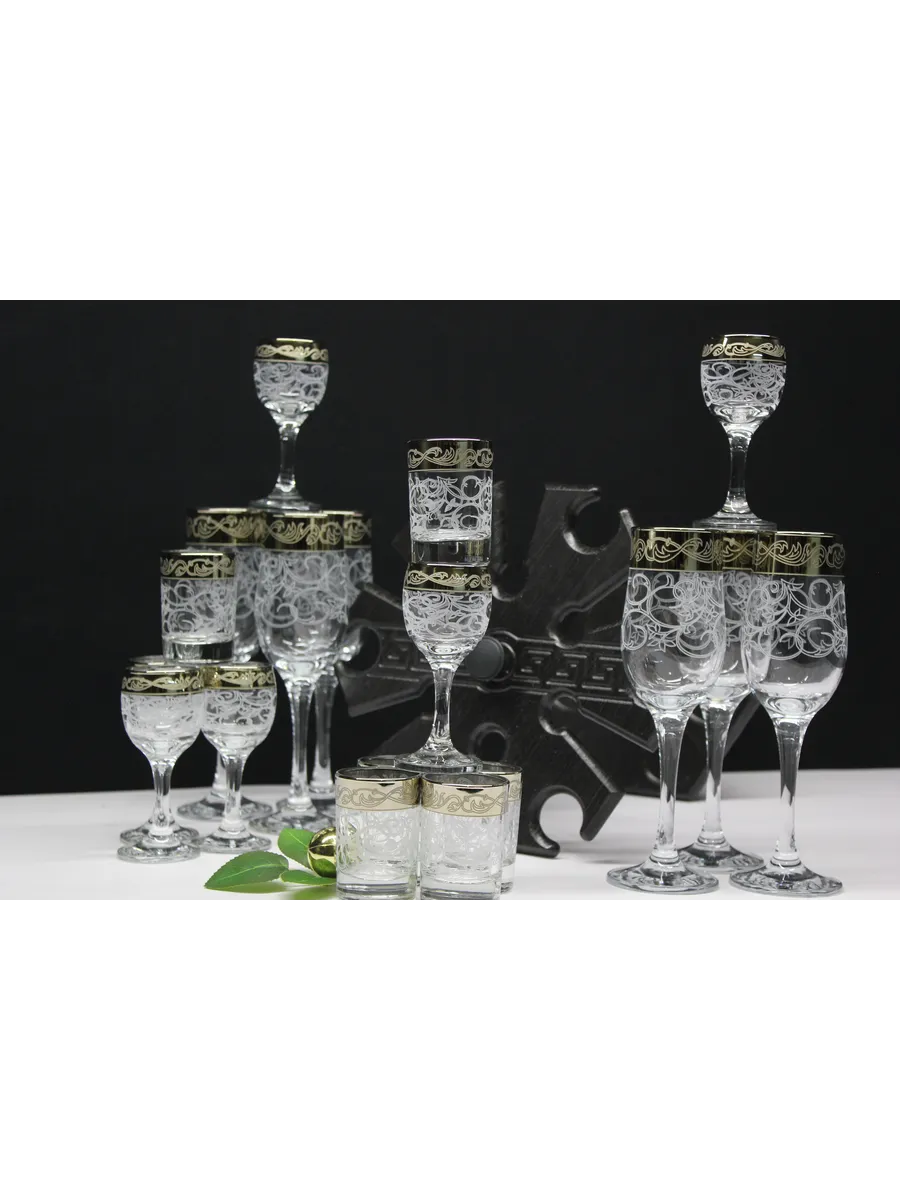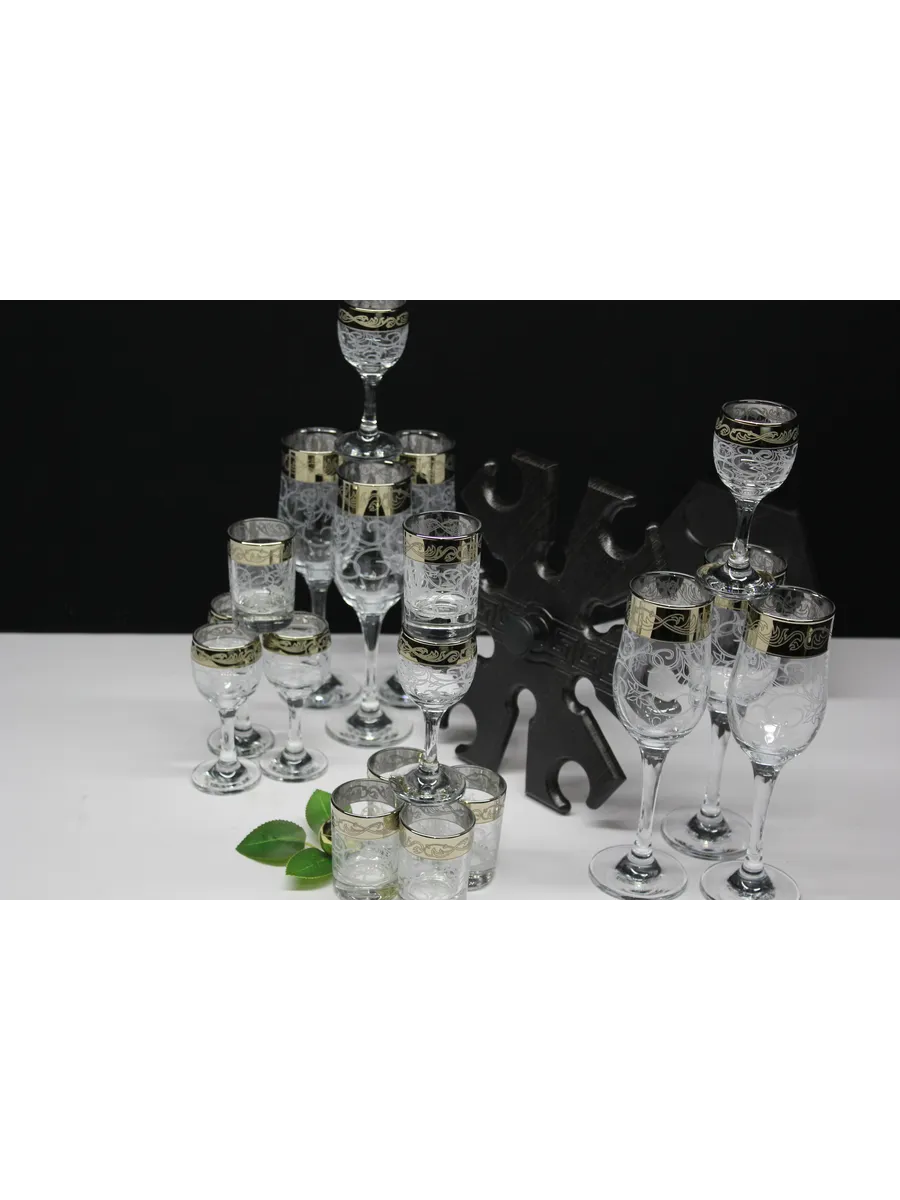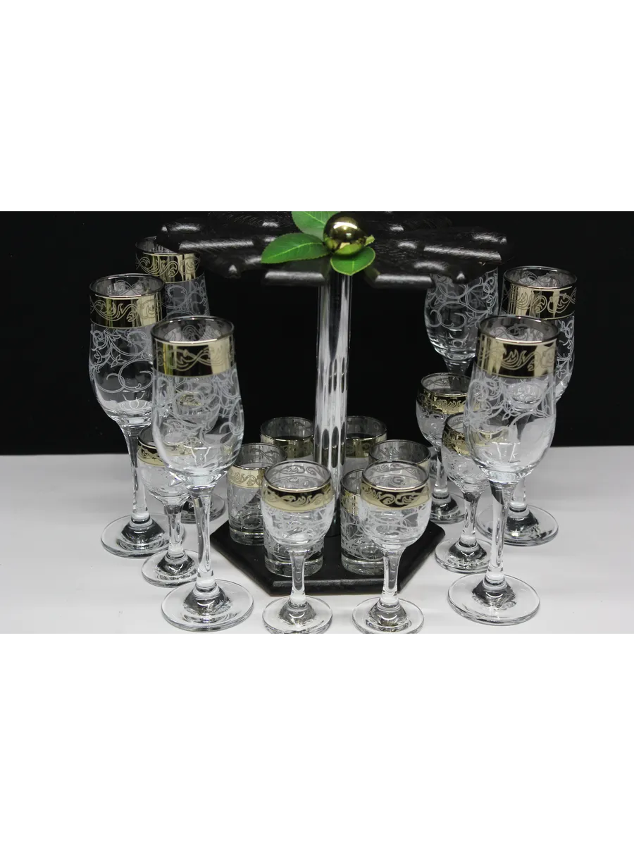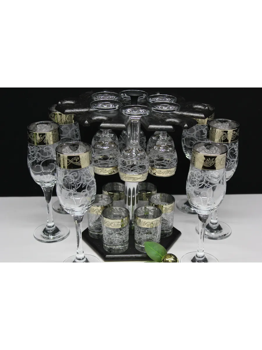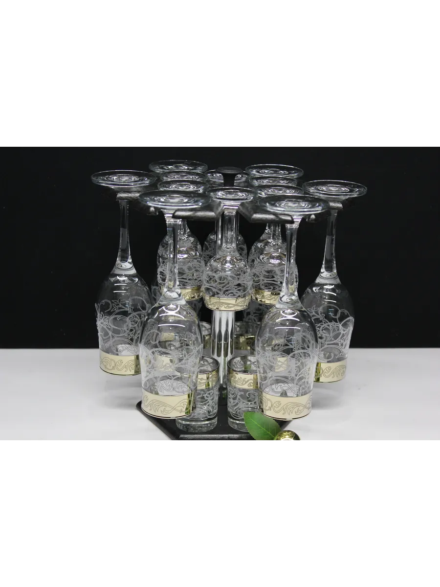 Барный набор "Карусель" 18 предметов из 6 бокалов, 6 рюмок и 6 стопок с гравировкой и золотым напылением на барной стойке из МДФ - это не только функциональная вещь, но и настоящий предмет искусства, который будет радовать глаз и душу на многие годы. Закажите сейчас и наслаждайтесь настоящими напитками в стильном и роскошном дизайне!