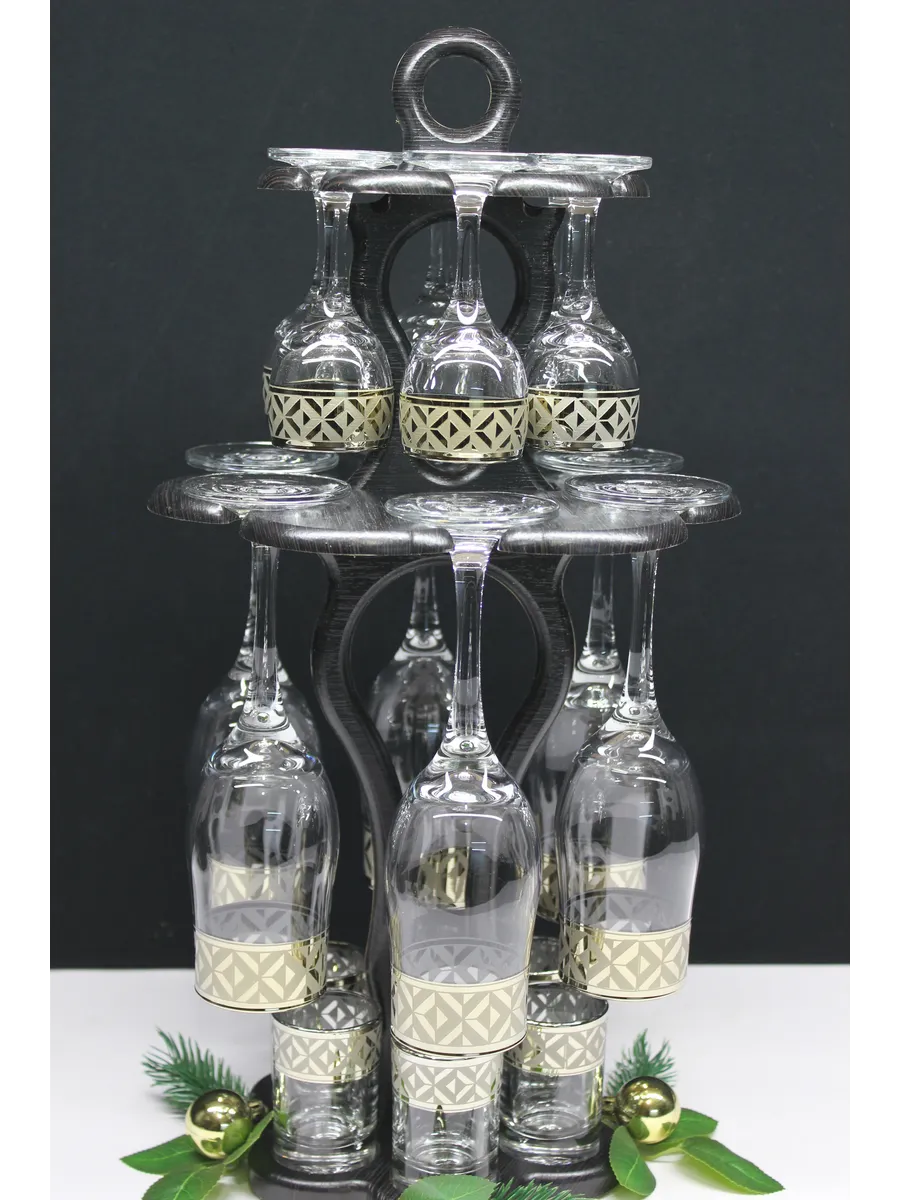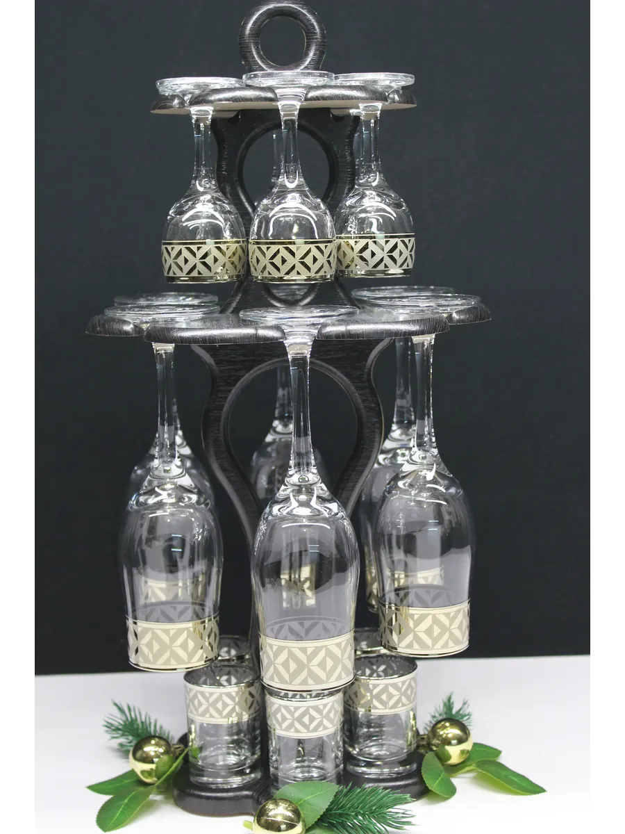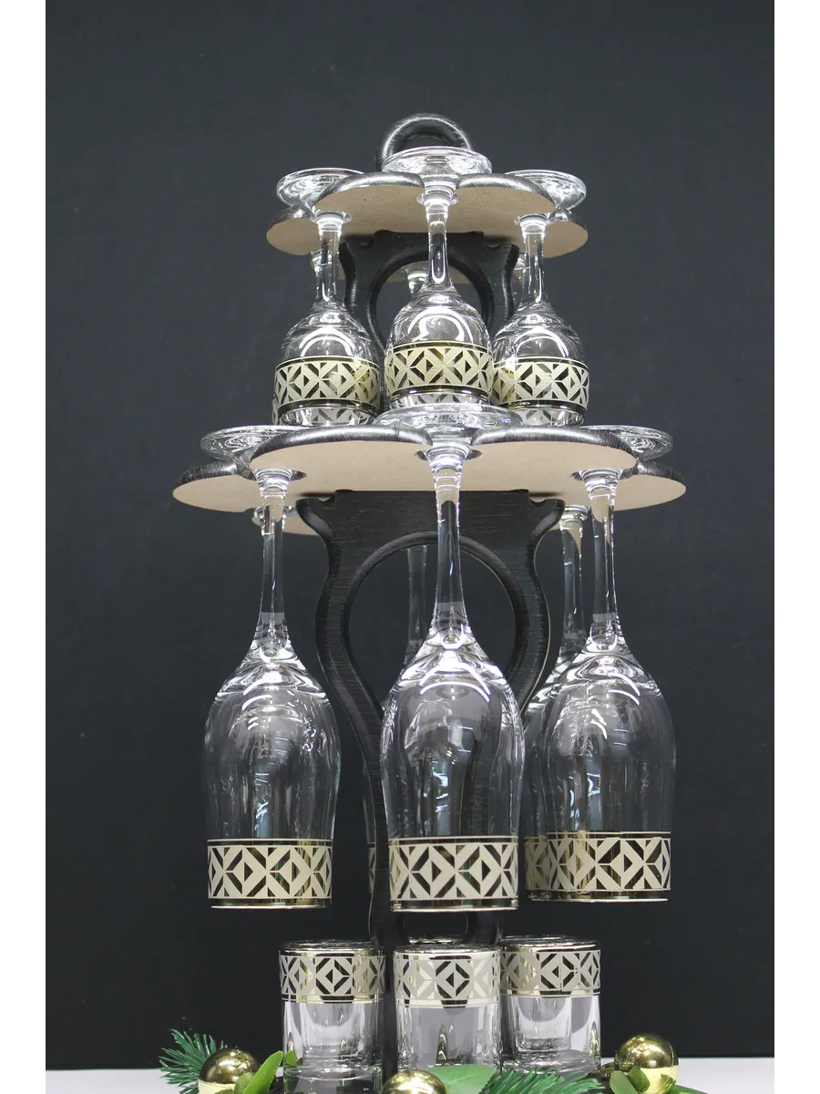 Гравировка в стиле геометрия и золотое напыление придают набору оригинальный и роскошный вид. Барная стойка из МДФ имеет современный и стильный дизайн, который будет выглядеть отлично в любом интерьере. Она оснащена специальными отсеками для хранения фужеров и стопок, что позволяет экономить место и поддерживать порядок на барной стойке.