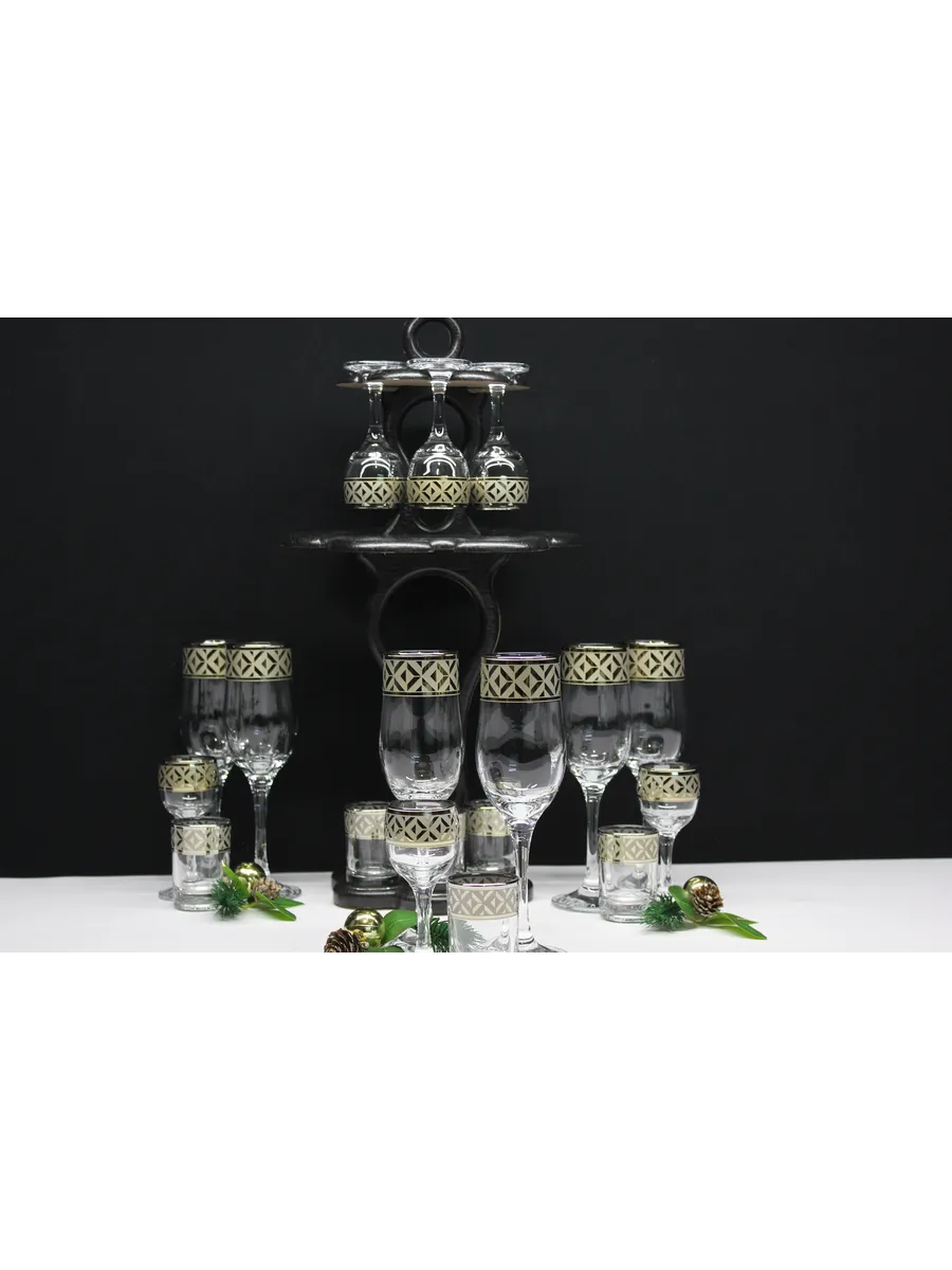 Этот стильный барный набор "Изящный" включает в себя 18 предметов, среди которых 6 Бокалов, 6 рюмок и 6 стопок, украшенных гравировкой в стиле геометрия и золотым напылением, расположенных на барной стойке из МДФ. Набор изготовлен из высококачественного стекла и МДФ, которые прочны и легко очищаются. Бокалы имеют удобную форму, которая позволяет легко наливать напиток, а их объем позволяет насладиться полной меркой напитка. Рюмки эстетичны к более крепким напиткам. Стопки идеальны для разлива других напитков и смешивания коктейлей.