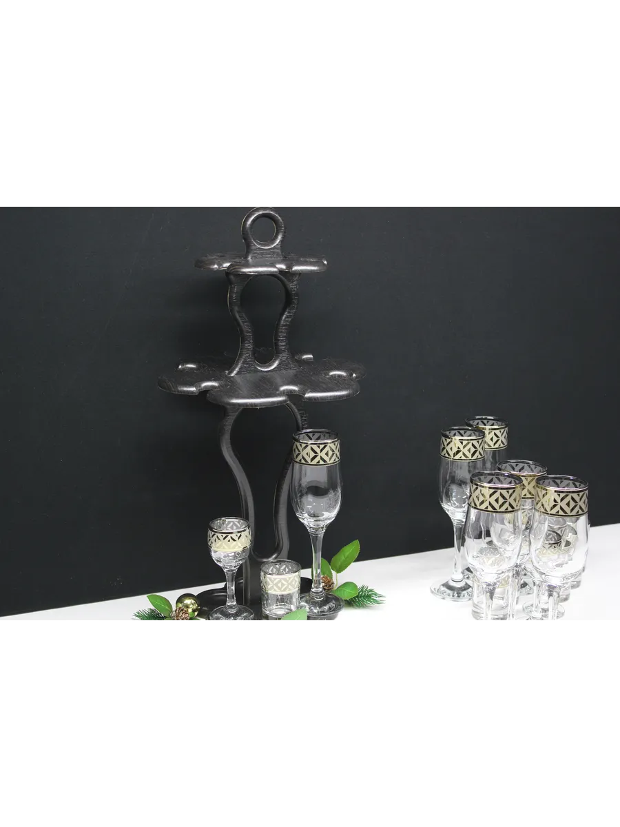 Барный набор "Изящный" 18 предметов из 6 бокалов, 6 рюмок и 6 стопок с гравировкой и золотым напылением на барной стойке из МДФ - это не только функциональная вещь, но и настоящий предмет искусства, который будет радовать глаз и душу на многие годы. Закажите сейчас и наслаждайтесь настоящими напитками в стильном и роскошном дизайне!