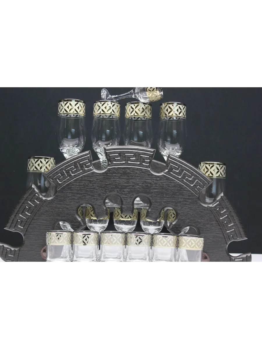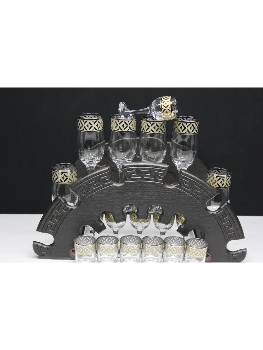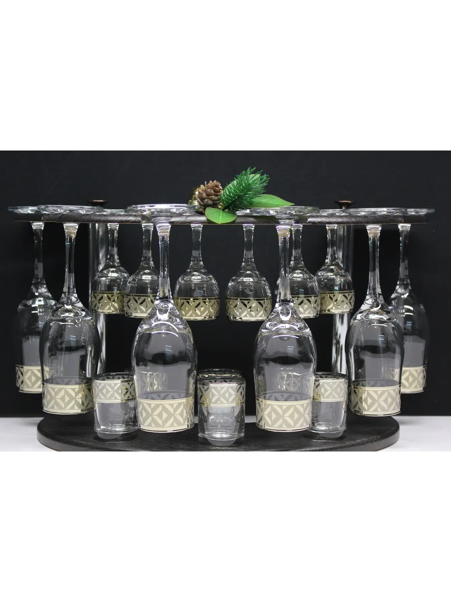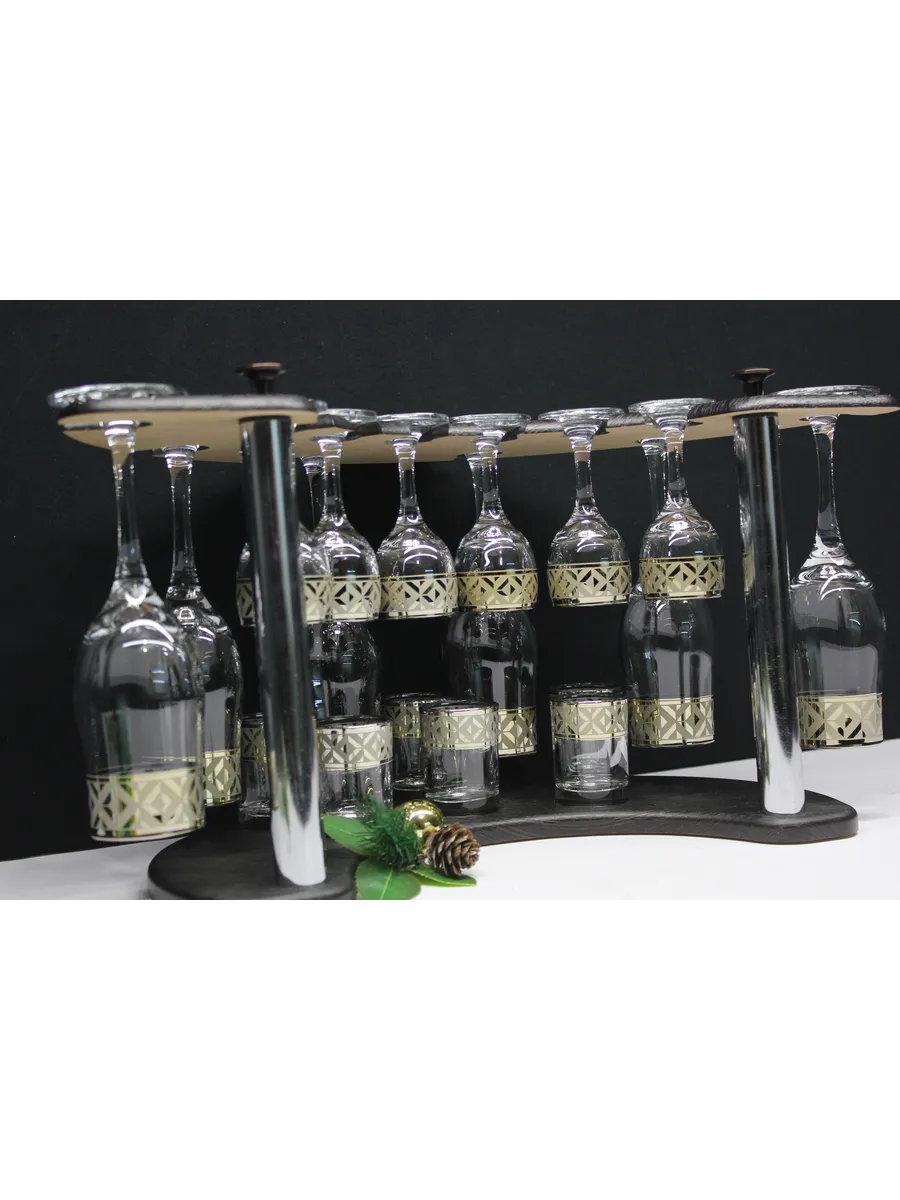 Барный набор 18 предметов из 6 бокалов, 6 рюмок и 6 стопок с гравировкой и золотым напылением на барной стойке из МДФ - это не только функциональная вещь, но и настоящий предмет искусства, который будет радовать глаз и душу на многие годы. Закажите сейчас и наслаждайтесь настоящими напитками в стильном и роскошном дизайне!