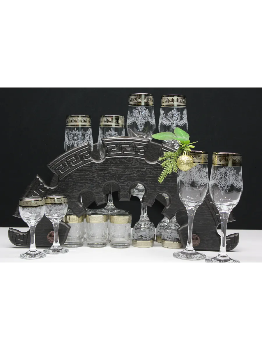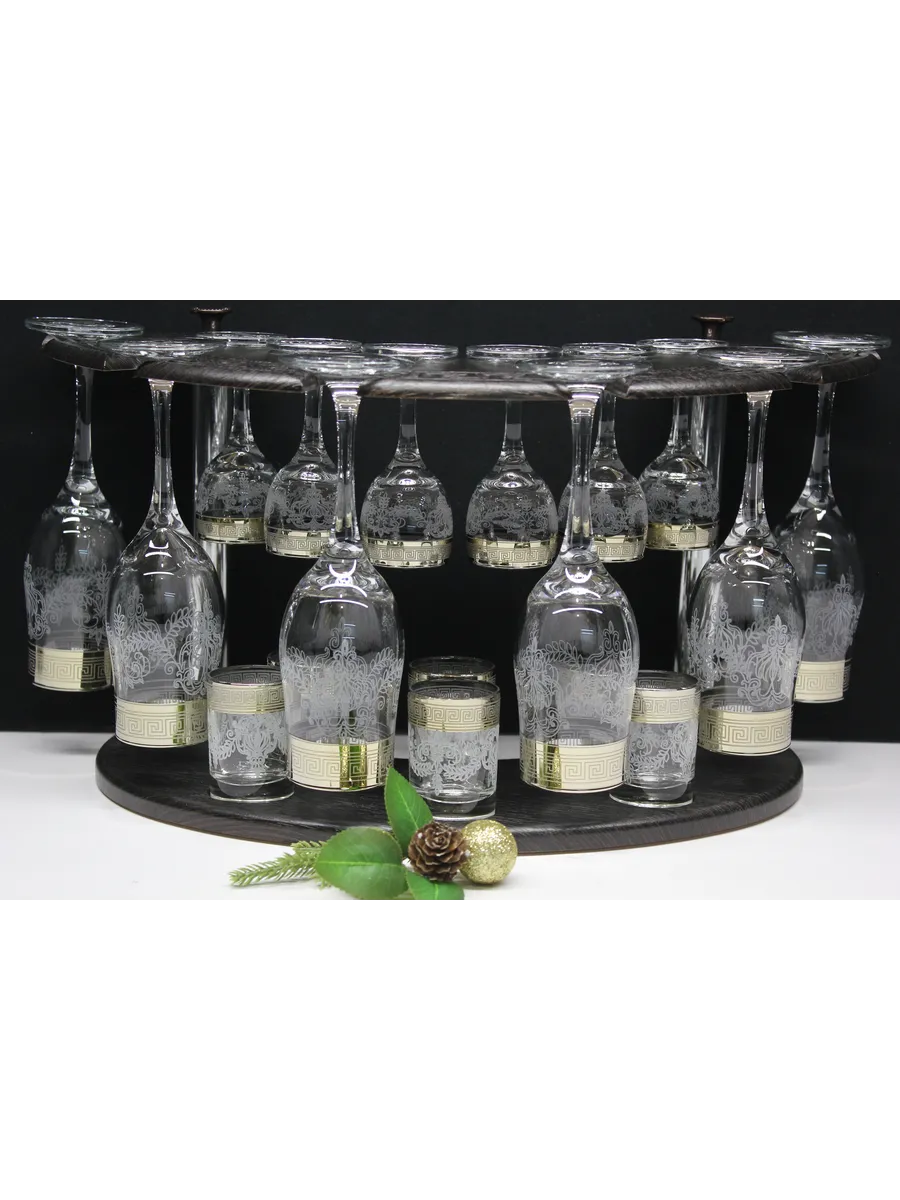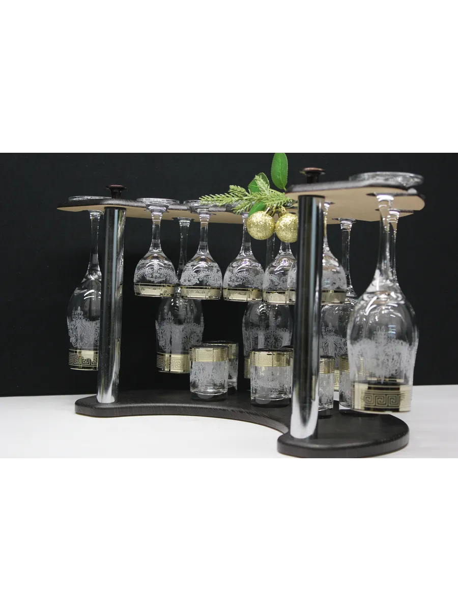 Барный набор 18 предметов из 6 бокалов, 6 рюмок и 6 стопок с гравировкой и золотым напылением на барной стойке из МДФ - это не только функциональная вещь, но и настоящий предмет искусства, который будет радовать глаз и душу на многие годы. Закажите сейчас и наслаждайтесь настоящими напитками в стильном и роскошном дизайне!