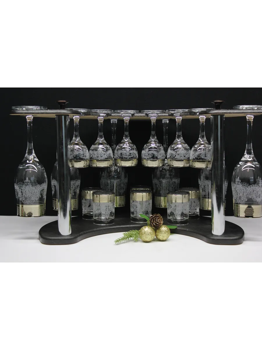 Этот стильный барный набор включает в себя 18 предметов, среди которых 6 бокалов, 6 рюмок и 6 стопок, украшенных гравировкой в стиле барокко и золотым напылением, расположенных на барной стойке из МДФ. Набор изготовлен из высококачественного стекла и МДФ, которые прочны и легко очищаются. Бокалы имеют удобную форму, которая позволяет легко наливать напиток, а их объем позволяет насладиться полной меркой напитка. Рюмки эстетичны к более крепким напиткам. Стопки идеальны для разлива других напитков и смешивания коктейлей.