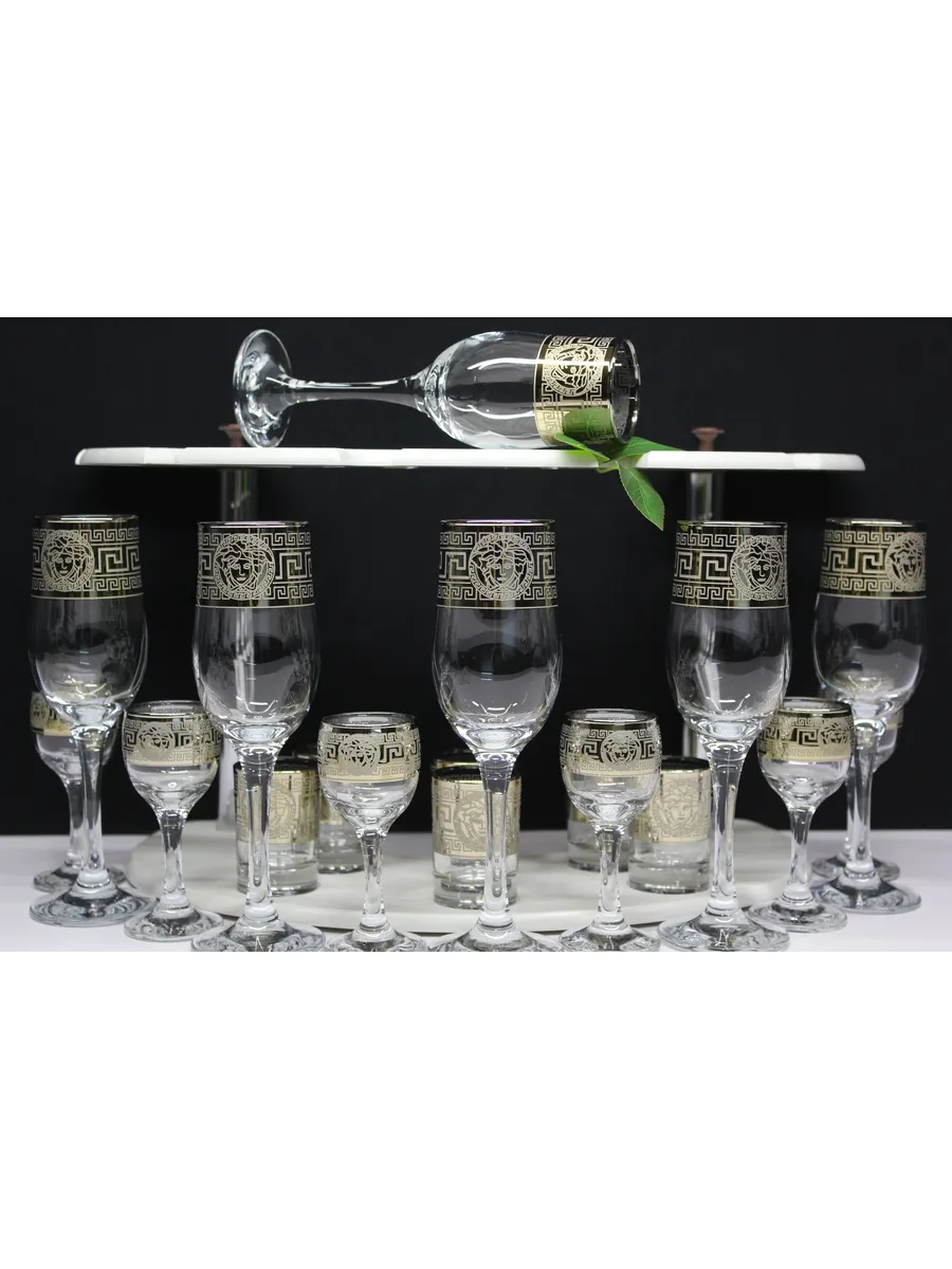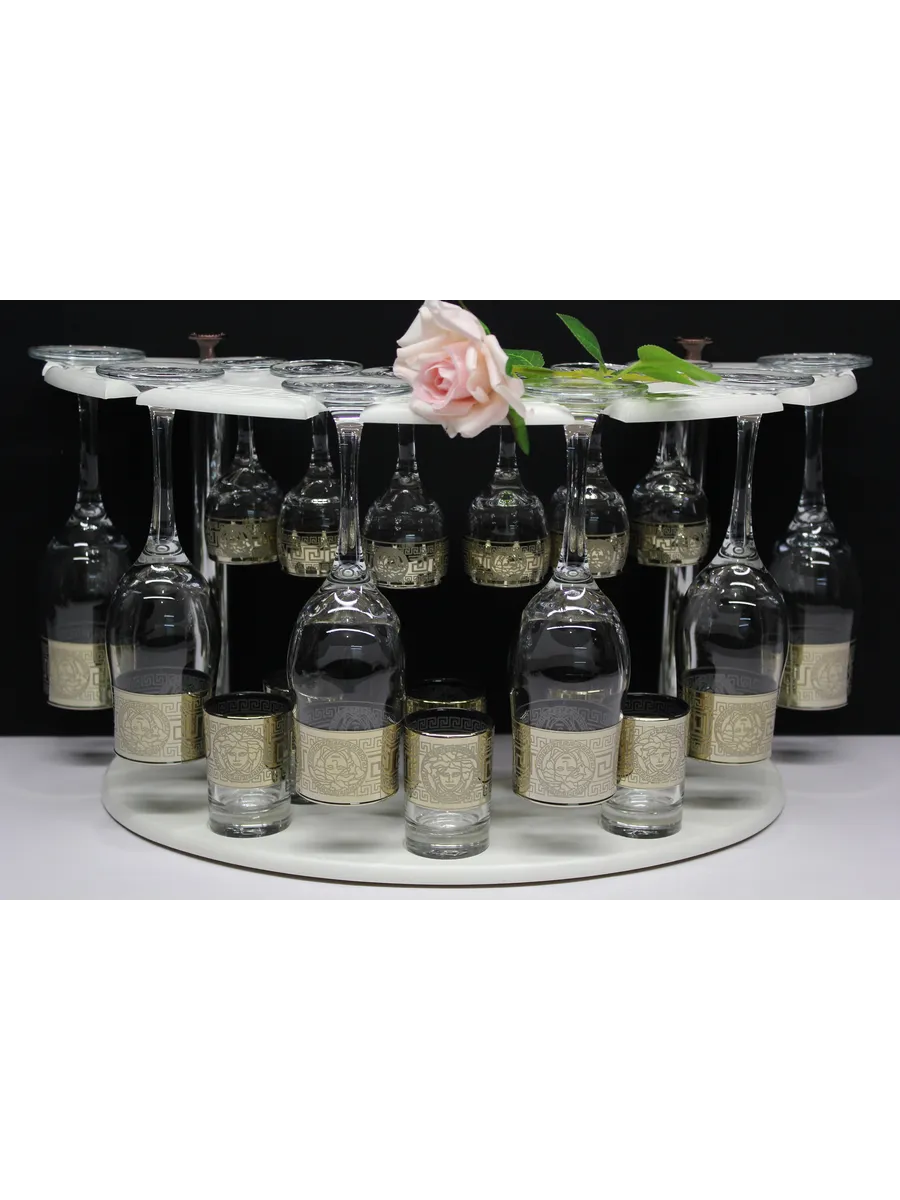 Гравировка в стиле версаче и золотое напыление придают набору оригинальный и роскошный вид. Барная стойка из МДФ имеет современный и стильный дизайн, который будет выглядеть отлично в любом интерьере. Она оснащена специальными отсеками для хранения фужеров и стопок, что позволяет экономить место и поддерживать порядок на барной стойке.