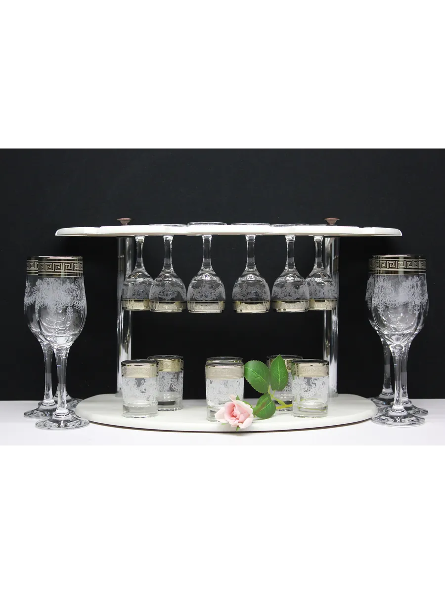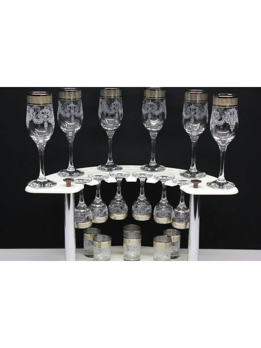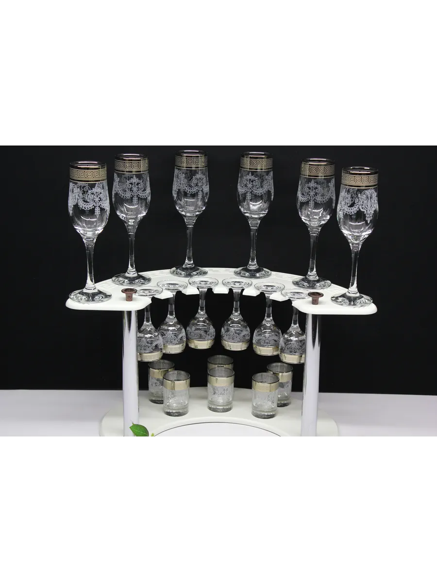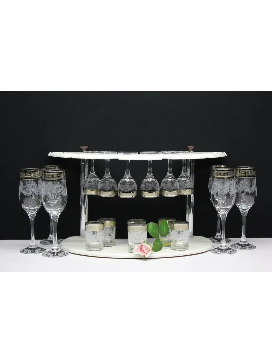 Гравировка в стиле барокко и золотое напыление придают набору оригинальный и роскошный вид. Барная стойка из МДФ имеет современный и стильный дизайн, который будет выглядеть отлично в любом интерьере. Она оснащена специальными отсеками для хранения фужеров и стопок, что позволяет экономить место и поддерживать порядок на барной стойке.