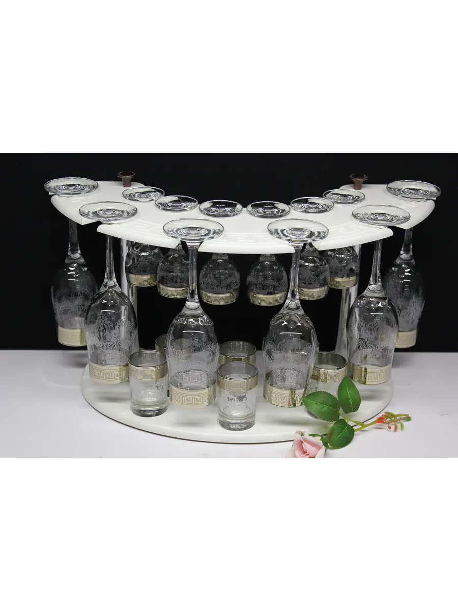 Барный набор "Белая подкова" 18 предметов из 6 бокалов, 6 рюмок и 6 стопок с гравировкой и золотым напылением на барной стойке из МДФ - это не только функциональная вещь, но и настоящий предмет искусства, который будет радовать глаз и душу на многие годы. Закажите сейчас и наслаждайтесь настоящими напитками в стильном и роскошном дизайне!