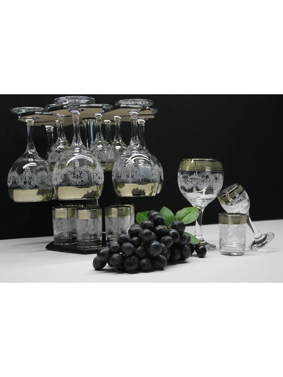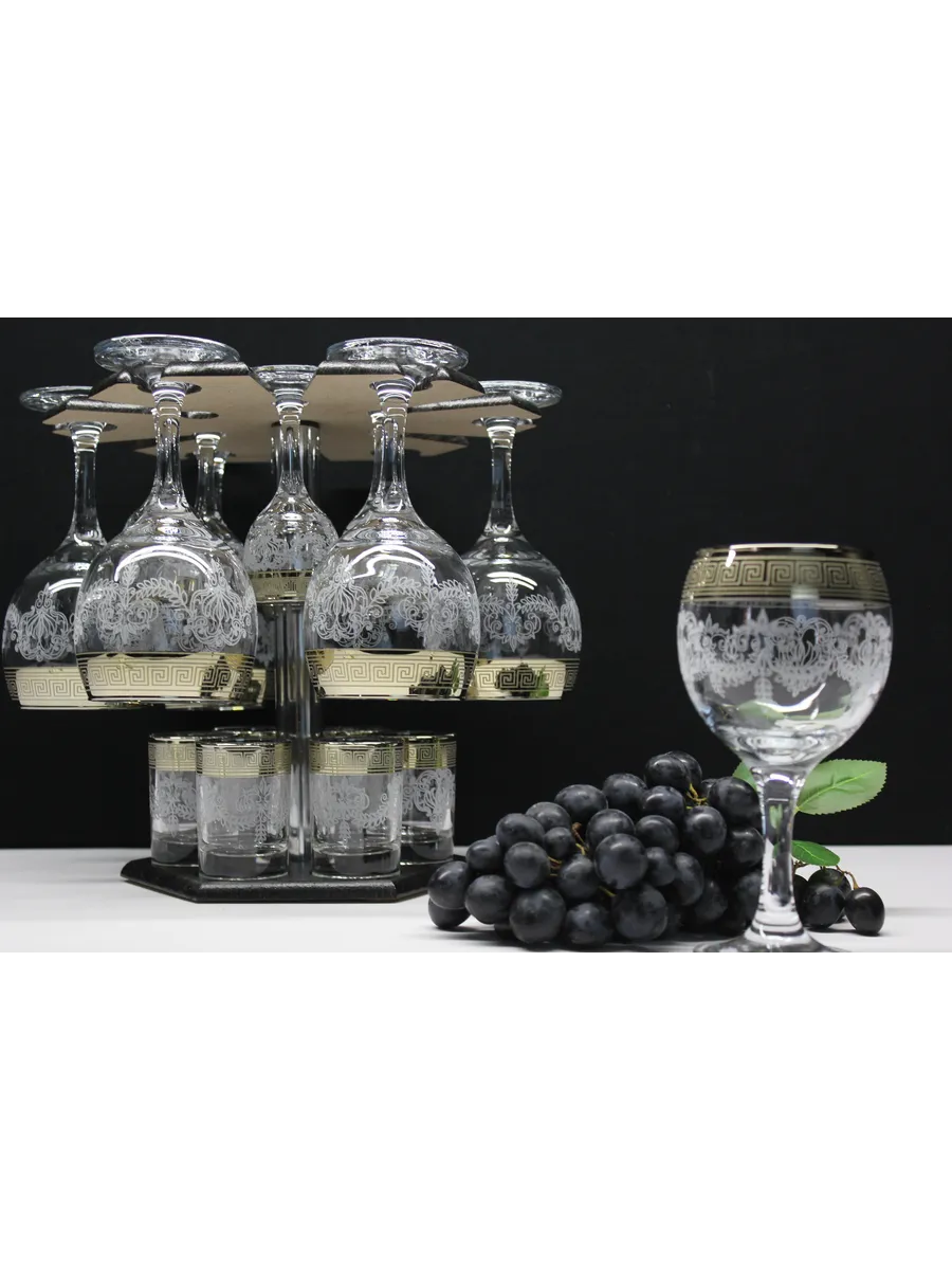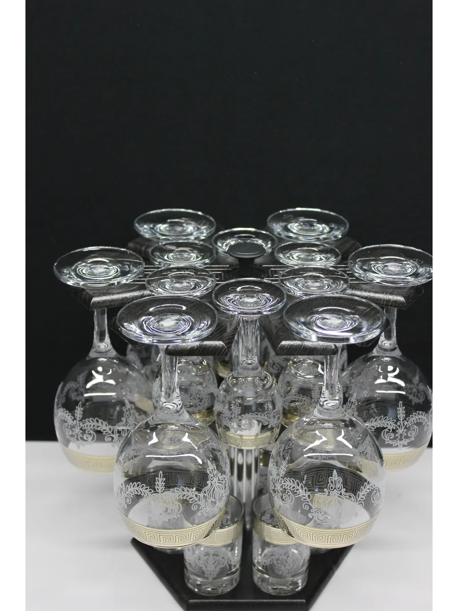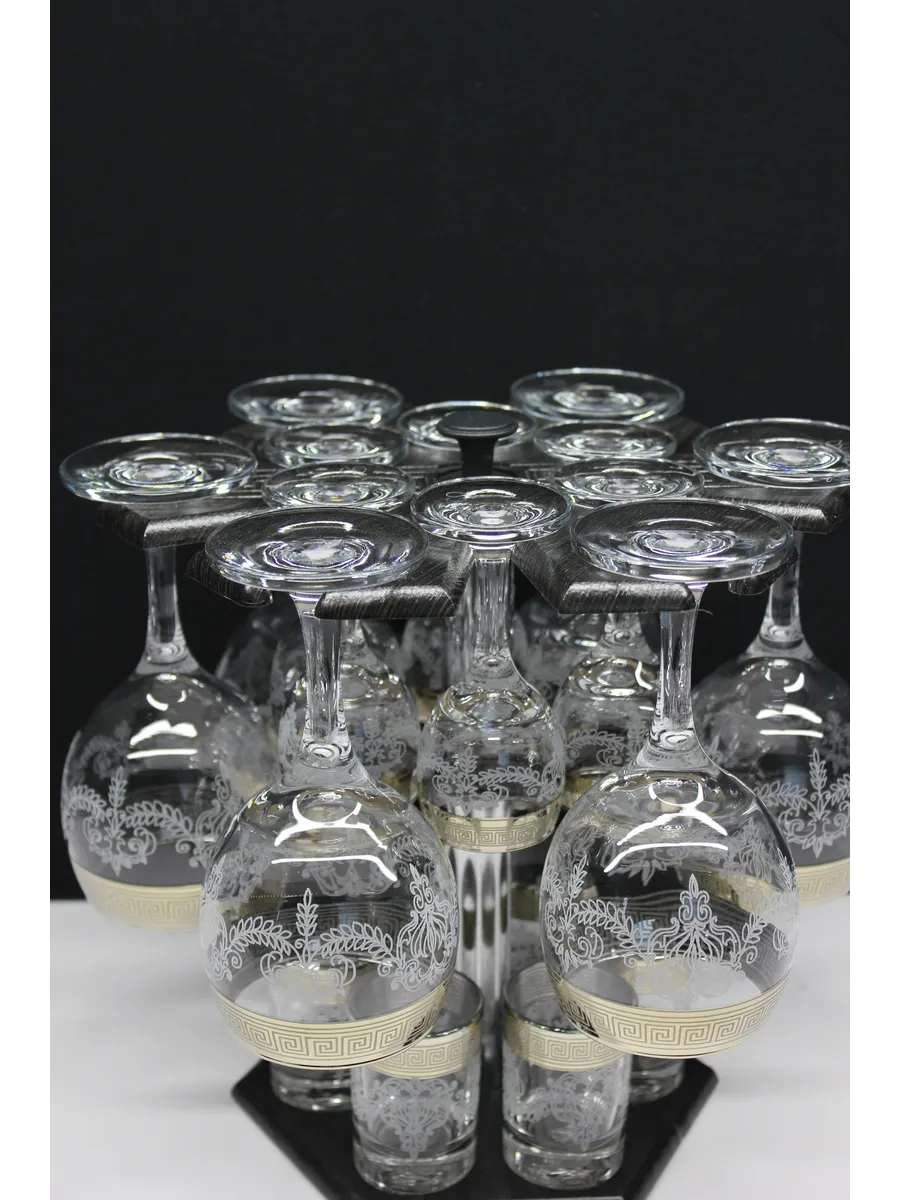 Барный набор "Карусель" 18 предметов из 6 фужеров, 6 рюмок и 6 стопок с гравировкой и золотым напылением на барной стойке из МДФ - это не только функциональная вещь, но и настоящий предмет искусства, который будет радовать глаз и душу на многие годы. Закажите сейчас и наслаждайтесь настоящими напитками в стильном и роскошном дизайне!