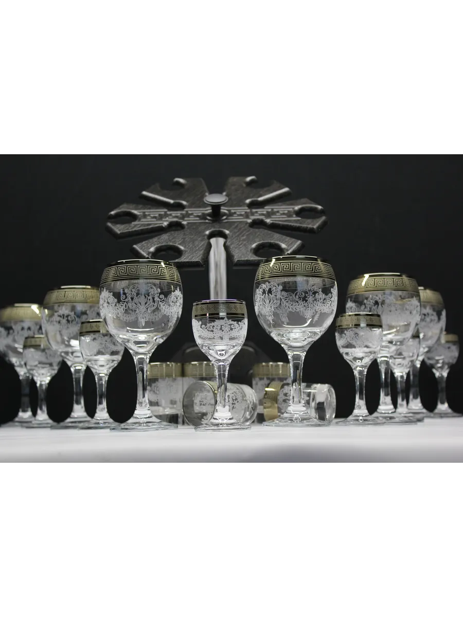 Этот стильный барный набор "Карусель" включает в себя 18 предметов, среди которых 6 фужеров, 6 рюмок и 6 стопок, украшенных гравировкой в стиле барокко и золотым напылением, расположенных на барной стойке из МДФ. Набор изготовлен из высококачественного стекла и МДФ, которые прочны и легко очищаются. Фужеры имеют удобную форму, которая позволяет легко наливать напиток, а их объем позволяет насладиться полной меркой напитка. Рюмки эстетичны к более крепким напиткам. Стопки идеальны для разлива других напитков и смешивания коктейлей.