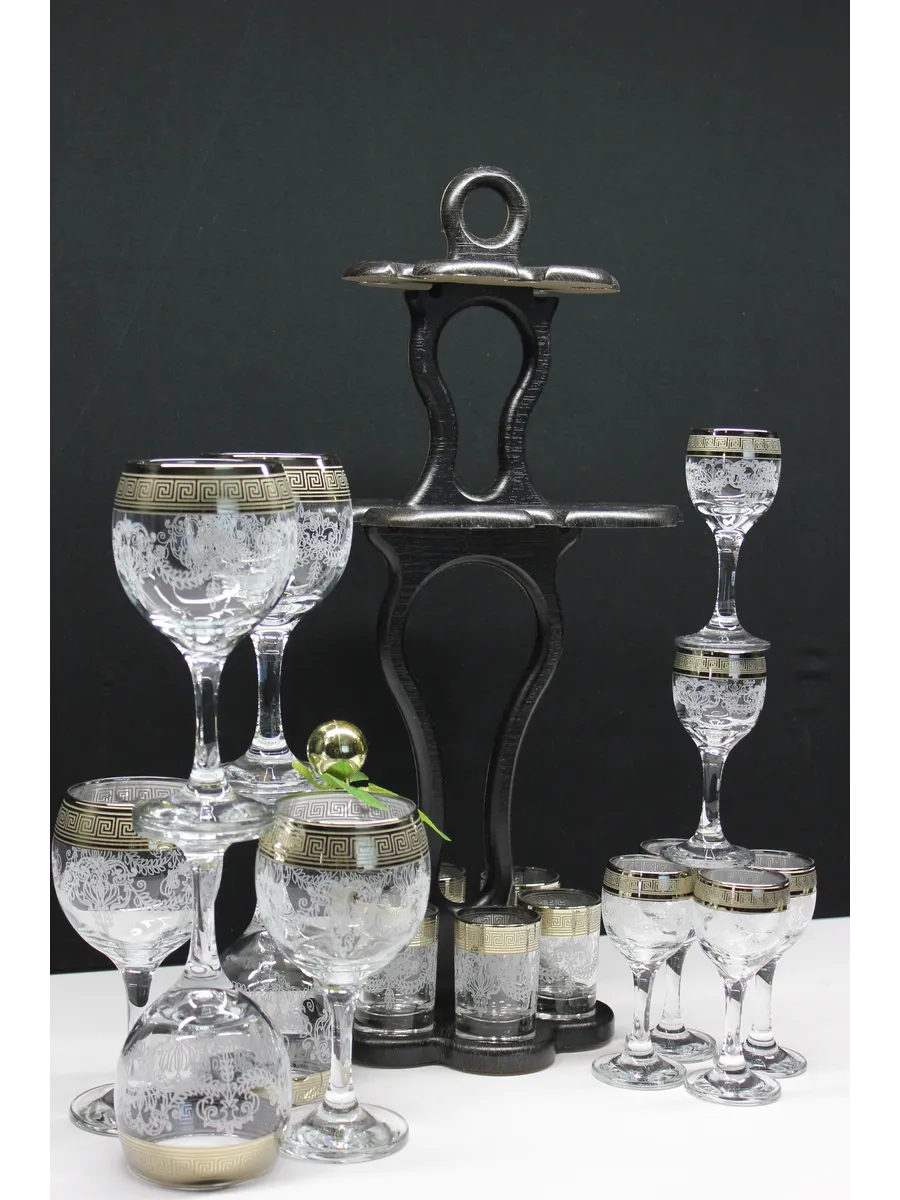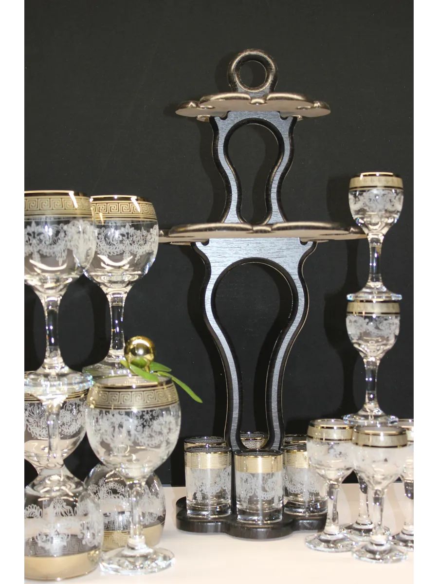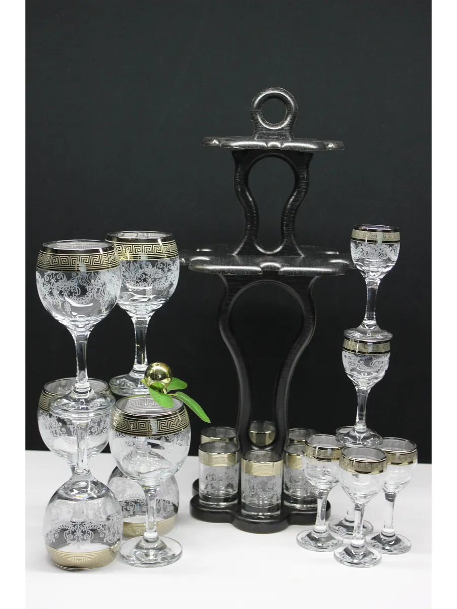 Этот стильный барный набор "Изящный" включает в себя 18 предметов, среди которых 6 фужеров, 6 рюмок и 6 стопок, украшенных гравировкой в стиле барокко и золотым напылением, расположенных на барной стойке из МДФ. Набор изготовлен из высококачественного стекла и МДФ, которые прочны и легко очищаются. Фужеры имеют удобную форму, которая позволяет легко наливать напиток, а их объем позволяет насладиться полной меркой напитка. Рюмки эстетичны к более крепким напиткам. Стопки идеальны для разлива других напитков и смешивания коктейлей.