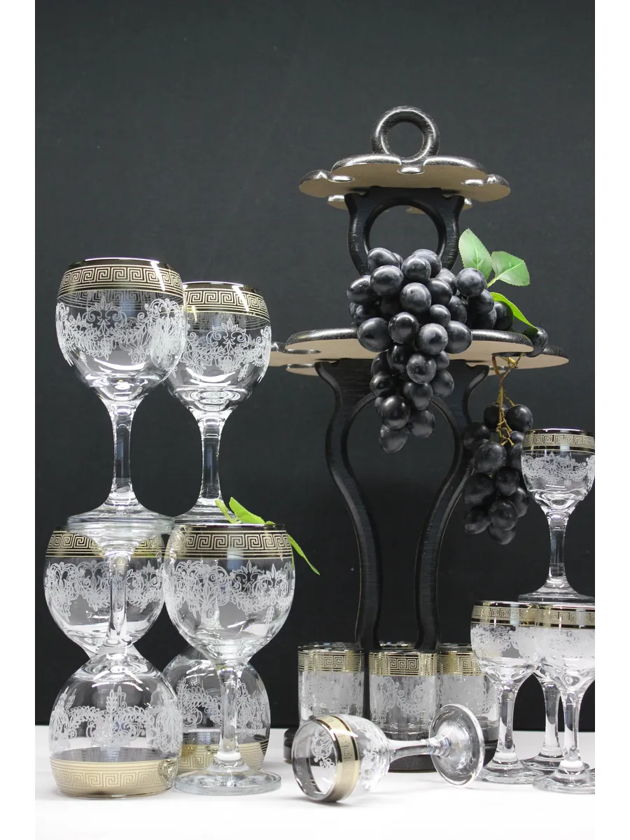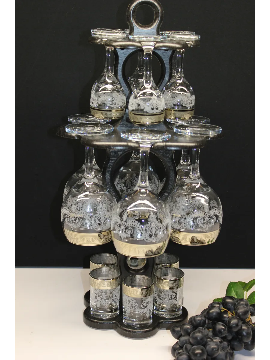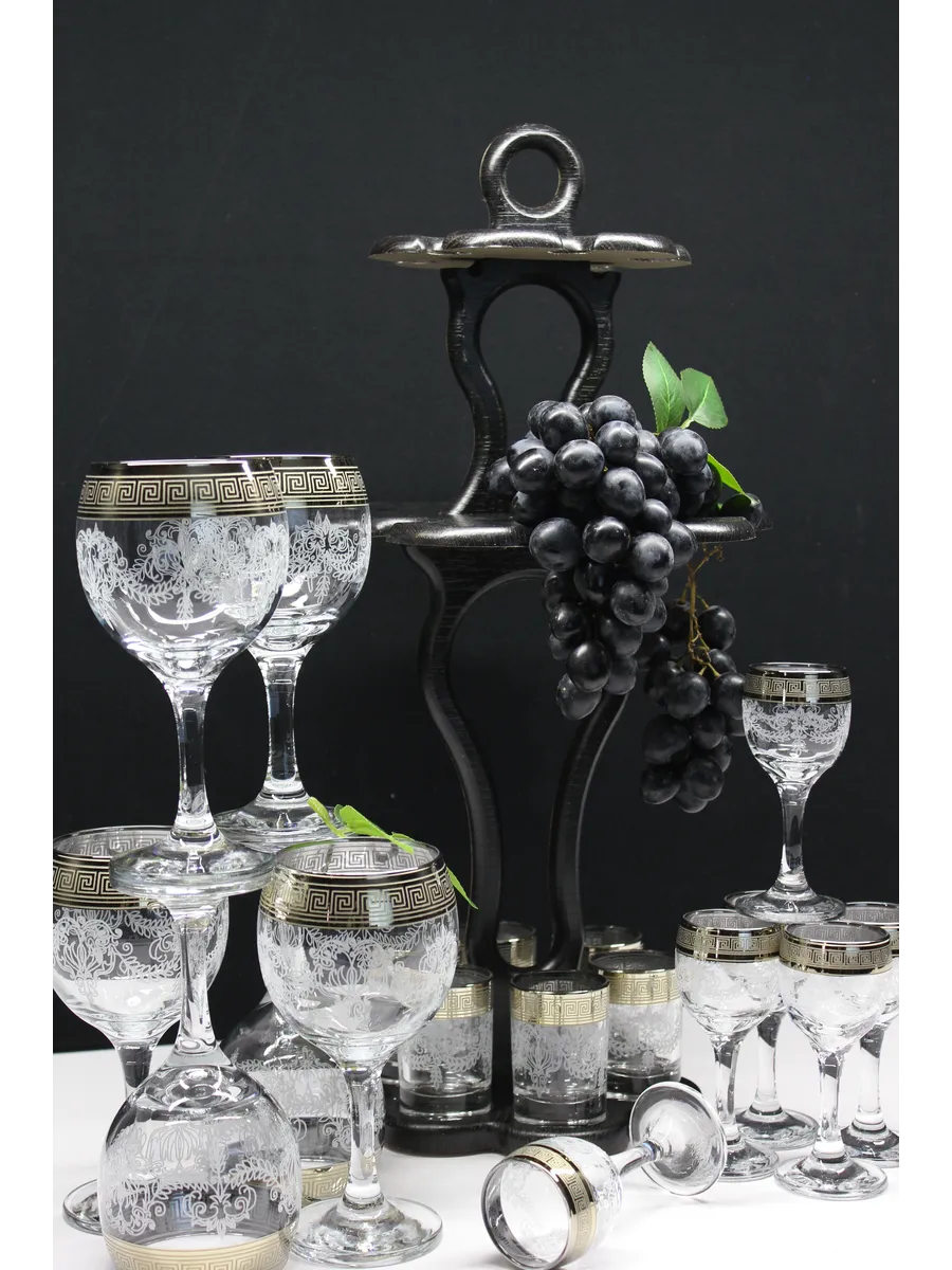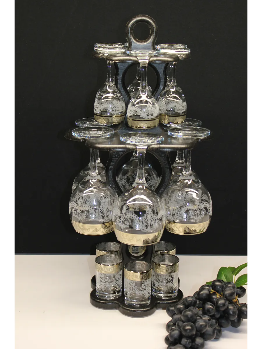 Этот стильный барный набор "Изящный" включает в себя 18 предметов, среди которых 6 фужеров, 6 рюмок и 6 стопок, украшенных гравировкой в стиле барокко и золотым напылением, расположенных на барной стойке из МДФ. Набор изготовлен из высококачественного стекла и МДФ, которые прочны и легко очищаются. Фужеры имеют удобную форму, которая позволяет легко наливать напиток, а их объем позволяет насладиться полной меркой напитка. Рюмки эстетичны к более крепким напиткам. Стопки идеальны для разлива других напитков и смешивания коктейлей.