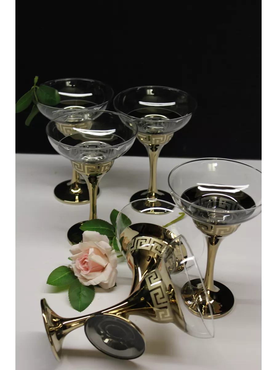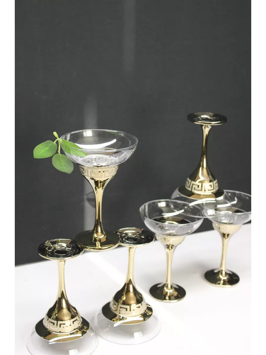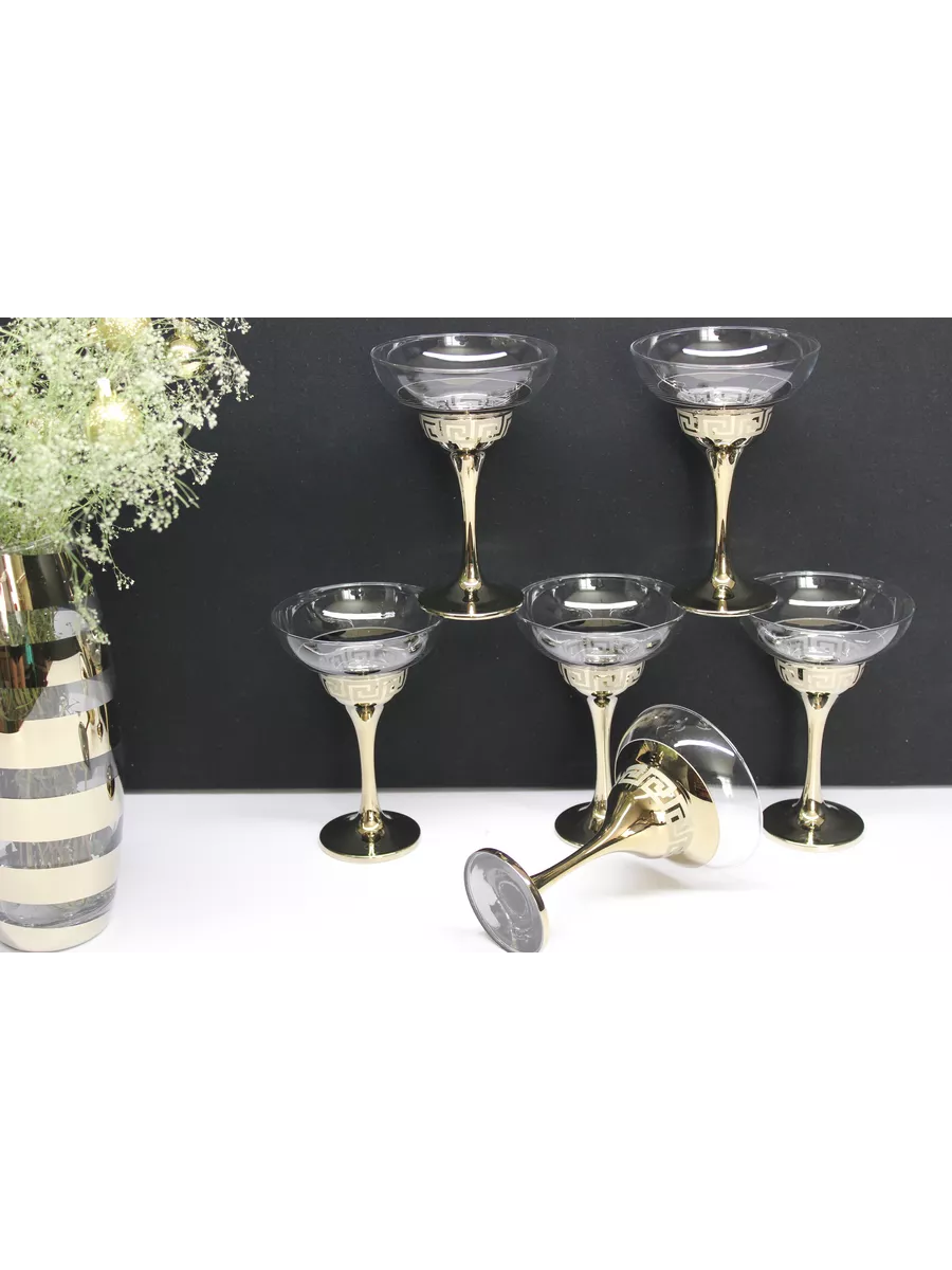 На каждом бокале изображен рисунок, выполненный с помощью гравировки и золотого напыления. Этот рисунок придает бокалам оригинальный и роскошный вид, который будет выглядеть отлично на любом столе. Золотое напыление создает эффектный контраст со стеклом и придает бокалам изысканный вид.