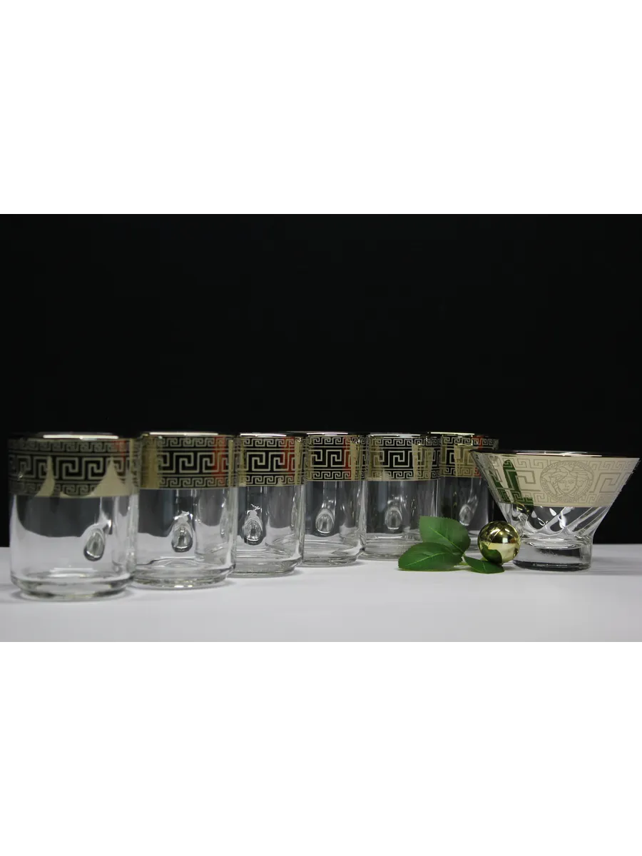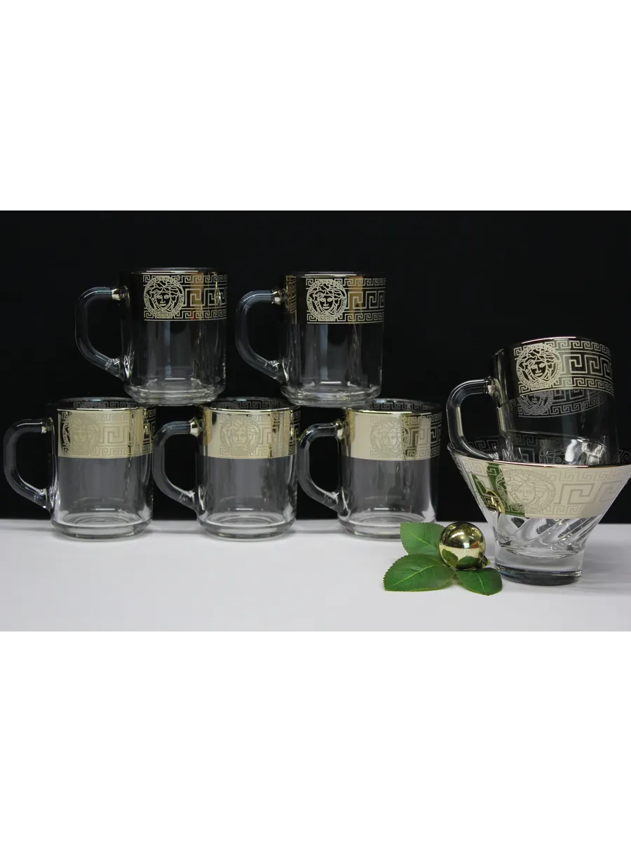 Подарочный набор "Версаче" состоит из 6 кружек и креманки. Набор выполнен из декорированного высококачественного стекла. Такой набор прекрасно подойдет как для повседневного использования, так и для праздников или особенных случаев. Изящные изделия прекрасно дополнят сервировку любого стола и станут эффектным аксессуаром в вашем интерьере.Предназначены для чая, кофе и других напитков. Набор изготовлены в узоре «Версаче», имеет алмазную гравировку и напыление, а цвет золотом придает изделию особый шарм.Кружки и криманка с рисунком не рекомендуется мыть при помощи жестких абразивных моющих средств и подвергать длительному воздействию солнечных лучей.Их не рекомендуют использовать в СВЧ-печи и посудомоечной машине. Набор поставляется в стильной подарочной упаковке и станет отличным подарком к любому празднику.