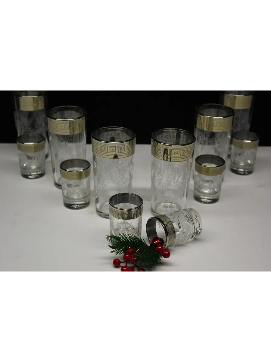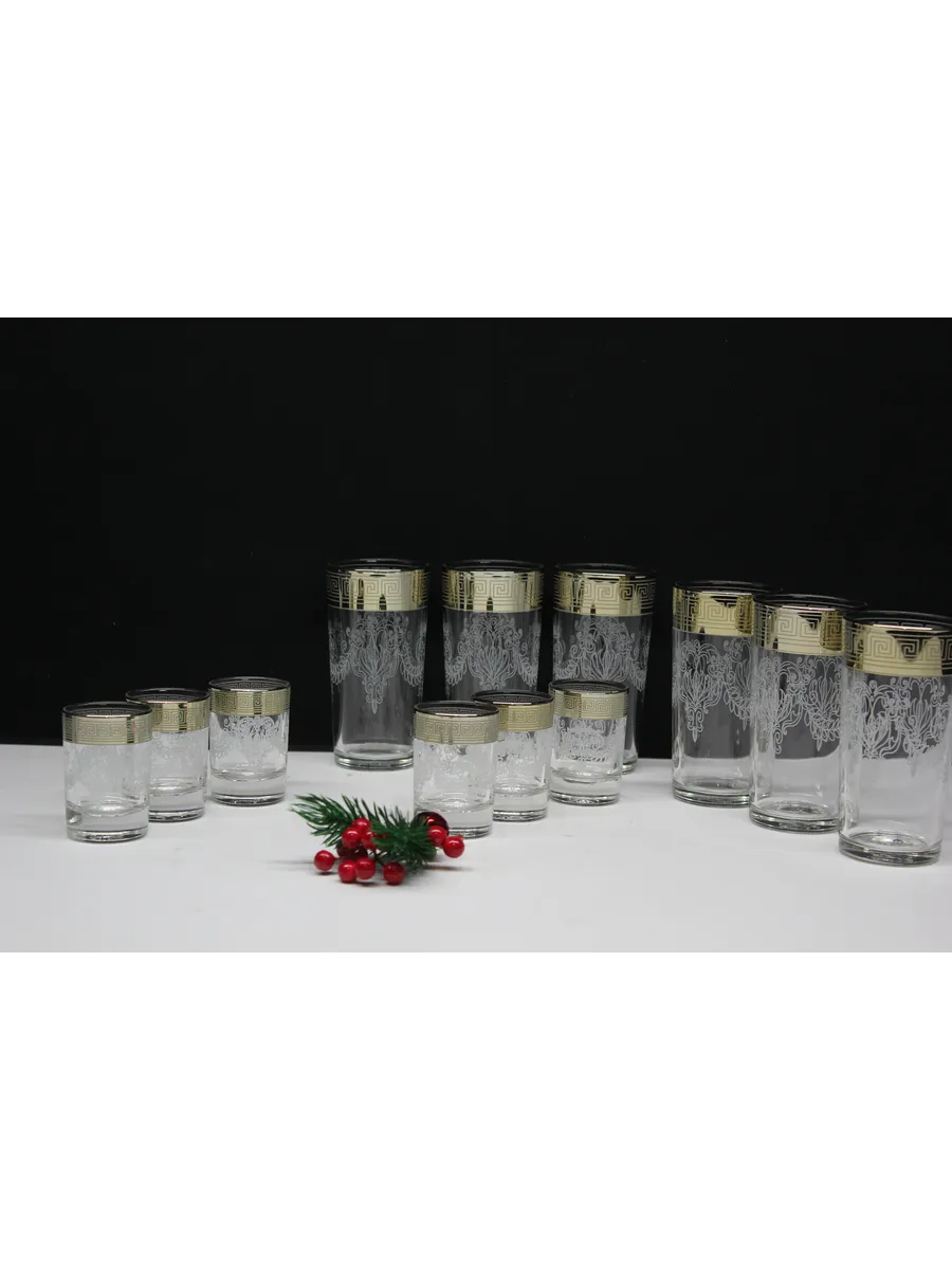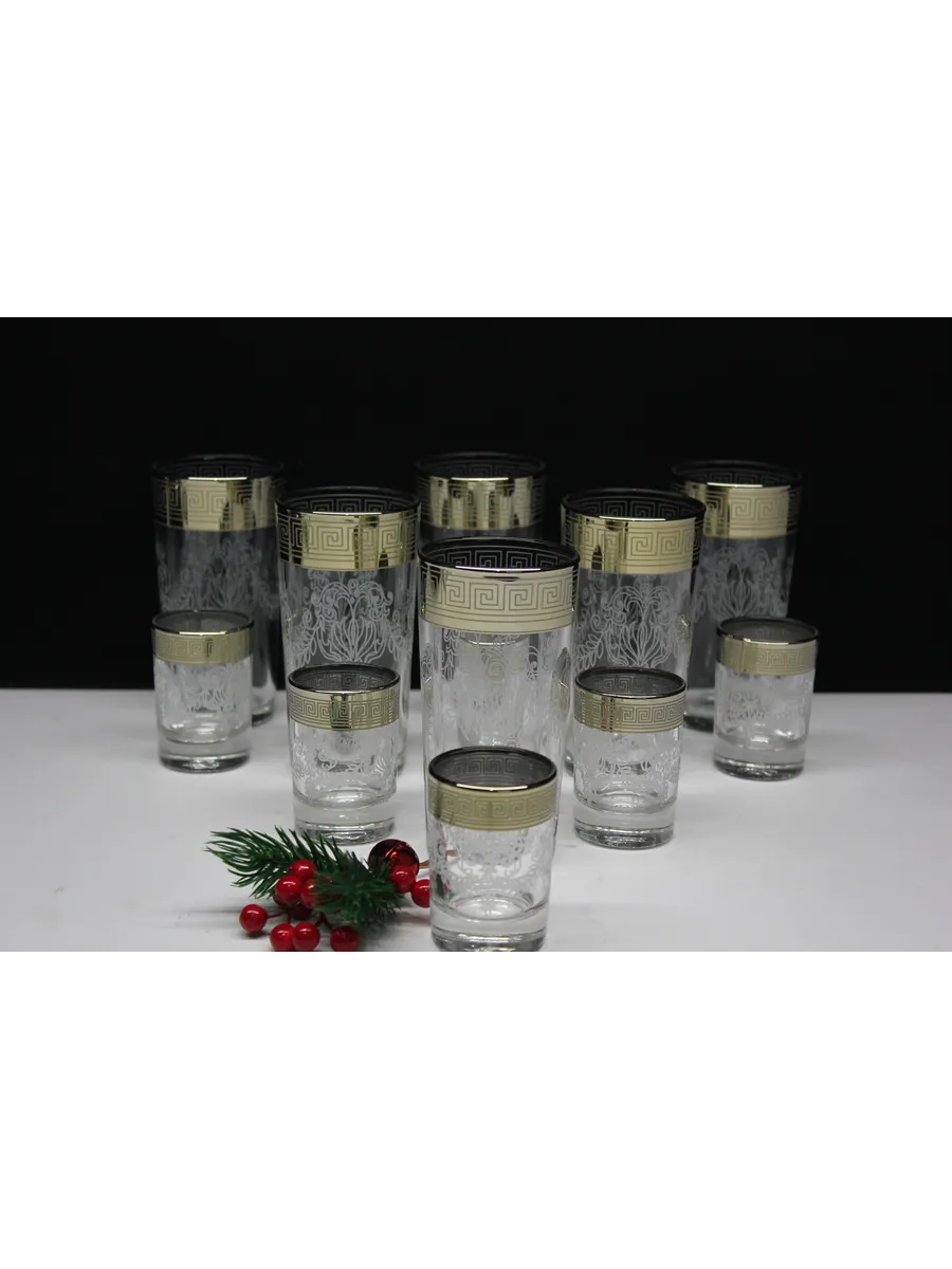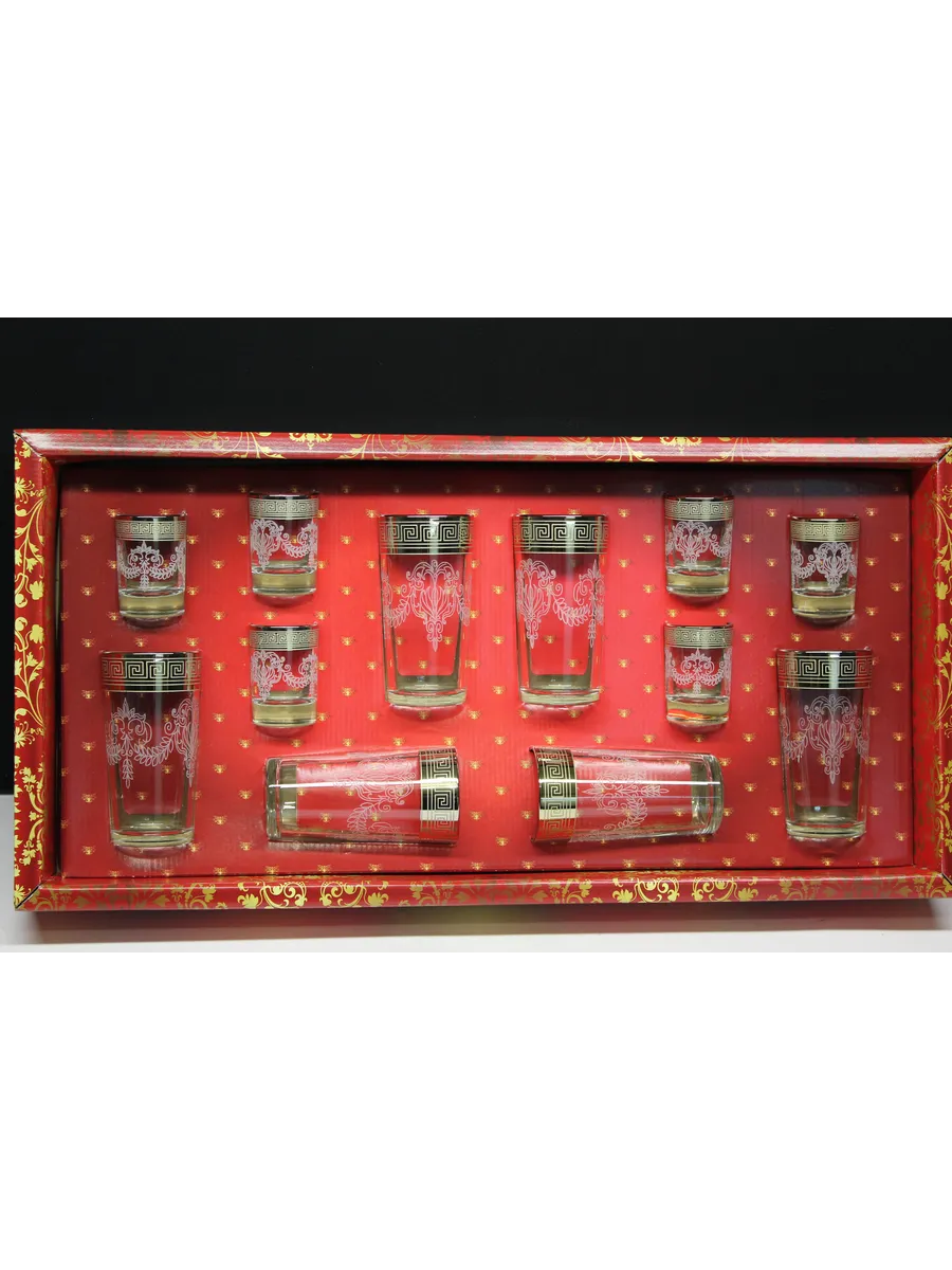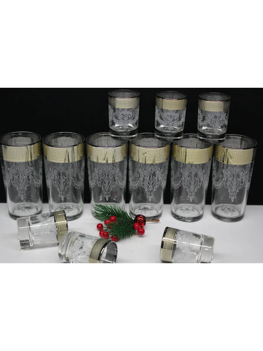 Подарочные стаканы, стопки станут замечательным презентом на любое торжество.Каждый предмет набора изготовлен из прочного стекла и обладает красивой формой, которая придает ему дополнительный шик. Но главным элементом дизайна являются рисунок цветов и золотое напыление, которыми украшен каждый стакан и стопка. Мягкие и изящные линии рисунка замечательно сочетаются с блеском стаканов и стопок создают неповторимый эффект. Этот набор станет отличным подарком для тех, кто ценит красоту, изысканность и гармонию во всем. Он также подойдет для оформления свадебного стола или другого торжества. Набор подарочный "Барокко" — это не просто элемент сервировки стола, это настоящее произведение искусства, где каждый стакан и стопка станет символом роскоши и изысканности.