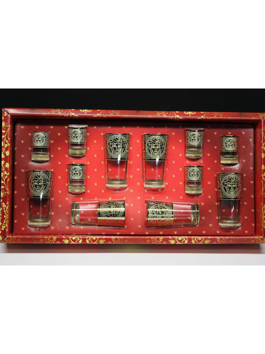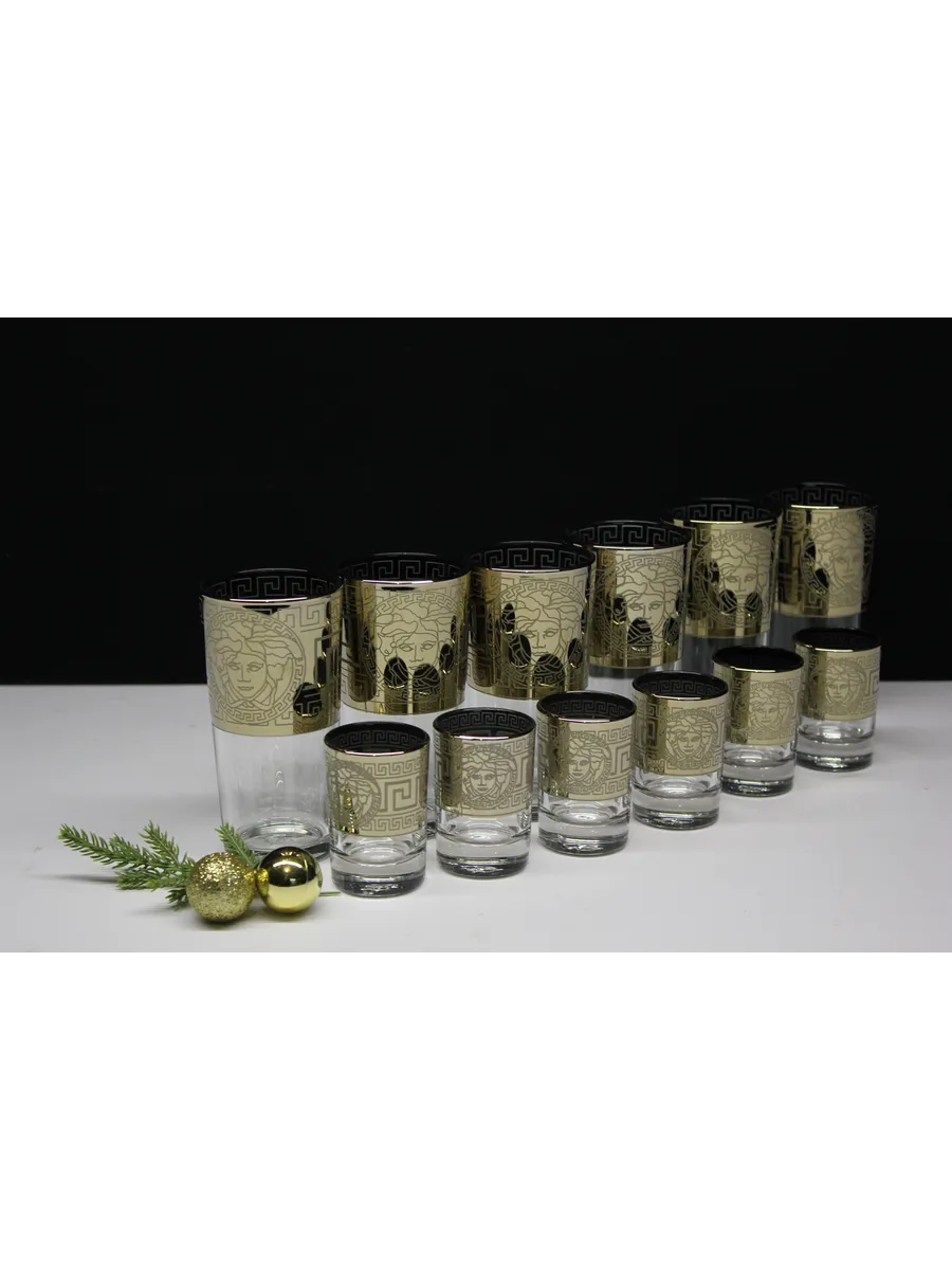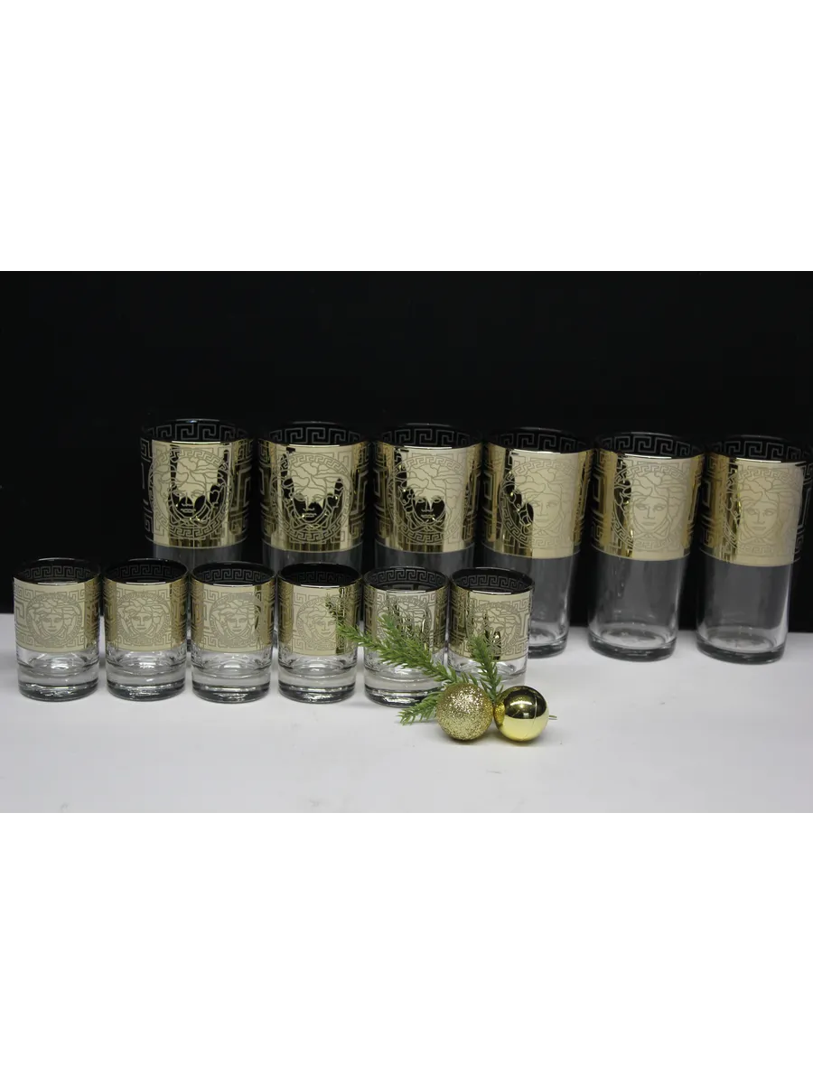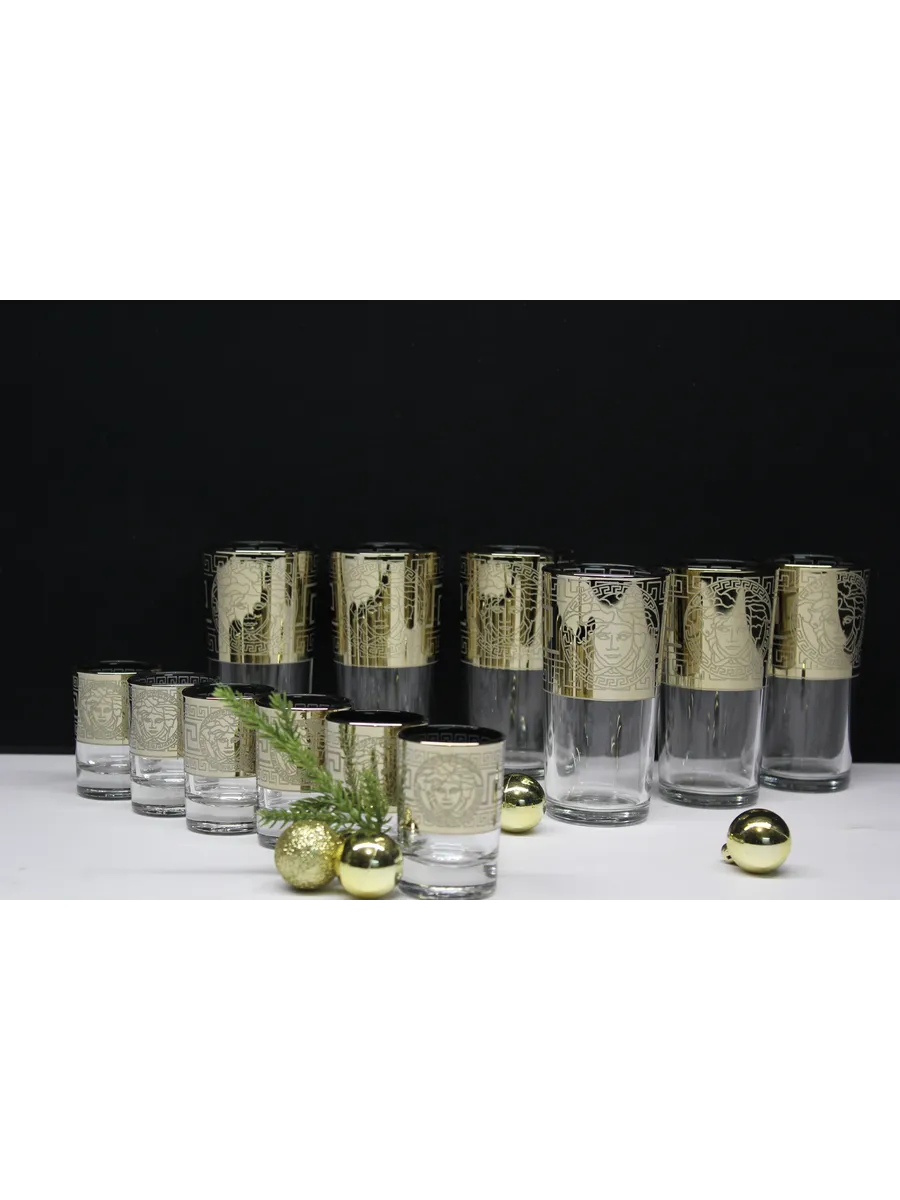 Подарочные стаканы, стопки станут замечательным презентом на любое торжество.Каждый предмет набора изготовлен из прочного стекла и обладает красивой формой, которая придает ему дополнительный шик. Но главным элементом дизайна являются рисунок цветов и золотое напыление, которыми украшен каждый стакан и стопка. Мягкие и изящные линии рисунка замечательно сочетаются с блеском стаканов и стопок создают неповторимый эффект. Этот набор станет отличным подарком для тех, кто ценит красоту, изысканность и гармонию во всем. Он также подойдет для оформления свадебного стола или другого торжества. Набор подарочный "Версаче" — это не просто элемент сервировки стола, это настоящее произведение искусства, где каждый стакан и стопка станет символом роскоши и изысканности.
