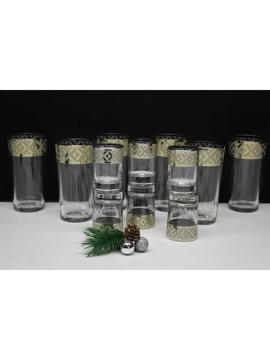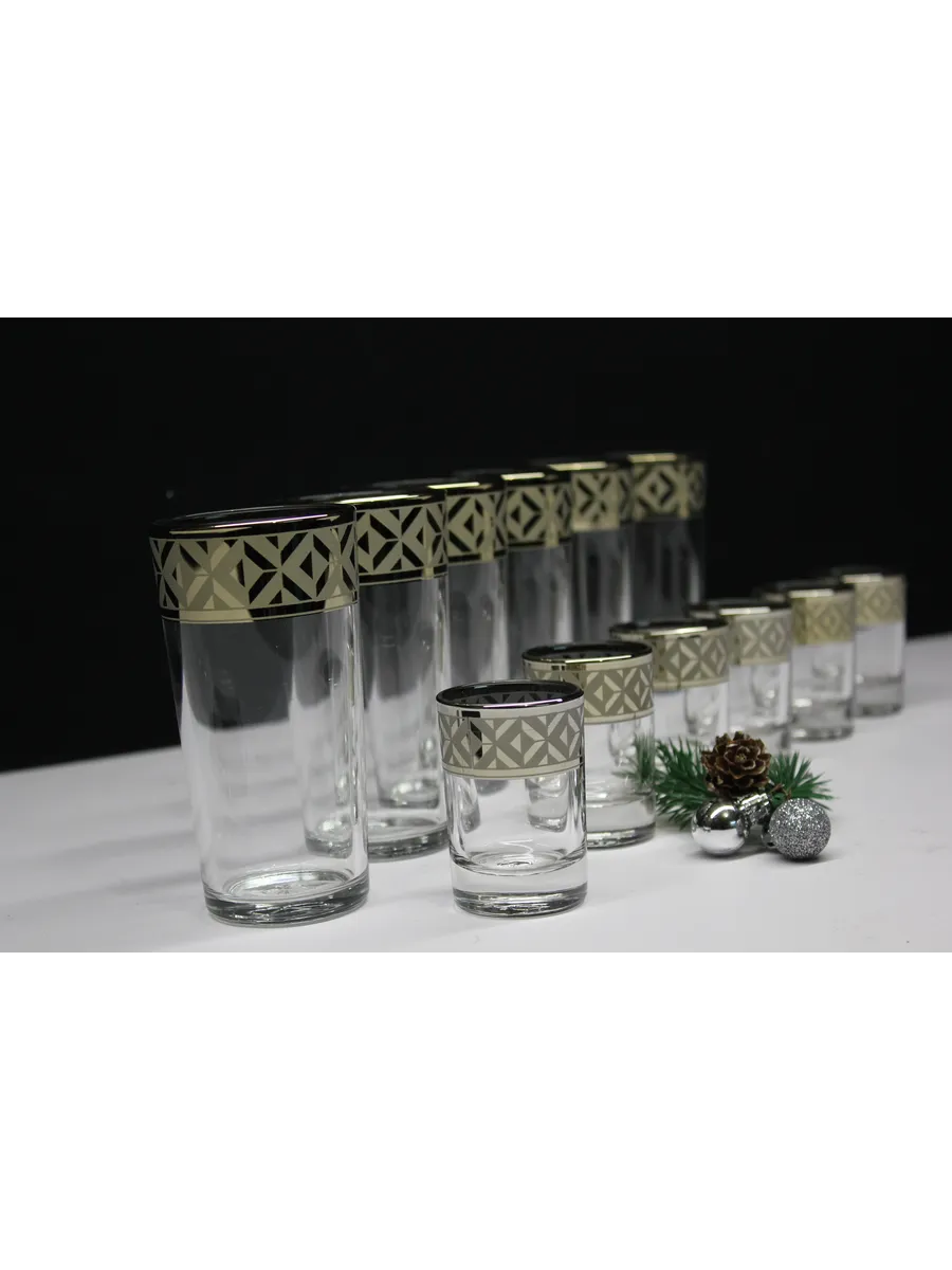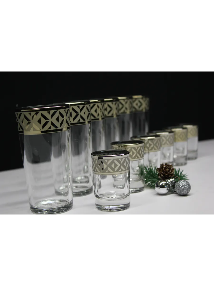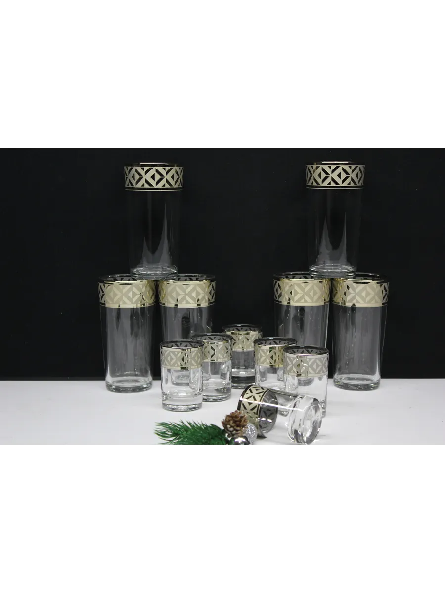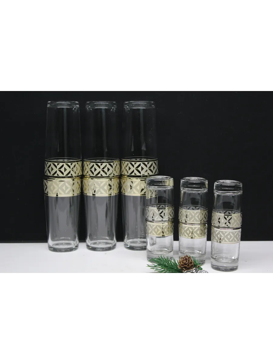 Подарочные стаканы, стопки станут замечательным презентом на любое торжество.Каждый предмет набора изготовлен из прочного стекла и обладает красивой формой, которая придает ему дополнительный шик. Но главным элементом дизайна являются рисунок цветов и золотое напыление, которыми украшен каждый стакан и стопка. Мягкие и изящные линии рисунка замечательно сочетаются с блеском стаканов и стопок создают неповторимый эффект. Этот набор станет отличным подарком для тех, кто ценит красоту, изысканность и гармонию во всем. Он также подойдет для оформления свадебного стола или другого торжества. Набор подарочный "Геометрия" — это не просто элемент сервировки стола, это настоящее произведение искусства, где каждый стакан и стопка станет символом роскоши и изысканности.