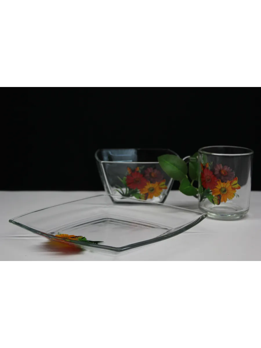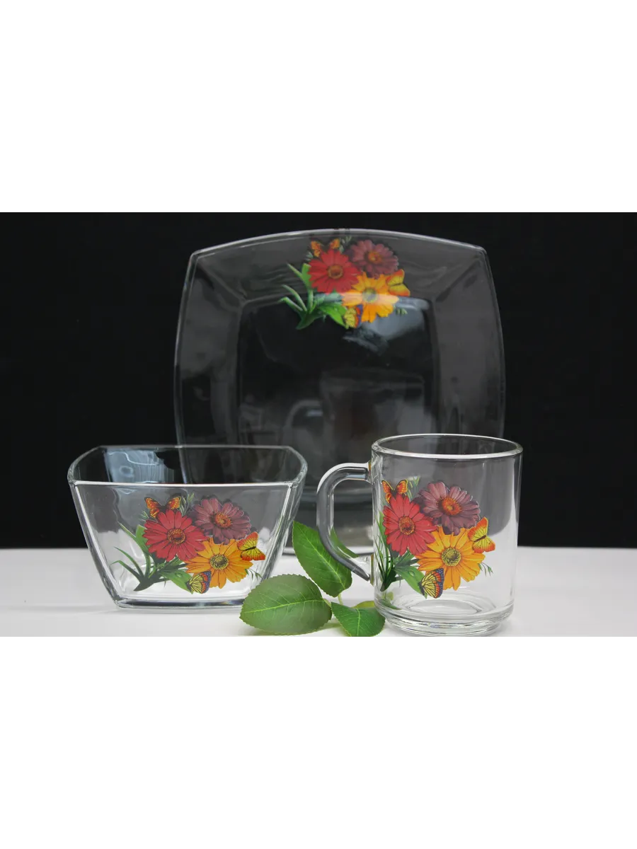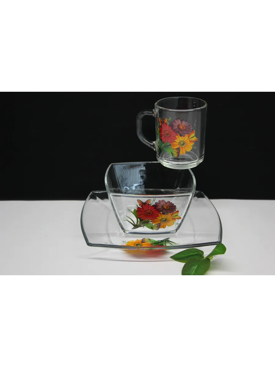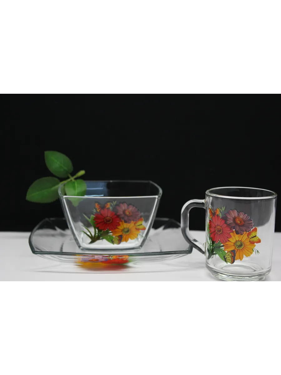 Этот стильный и экологичный набор для завтрака из высококачественного стекла включает кружку, тарелку и салатник с милыми герберами. Яркий и уютный дизайн поднимет вам настроение ранним утром и подарит заряд энергии на весь день. Материал: Экологичное и прочное стекло, обеспечивающее долговечность и безопасность.