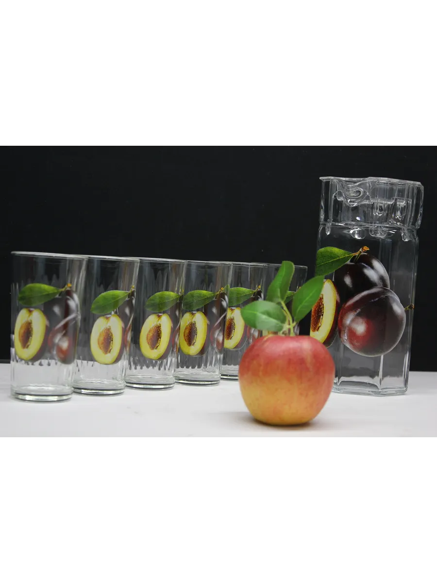 Этот изысканный набор "Спелая Слива" включает кувшин объемом 1250 мл и 6 стаканов по 250 мл, украшенных декором спелой сливы, с зелеными листочками. Подарочная упаковка делает его идеальным подарком для любителей стиля и уюта.