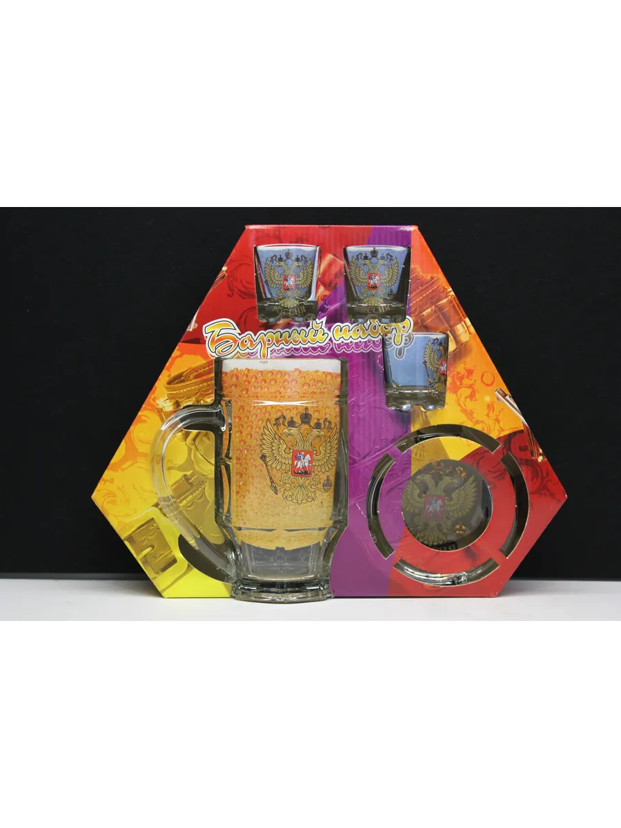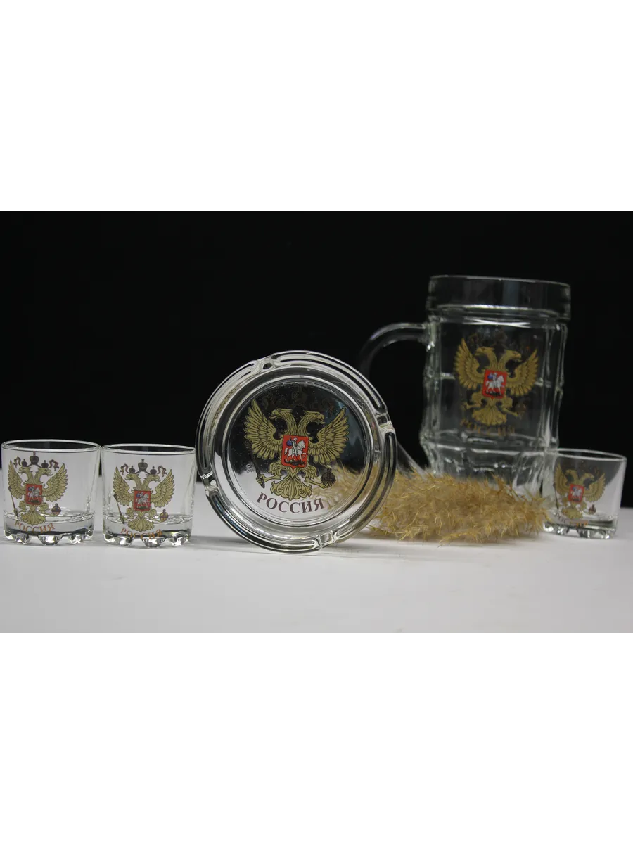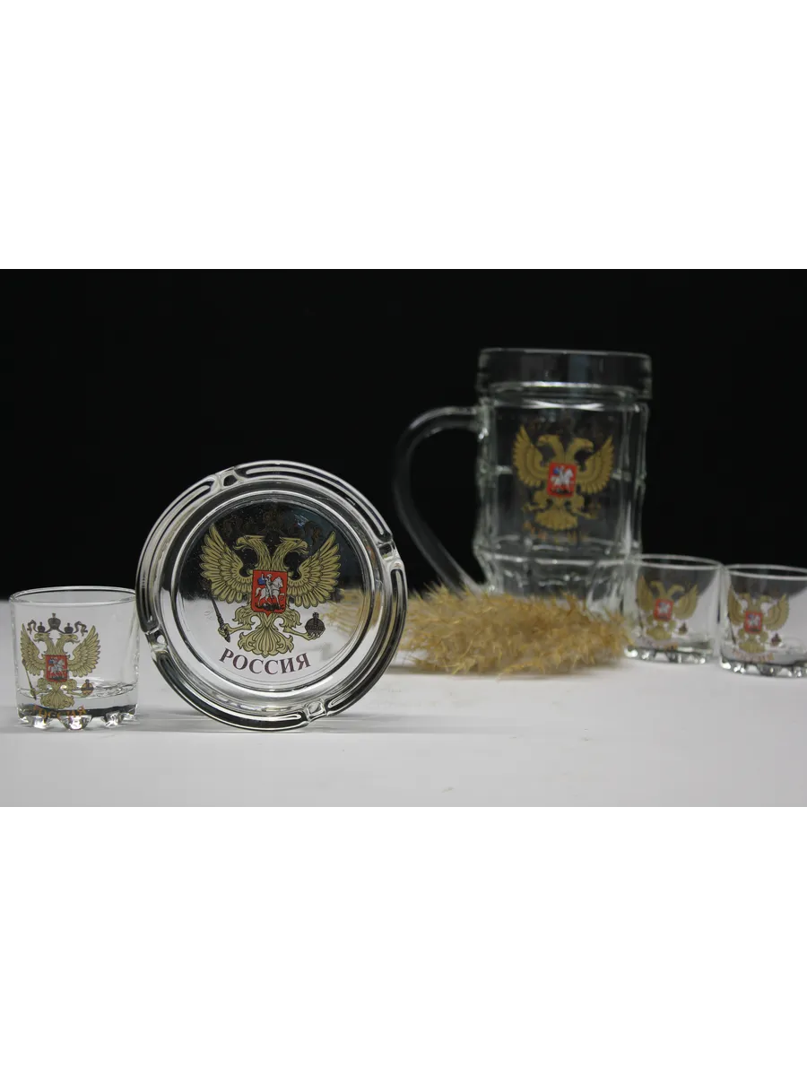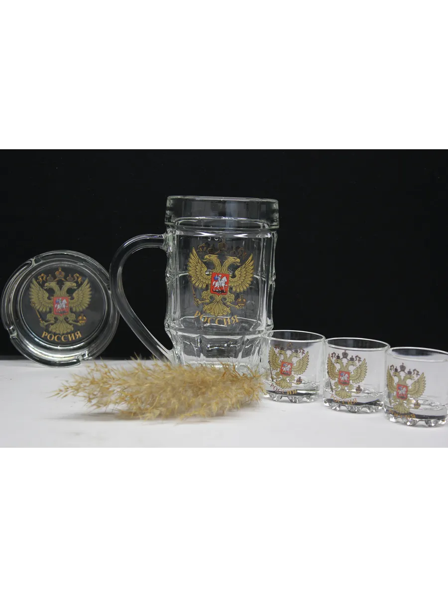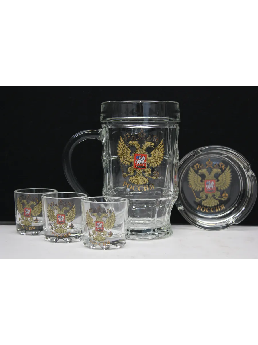 Брутальный Набор "Патриот": Пивная Кружка, Три Стопки и Пепельница с Деколью Российского Герба.