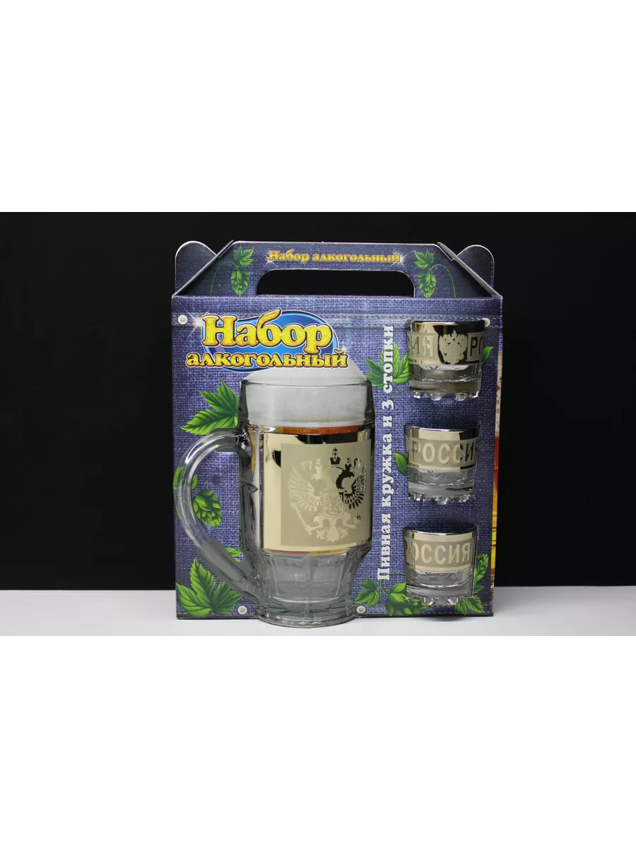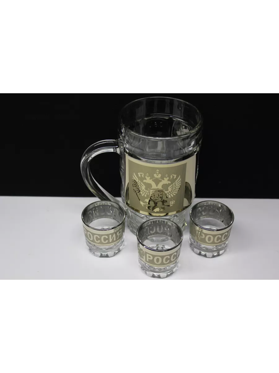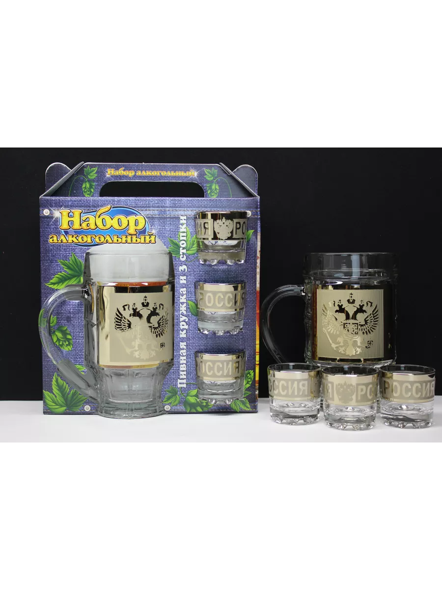 Барный набор в подарок мужчине – пивная кружка и стопки. Все предметы набора выполнены из прозрачного стекла и украшены гравировкой золотом. Далеко не все знают, что и водку, и пиво принято наливать в прозрачную посуду, чтобы подчеркнуть чистоту напитка. Купить пивную кружку и стопки на подарок. Все товары представленные в каталоге интернет-магазина соответствуют изображению и техническим характеристикам, указанным в карточке