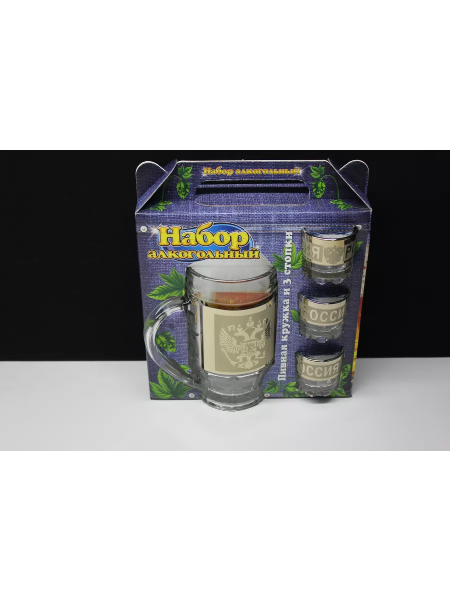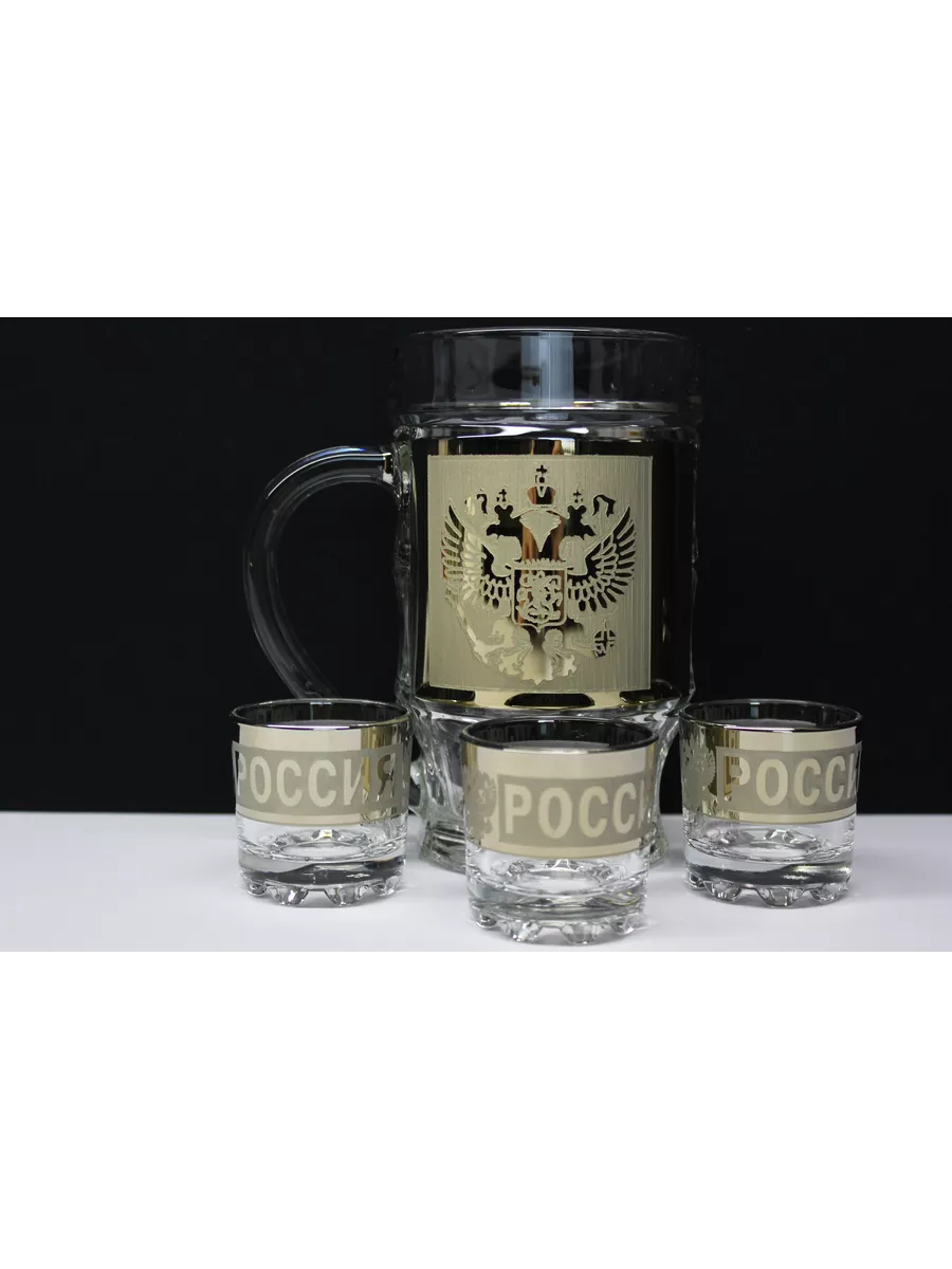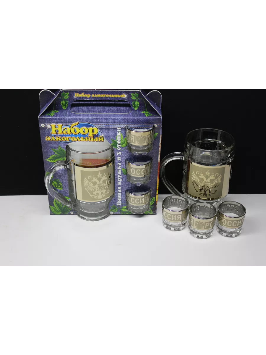 Барный набор в подарок мужчине – пивная кружка и стопки. Все предметы набора выполнены из прозрачного стекла и украшены гравировкой золотом. Далеко не все знают, что и водку, и пиво принято наливать в прозрачную посуду, чтобы подчеркнуть чистоту напитка. Купить пивную кружку и стопки на подарок. Все товары представленные в каталоге интернет-магазина соответствуют изображению и техническим характеристикам, указанным в карточке