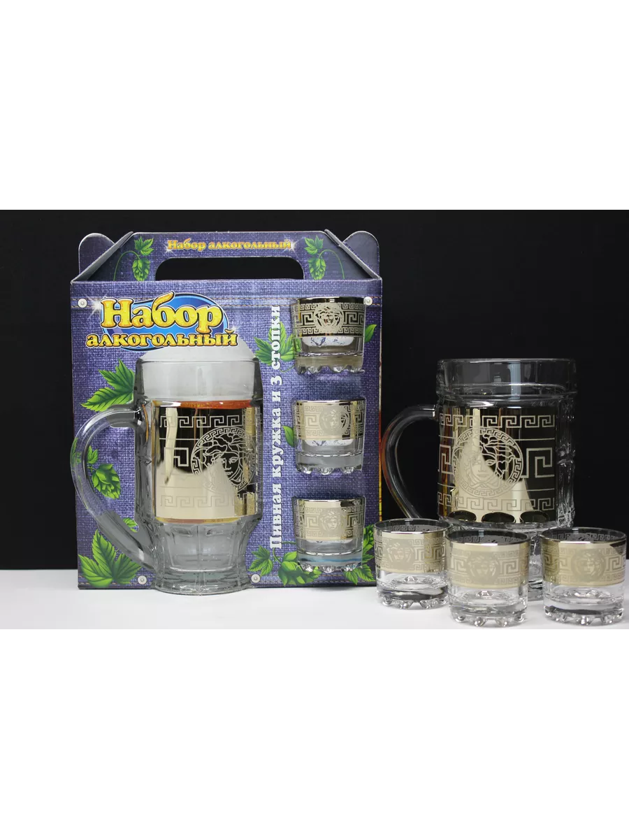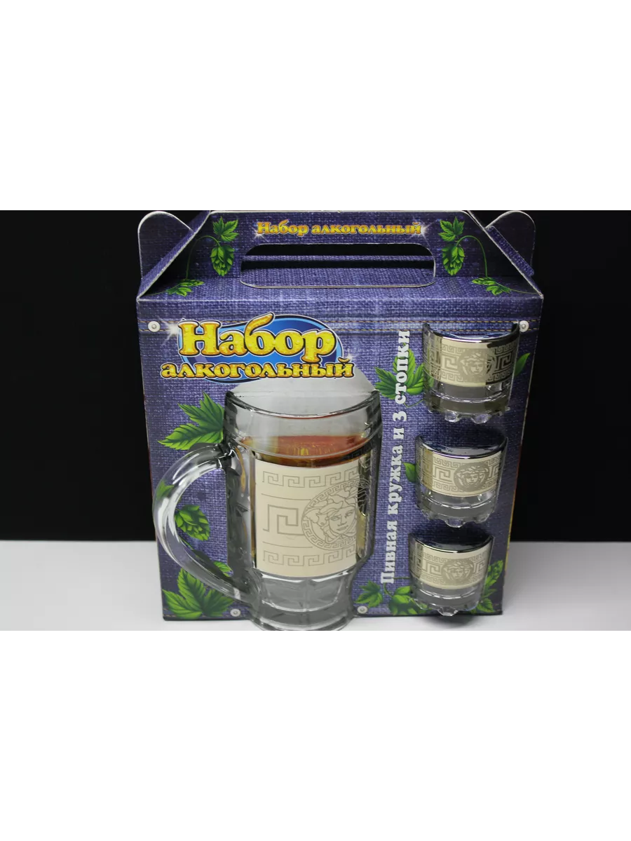 Барный набор в подарок мужчине – пивная кружка и стопки Все предметы набора выполнены из прозрачного стекла и украшены гравировкой золотом. Далеко не все знают, что и водку, и пиво принято наливать в прозрачную посуду, чтобы подчеркнуть чистоту напитка. Купить пивную кружку и стопки на подарок. Все товары представленные в каталоге интернет-магазина соответствуют изображению и техническим характеристикам, указанным в карточке