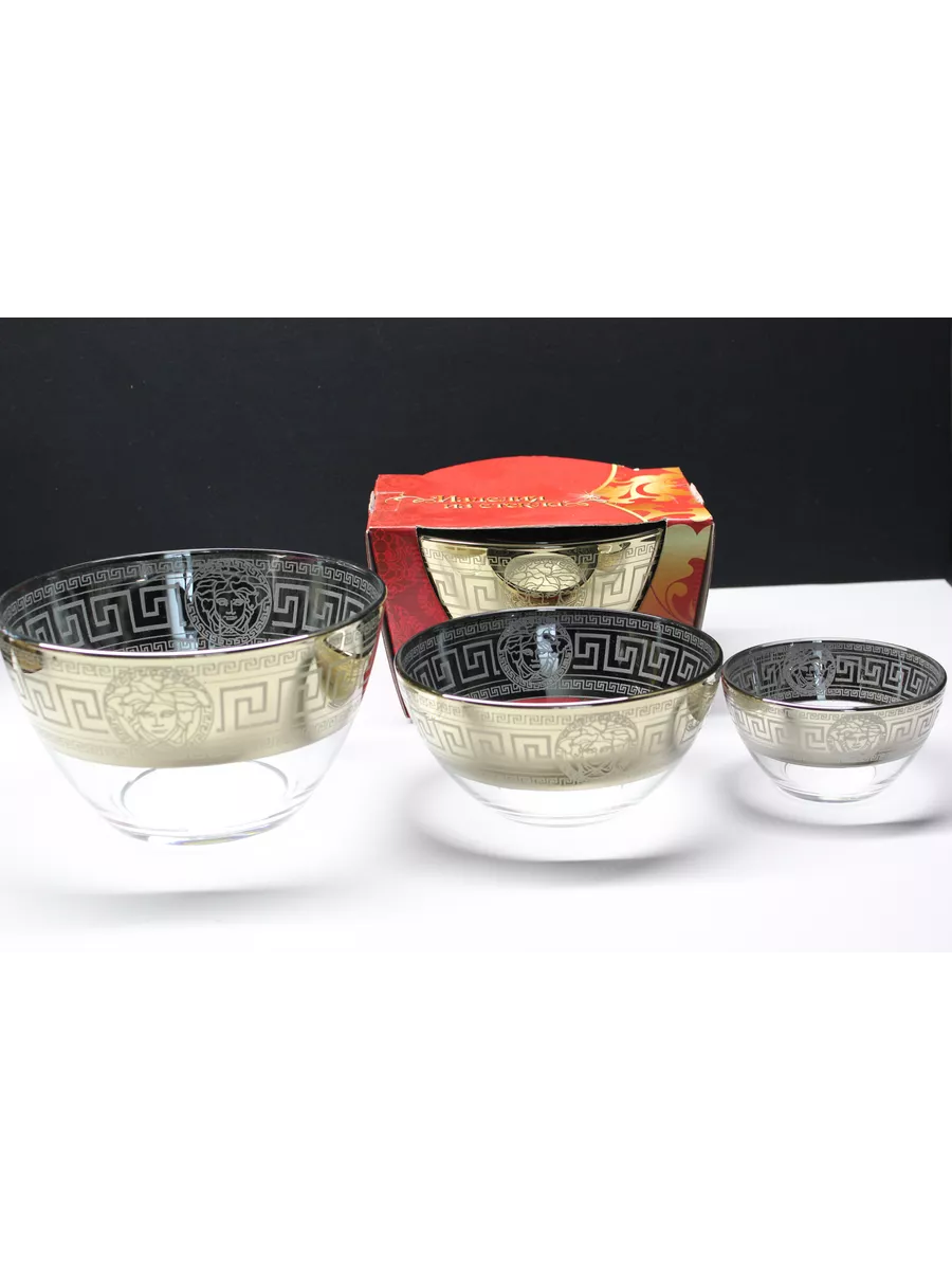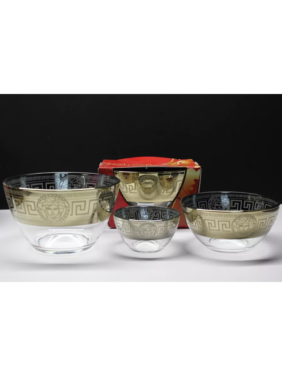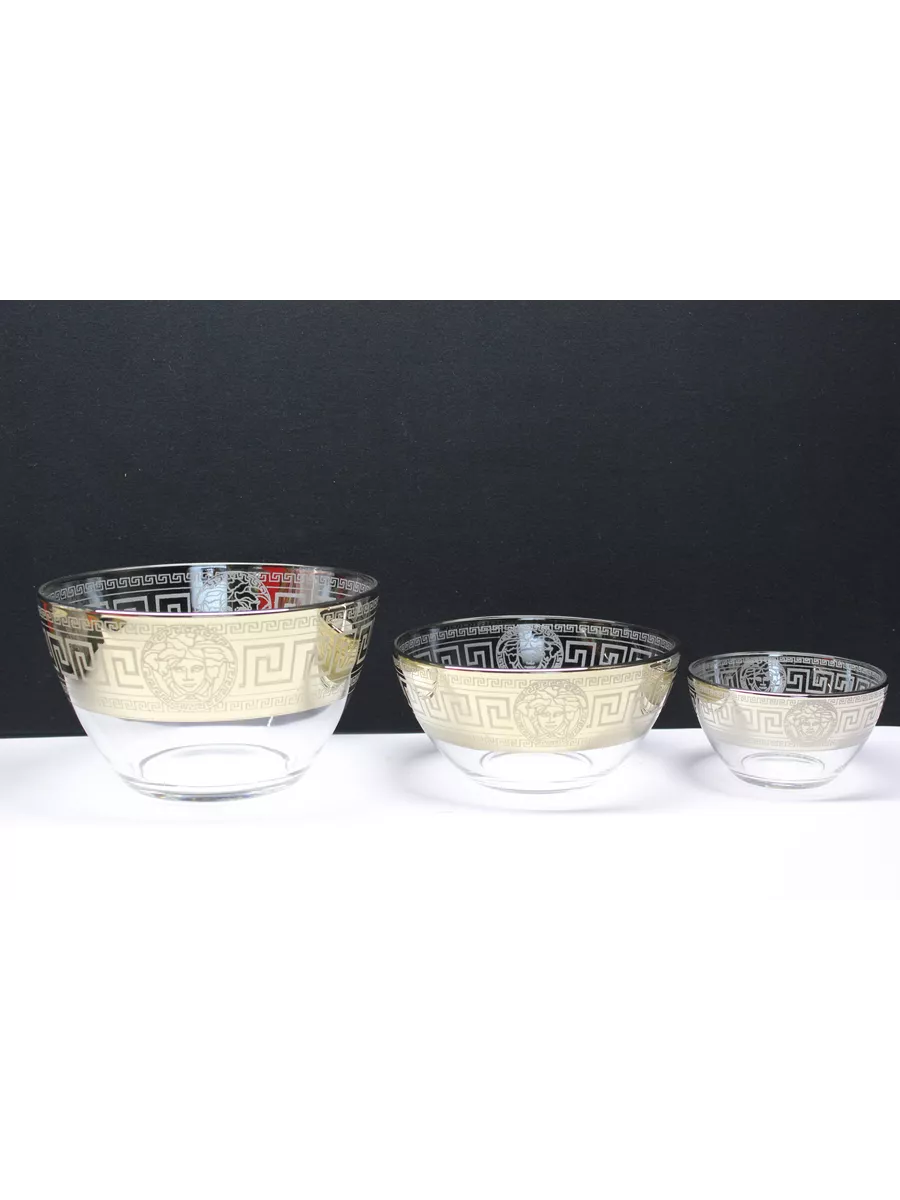 Невозможно представить без салата не только праздничный стол, но и сервировку на каждый день. Круглые стеклянные салатники изготовлены из высококачественного стекла, декорированного узором. Классическая форма и изысканный декор, наполненный изяществом, подчеркивают особую индивидуальность посуды. Прекрасно подходят для подачи на стол салатов, сыра, фруктов, овощей и различных блюд. Посуду можно использовать не только для сервировки, но и как элемент украшения интерьера. Придадут столу нарядный вид и поднимут настроение вам и вашим гостям. В набор «Версаче»входит: салатники 3 штуки , большой 1700мл, средний 600мл и маленький 250мл.