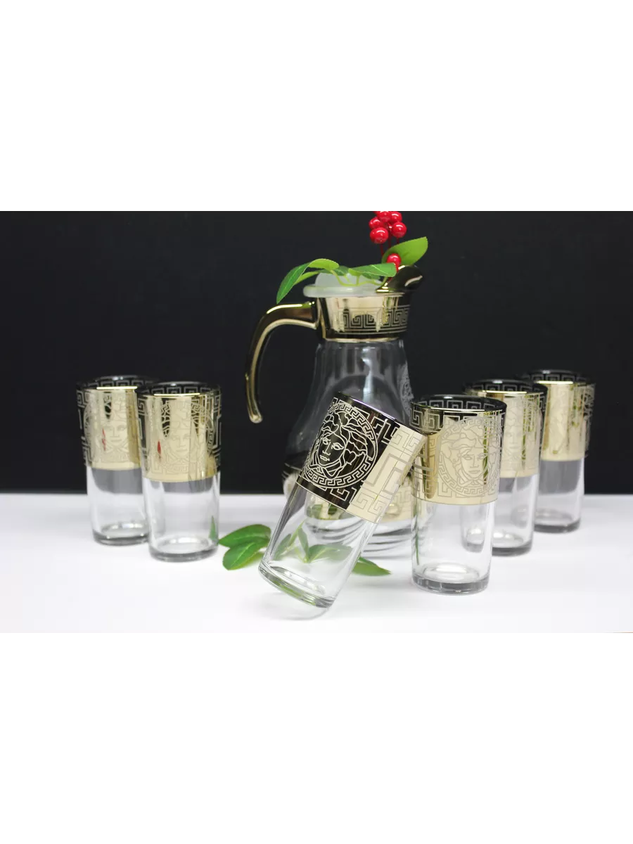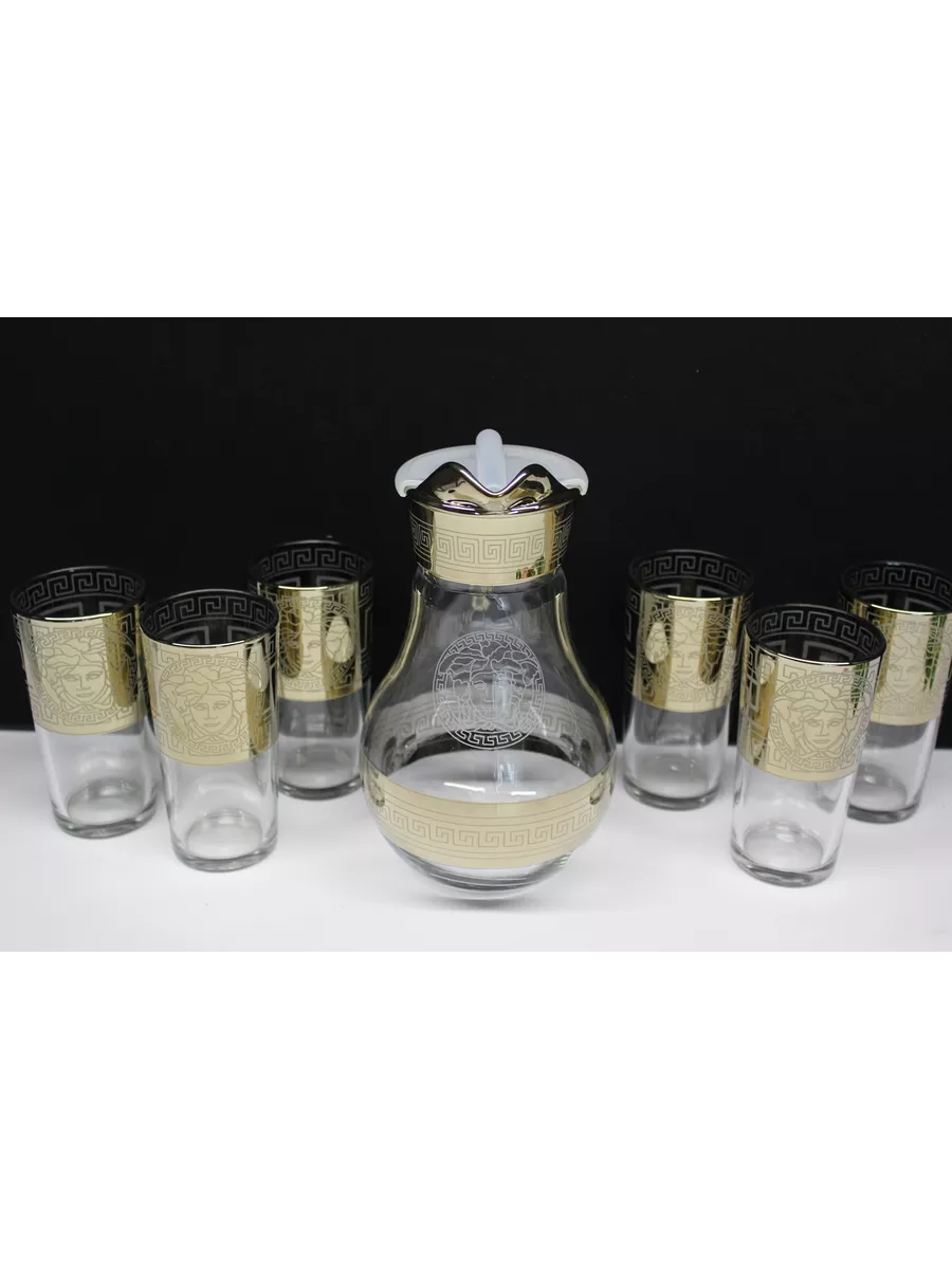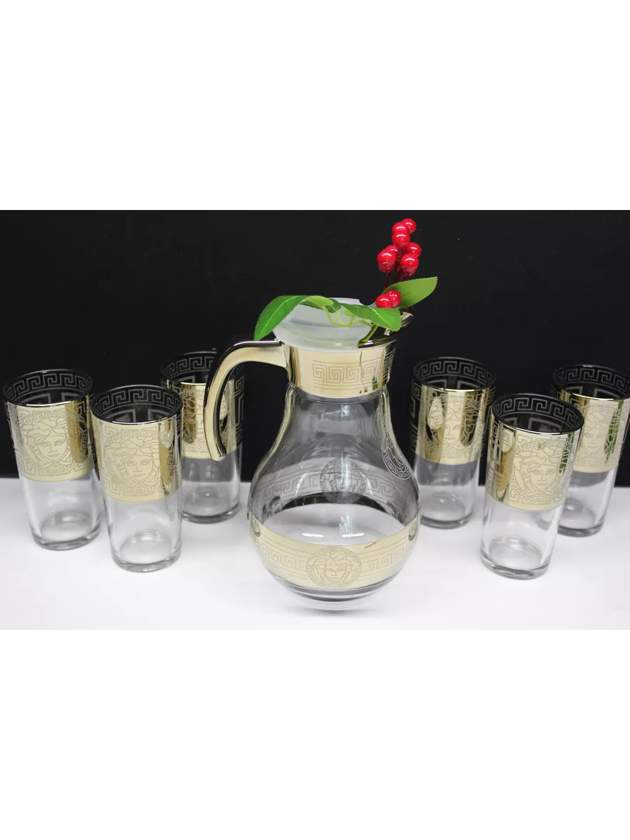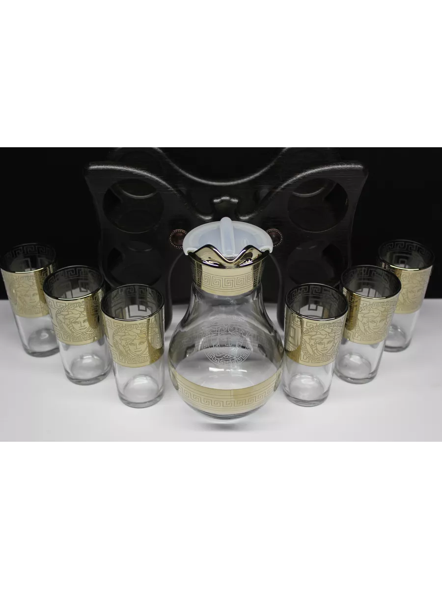 Кувшин для воды 1000 мл с крышкой и стеклянные стаканы 6 шт на барной стойке из коллекции"Версаче" – отличный набор для дома, выполнен из прочного качественного стекла с алмазной гравировкой. Он подойдет как к повседневному, так и торжественному столу. Благодаря своей универсальности декоративная посуда станет идеальным выбором для сервировки стола на любом празднике. Кувшин стеклянный со стаканами - это качественная посуда для сервировки, предназначен для любых напитков: воды и сока, лимонада и компота, молока и коктейлей. Кувшин и стаканы на барной стойке - это комплект, необходимый каждой семье, прослужат вам долго и обеспечат свой первоначальный вид. Набор посуды для сервировки в праздничной подарочной упаковке – это полезный красивый подарок на любой праздник. Приобретая его, вы не только получаете качественный товар, но и стильный элемент декора для вашего дома. И если вы не можете определиться с новогодним подарком или подарком на день рождения и другие праздники, то универсальный решением будет наш подарочный набор кувшин и стаканы на баре.