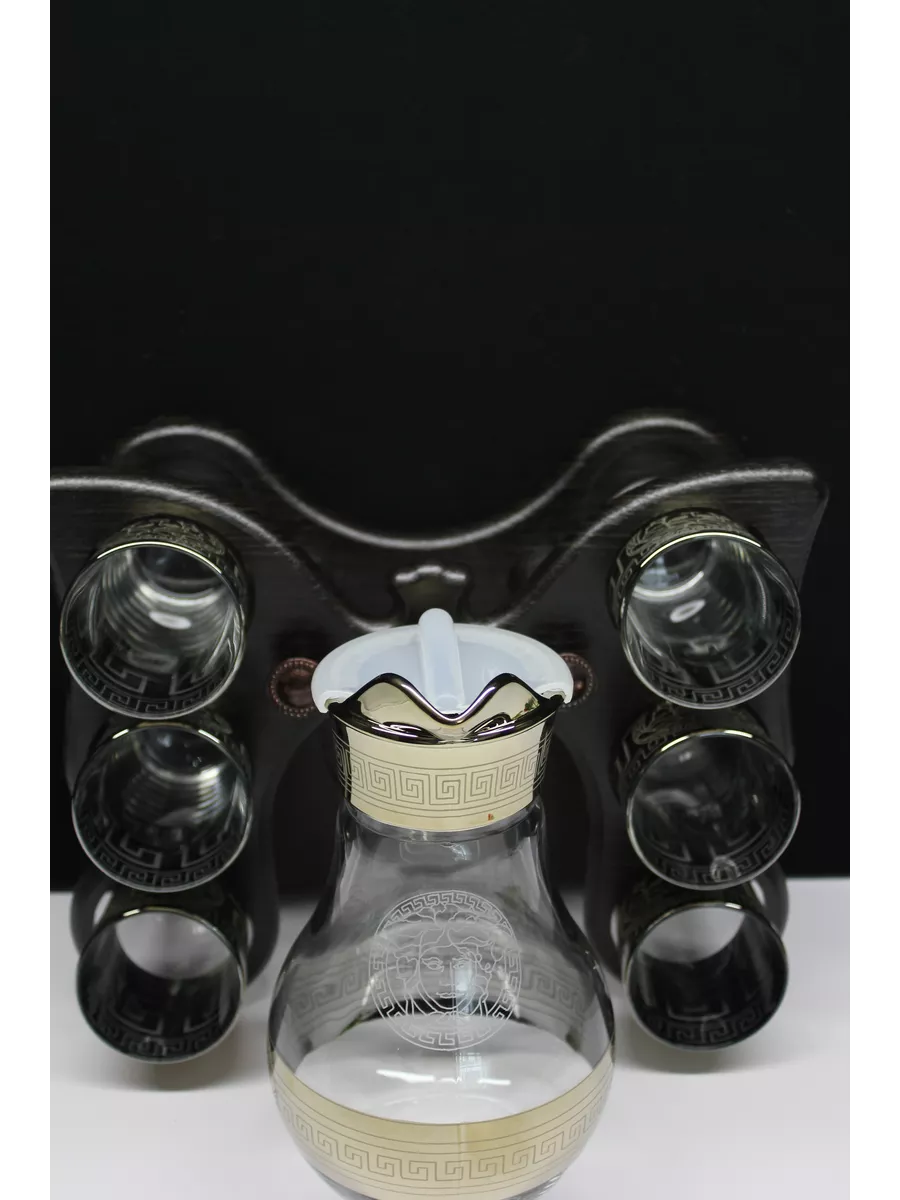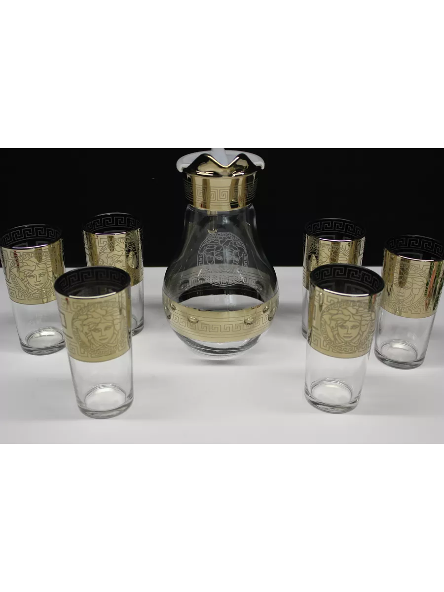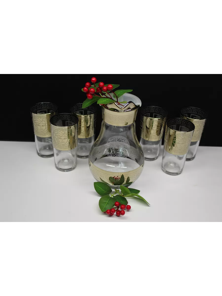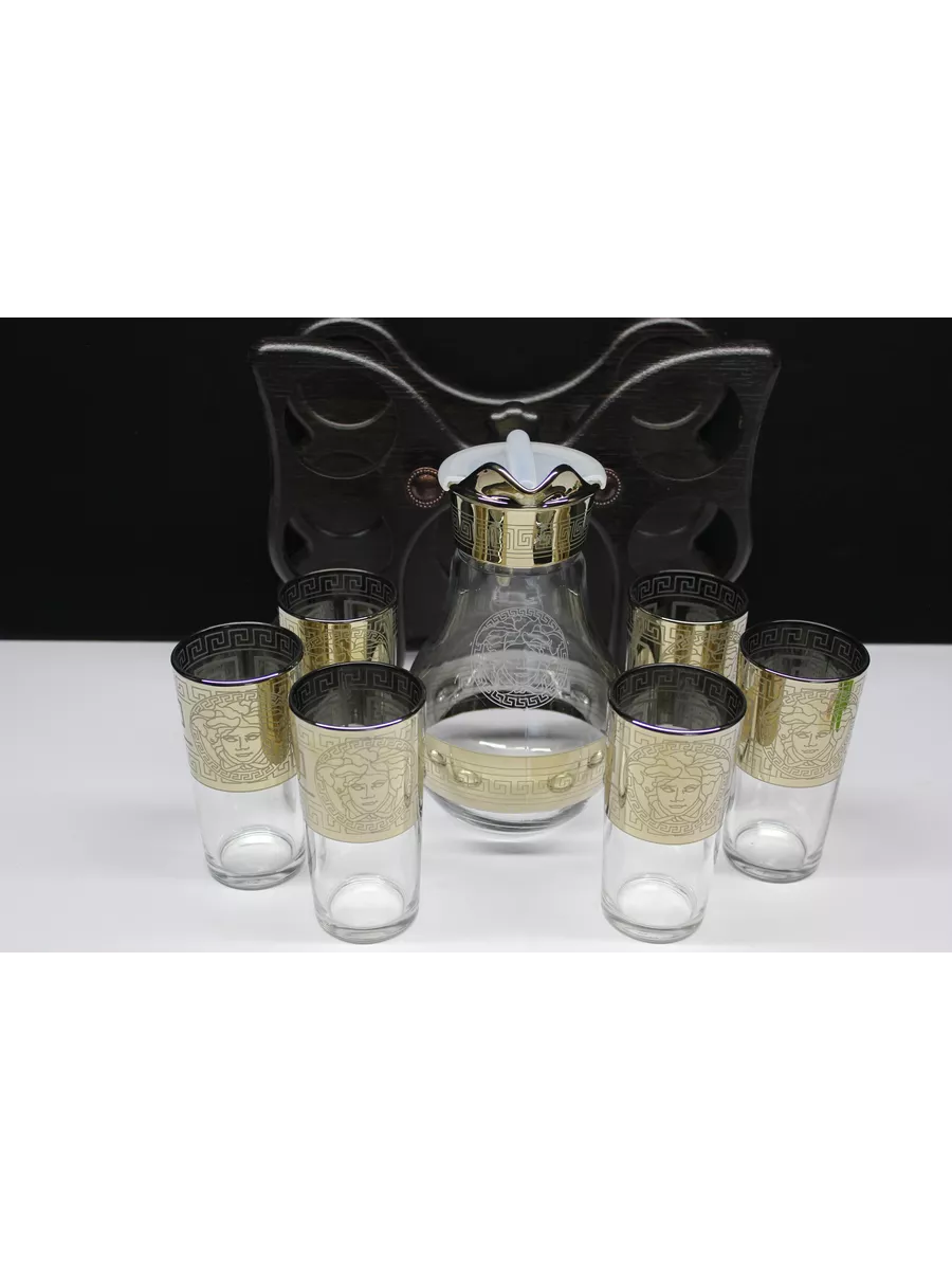 Кувшин для воды 1000 мл с крышкой и стеклянные стаканы 6 шт на барной стойке из коллекции"Версаче" – отличный набор для дома, выполнен из прочного качественного стекла с алмазной гравировкой. Он подойдет как к повседневному, так и торжественному столу. Благодаря своей универсальности декоративная посуда станет идеальным выбором для сервировки стола на любом празднике. Кувшин стеклянный со стаканами - это качественная посуда для сервировки, предназначен для любых напитков: воды и сока, лимонада и компота, молока и коктейлей. Кувшин и стаканы на барной стойке - это комплект, необходимый каждой семье, прослужат вам долго и обеспечат свой первоначальный вид. Набор посуды для сервировки в праздничной подарочной упаковке – это полезный красивый подарок на любой праздник. Приобретая его, вы не только получаете качественный товар, но и стильный элемент декора для вашего дома. И если вы не можете определиться с новогодним подарком или подарком на день рождения и другие праздники, то универсальный решением будет наш подарочный набор кувшин и стаканы на баре.