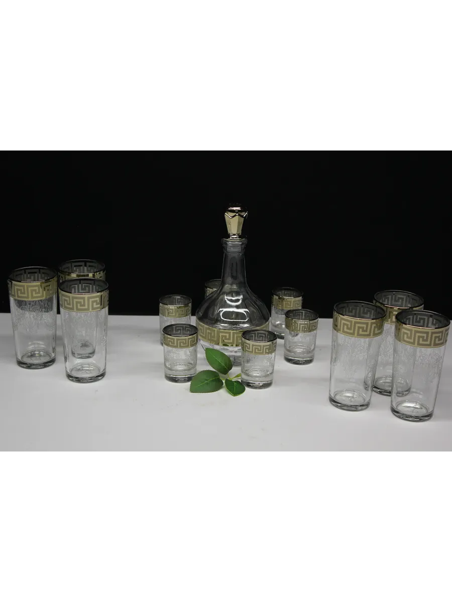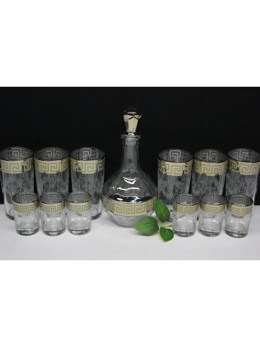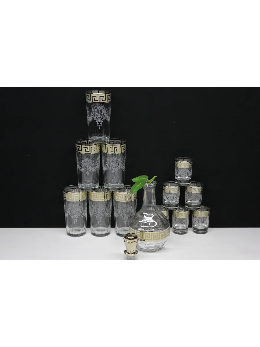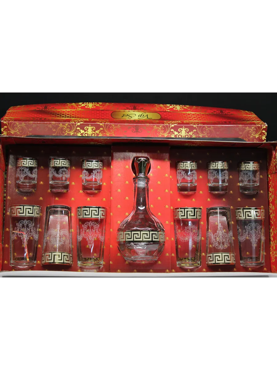 Подарочные стаканы, стопки и графин станут замечательным презентом на любое торжество.Каждый предмет набора изготовлен из прочного стекла и обладает красивой формой, которая придает ему дополнительный шик. Но главным элементом дизайна являются рисунок цветов и золотое напыление, которыми украшен каждый стакан, стопка и графин. Мягкие и изящные линии рисунка замечательно сочетаются с блеском , бокалов , рюмок и графинов создают неповторимый эффект. Этот набор станет отличным подарком для тех, кто ценит красоту, изысканность и гармонию во всем. Он также подойдет для оформления свадебного стола или другого торжества. Набор подарочный «Крис" — это не просто элемент сервировки стола, это настоящее произведение искусства, где каждый бокал станет символом роскоши и изысканности.