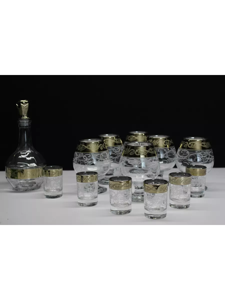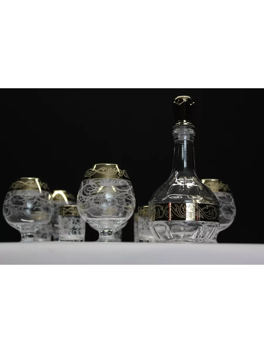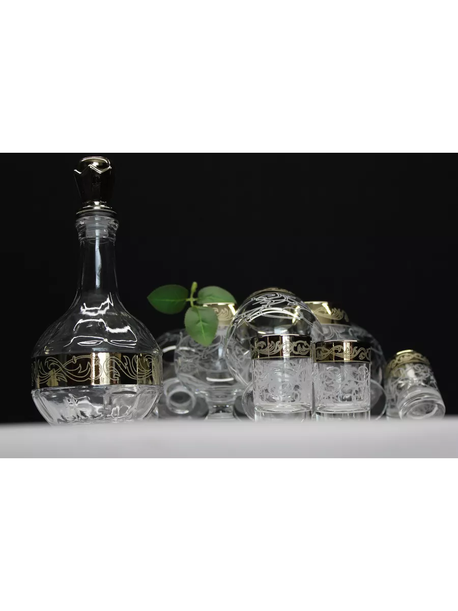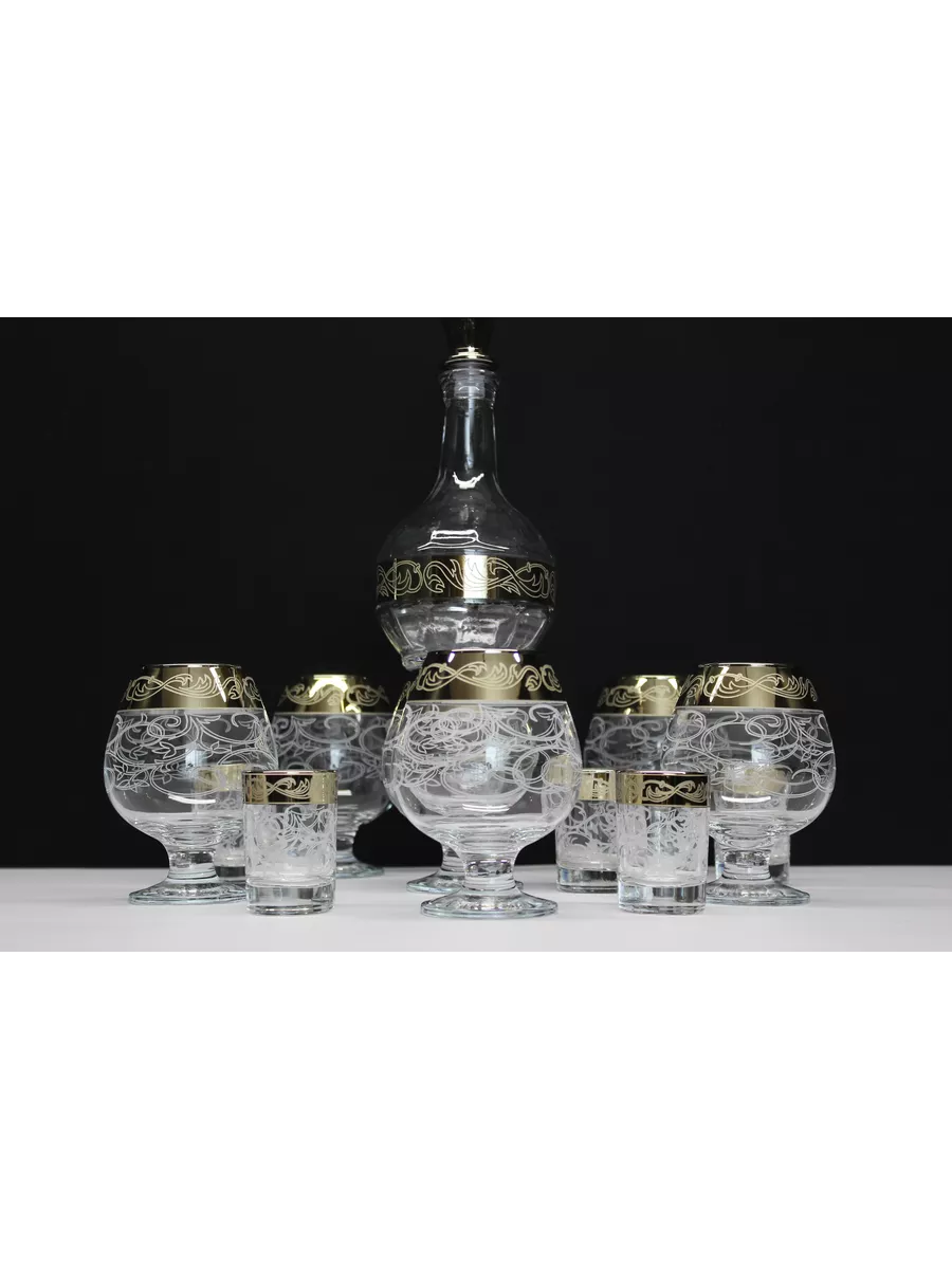 Подарочные бокалы, стопки,графины станут замечательным презентом на любое торжество.Каждый предмет набора изготовлен из прочного стекла и обладает красивой формой, которая придает ему дополнительный шик. Но главным элементом дизайна являются рисунок цветов и золотая отводка, которыми украшен каждый бокал, стопка и графин. Мягкие и изящные линии рисунка замечательно сочетаются с блеском , бокалов , стопок и графинов создают неповторимый эффект. Этот набор станет отличным подарком для тех, кто ценит красоту, изысканность и гармонию во всем. Он также подойдет для оформления свадебного стола или другого торжества. Набор подарочный «Абстракция" — это не просто элемент сервировки стола, это настоящее произведение искусства, где каждый бокал станет символом роскоши и изысканности.