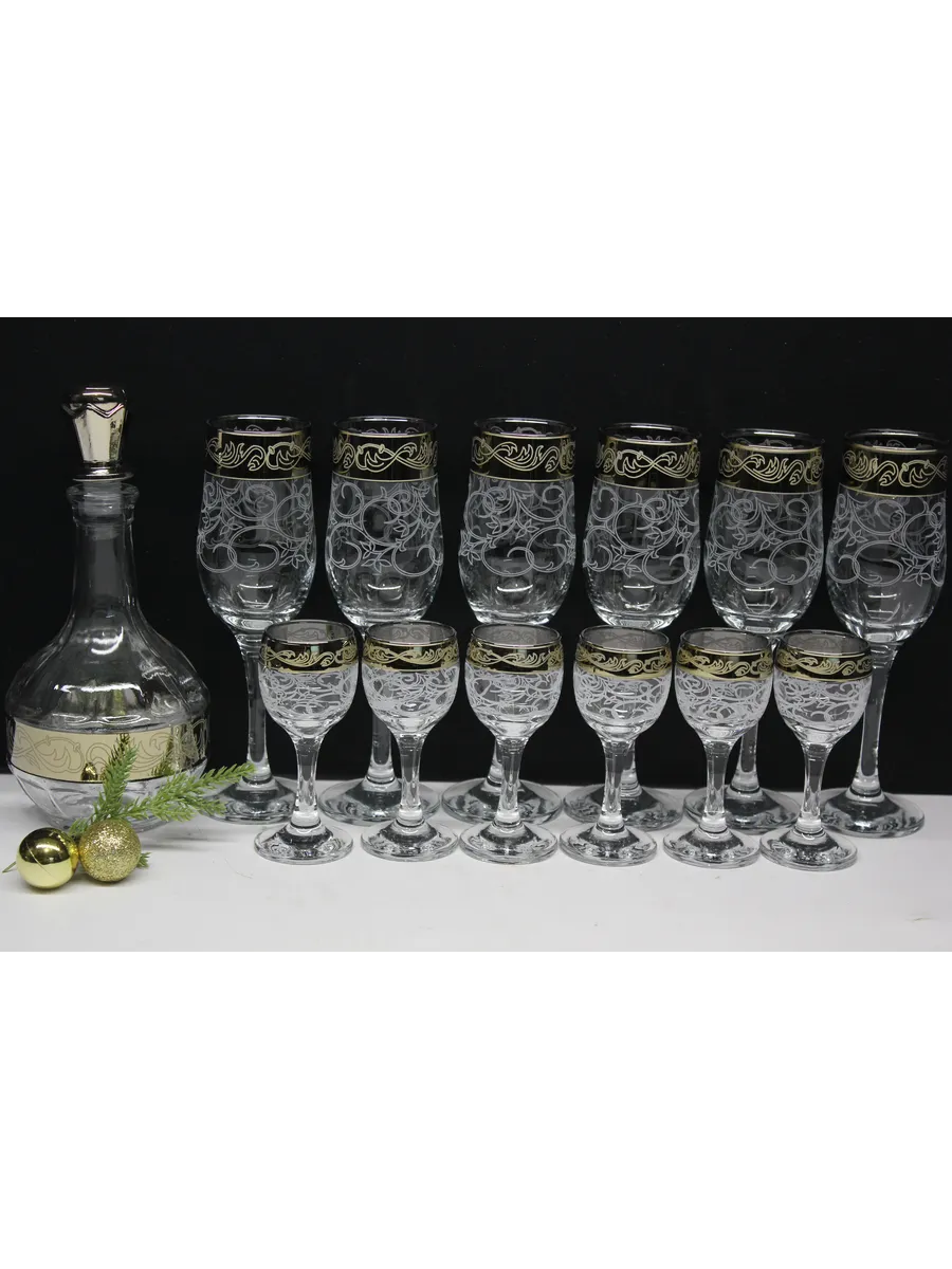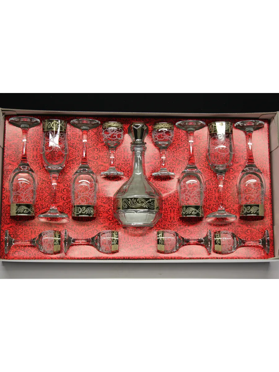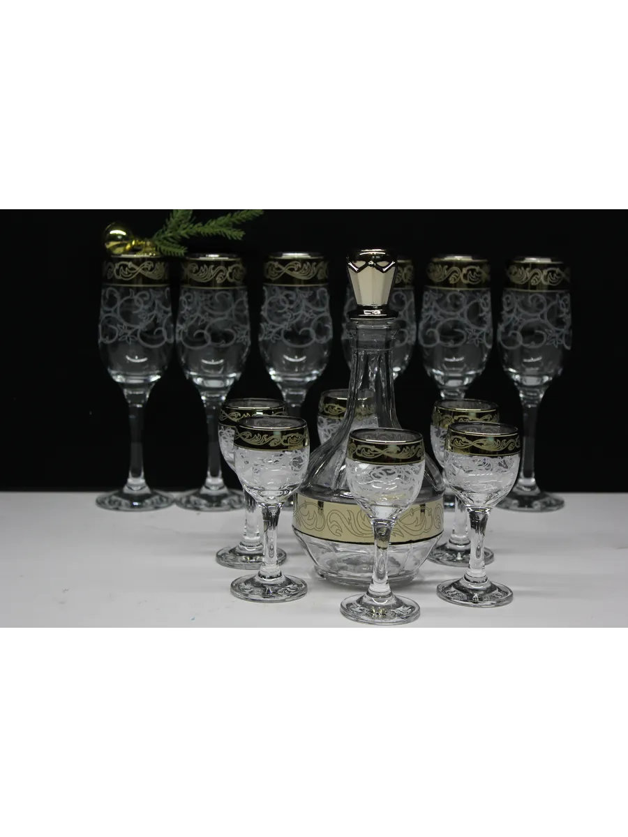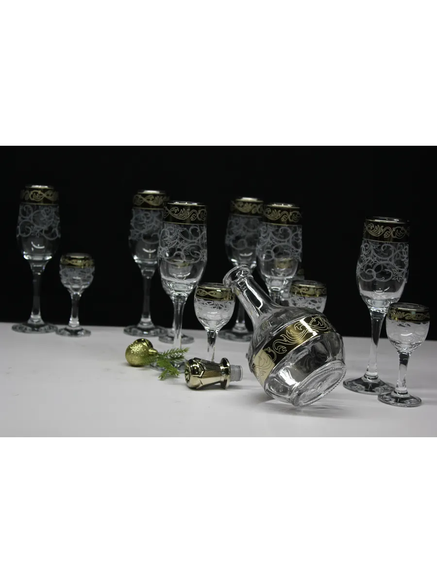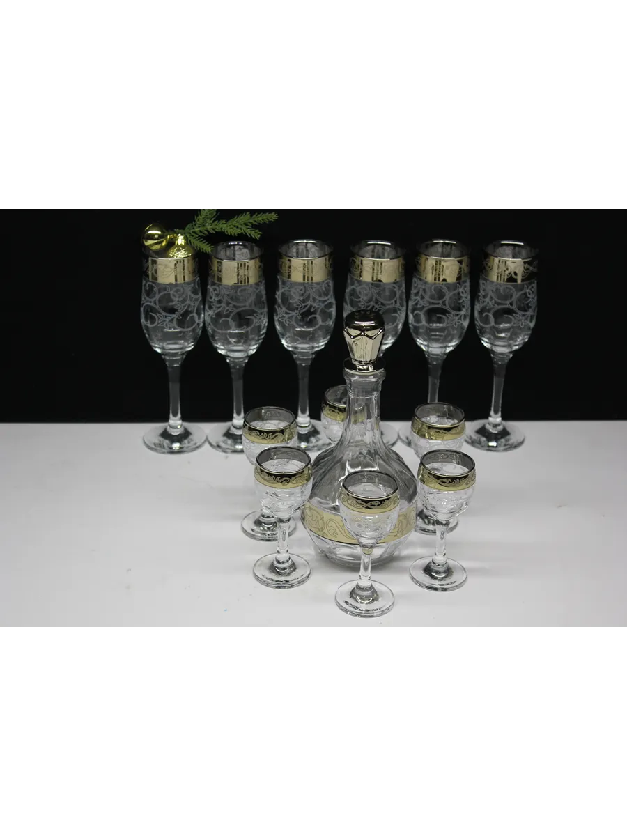 Подарочные бокалы, рюмки и графин станут замечательным презентом на любое торжество.Каждый предмет набора изготовлен из прочного стекла и обладает красивой формой, которая придает ему дополнительный шик. Но главным элементом дизайна являются рисунок цветов и золотая отводка, которыми украшен каждый бокал, рюмка и графин. Мягкие и изящные линии рисунка замечательно сочетаются с блеском , бокалов , рюмок и графинов создают неповторимый эффект. Этот набор станет отличным подарком для тех, кто ценит красоту, изысканность и гармонию во всем. Он также подойдет для оформления свадебного стола или другого торжества. Набор подарочный «Абстракция" — это не просто элемент сервировки стола, это настоящее произведение искусства, где каждый бокал станет символом роскоши и изысканности.