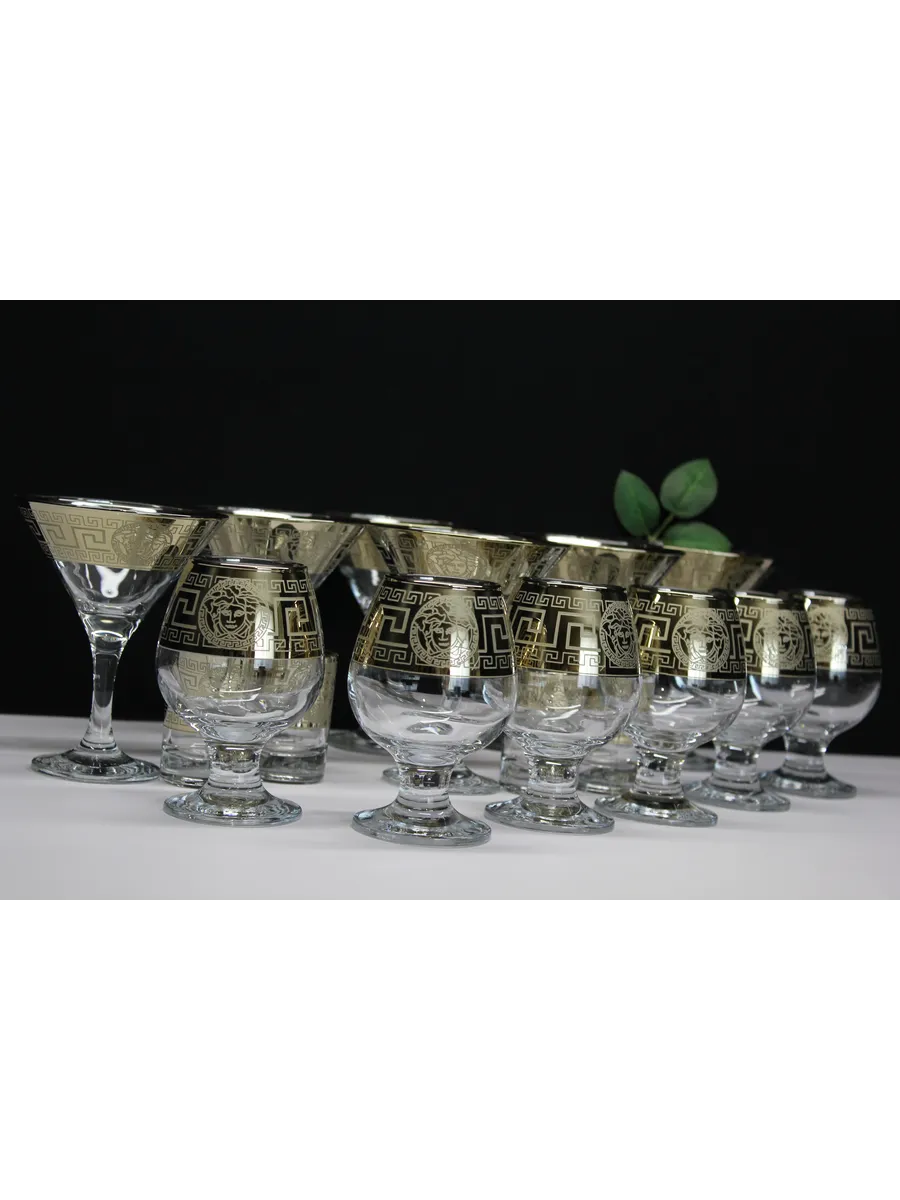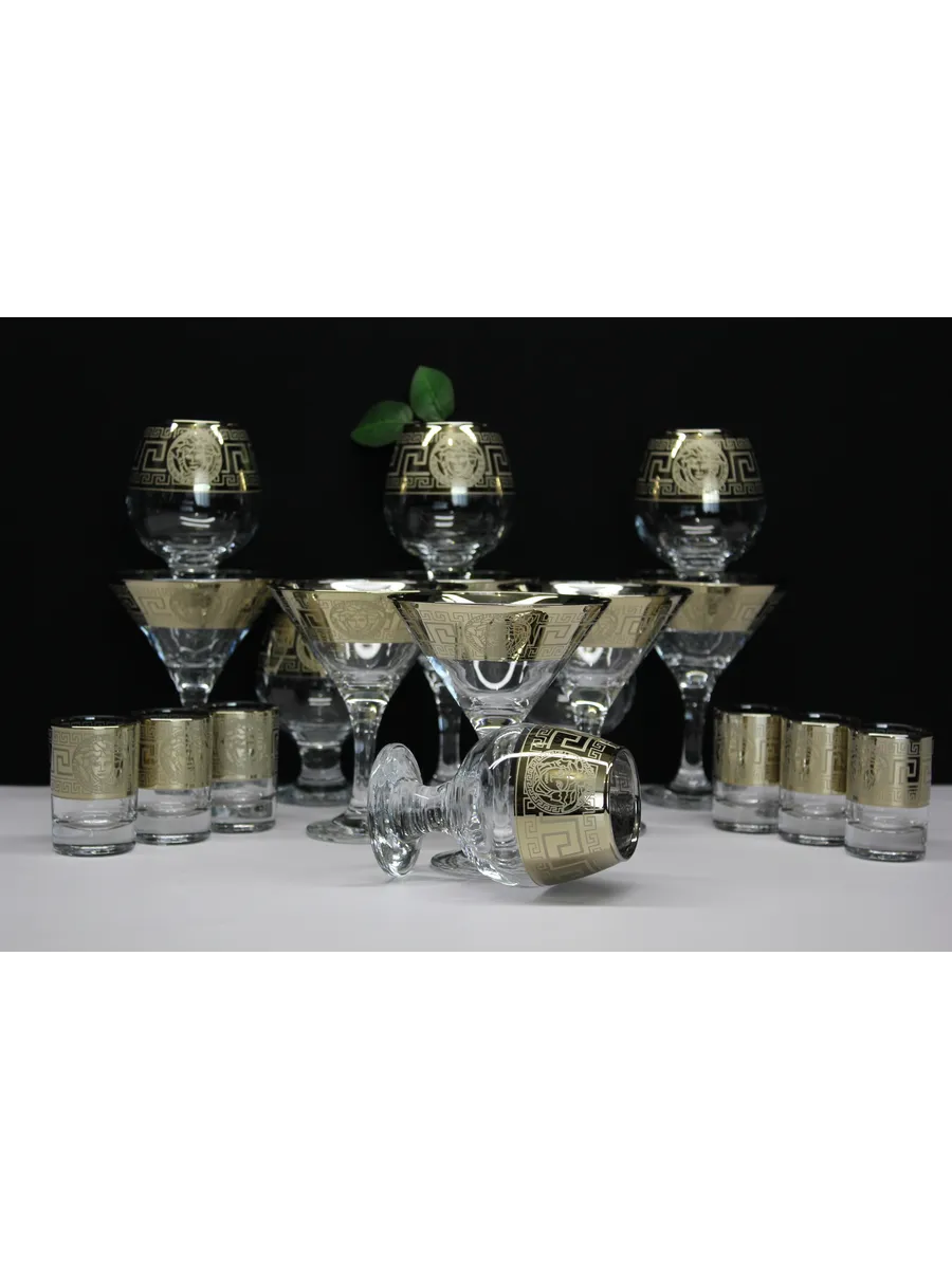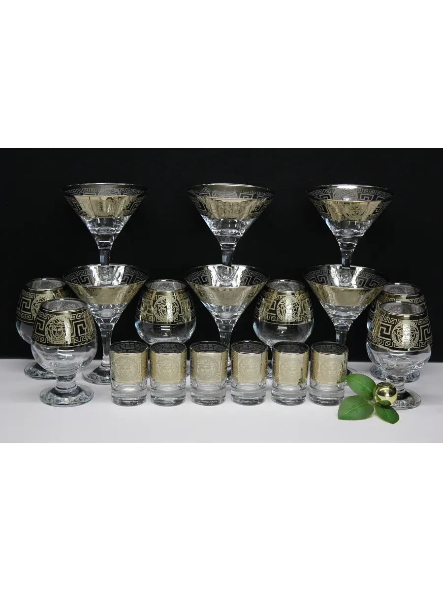 Этот элегантный и стильный подарочный набор "Версаче" включает 6 фужеров для мартини, 6 фужеров для бренди и 6 стопок, украшенных золотым богемным напылением и гравировкой "Версаче". Набор поставляется в стильной подарочной упаковке, что делает его идеальным подарком для любителей изысканности и утонченности.