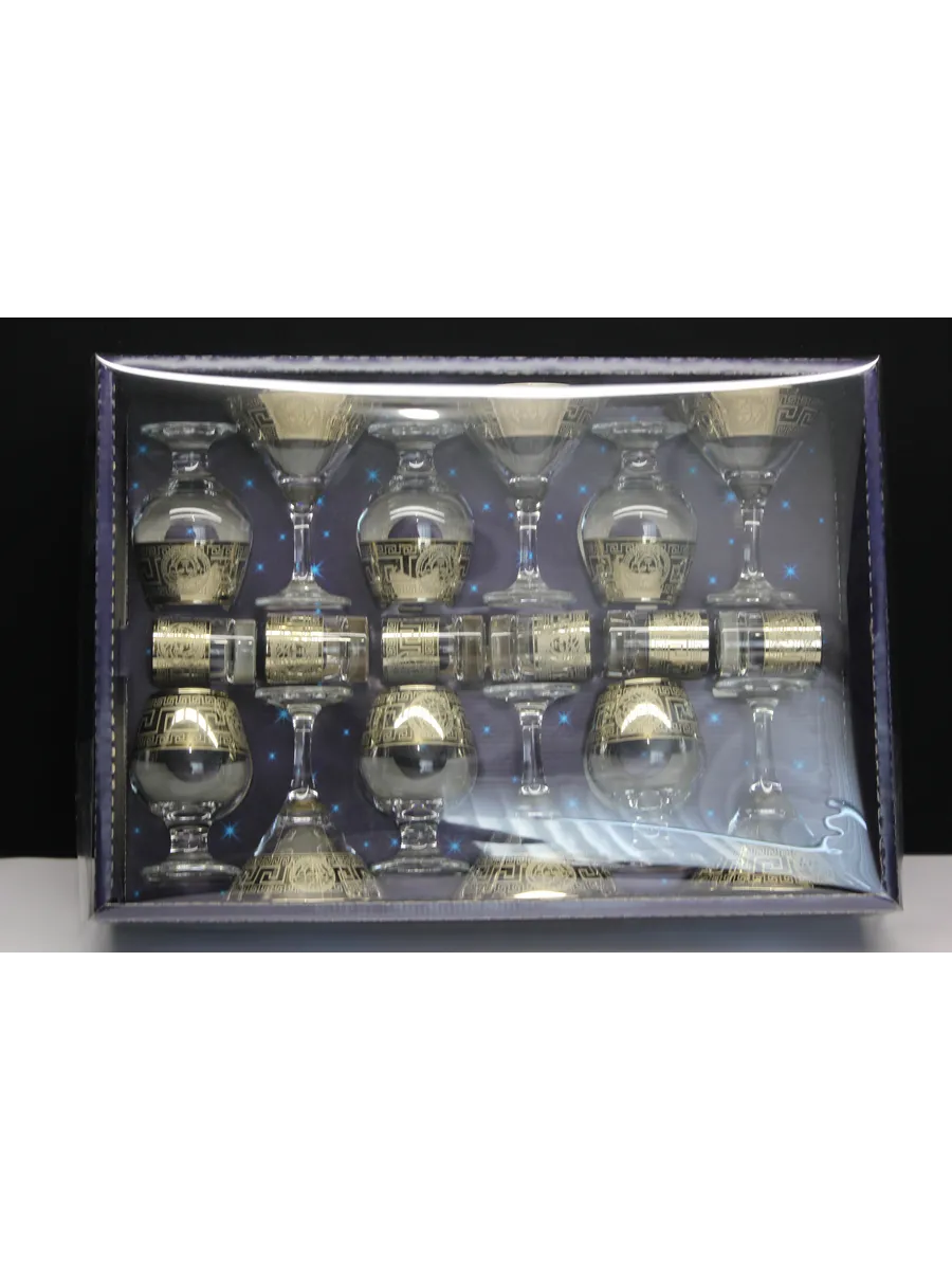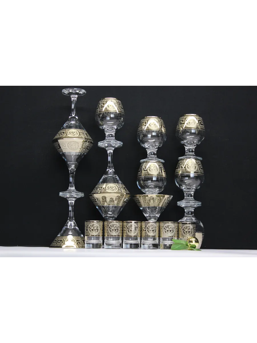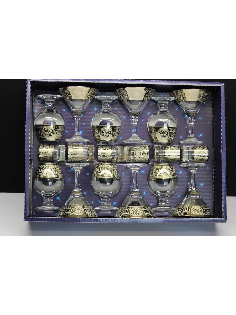 Этот элегантный и стильный подарочный набор "Версаче" включает 6 фужеров для мартини, 6 фужеров для бренди и 6 стопок, украшенных золотым богемным напылением и гравировкой "Версаче". Набор поставляется в стильной подарочной упаковке, что делает его идеальным подарком для любителей изысканности и утонченности.