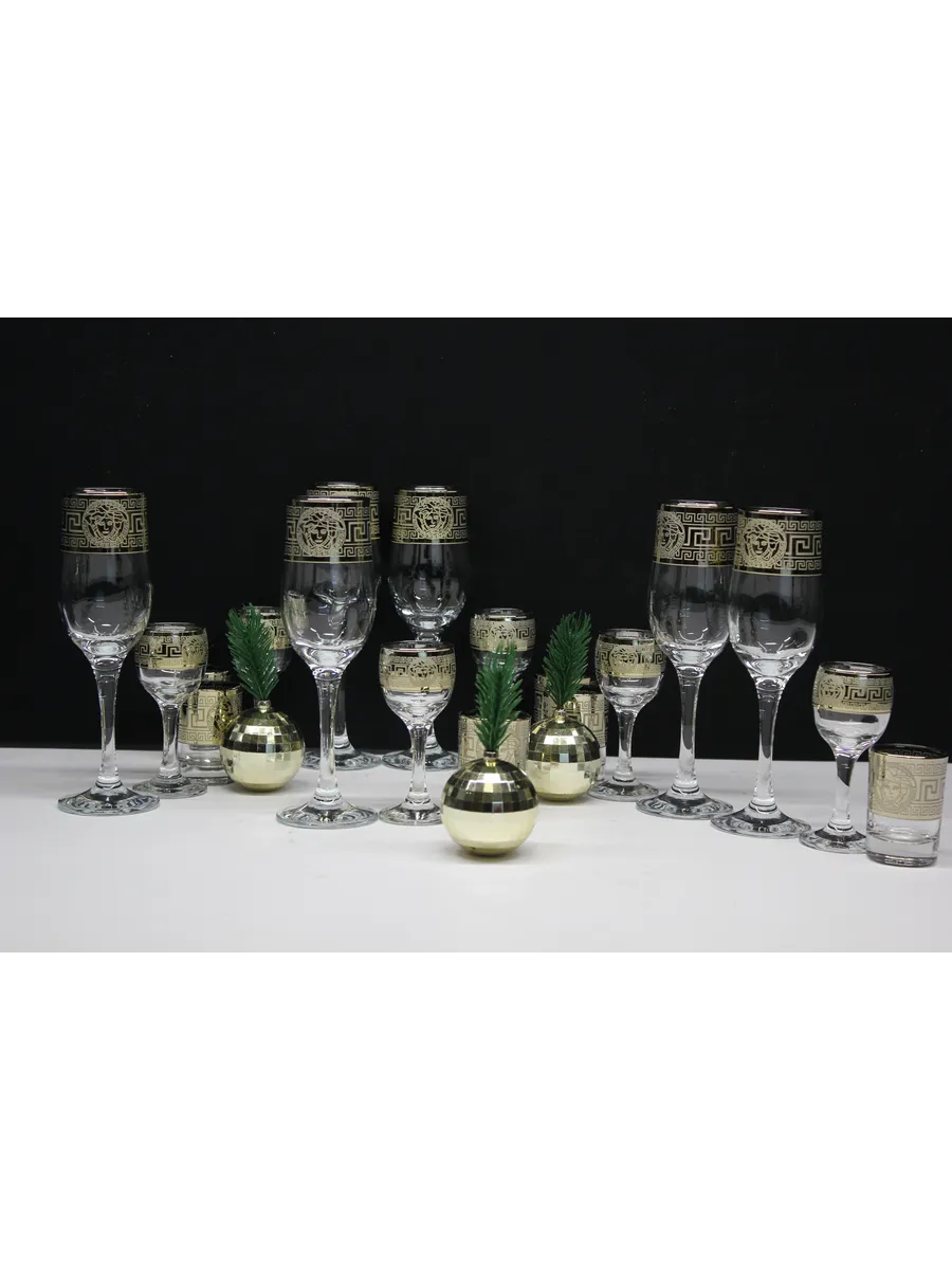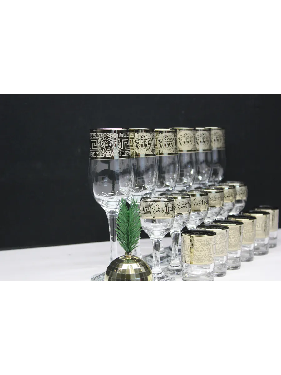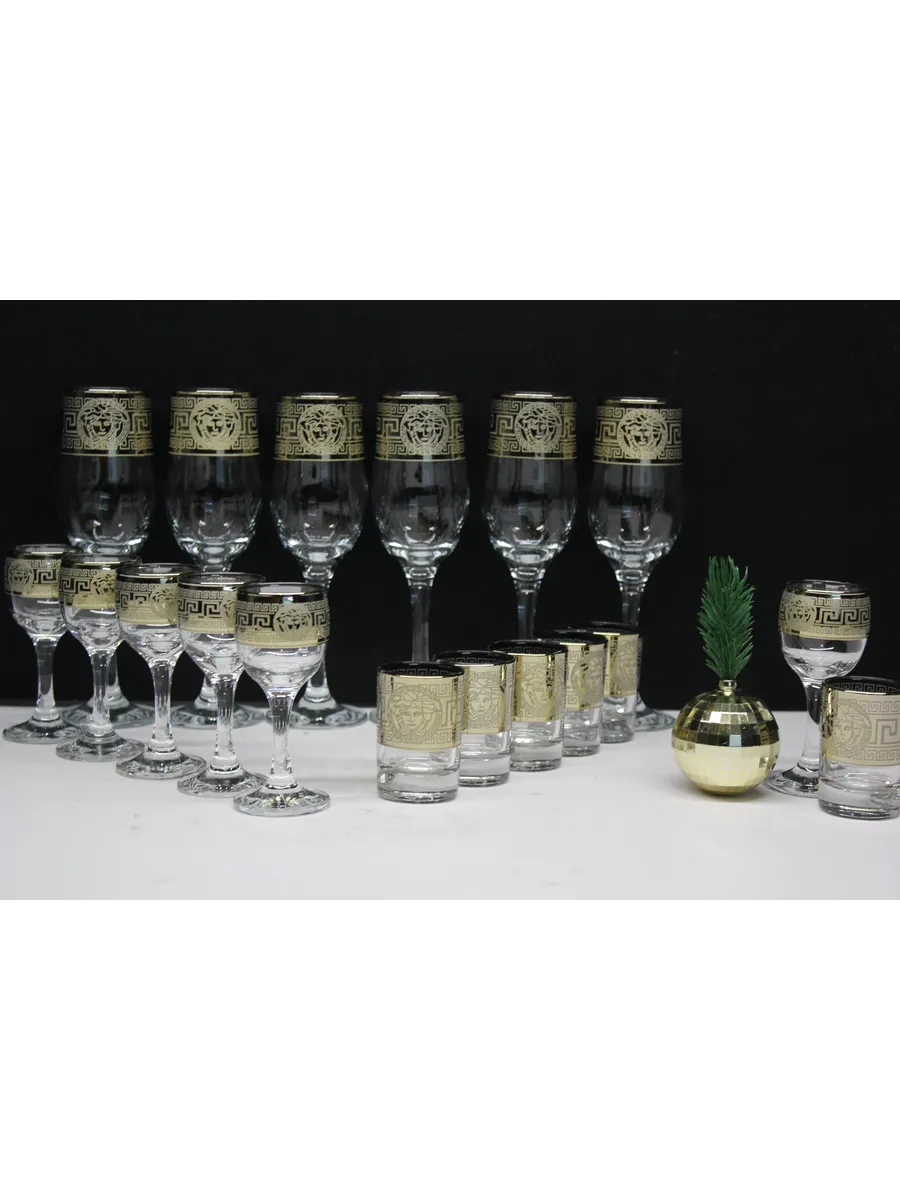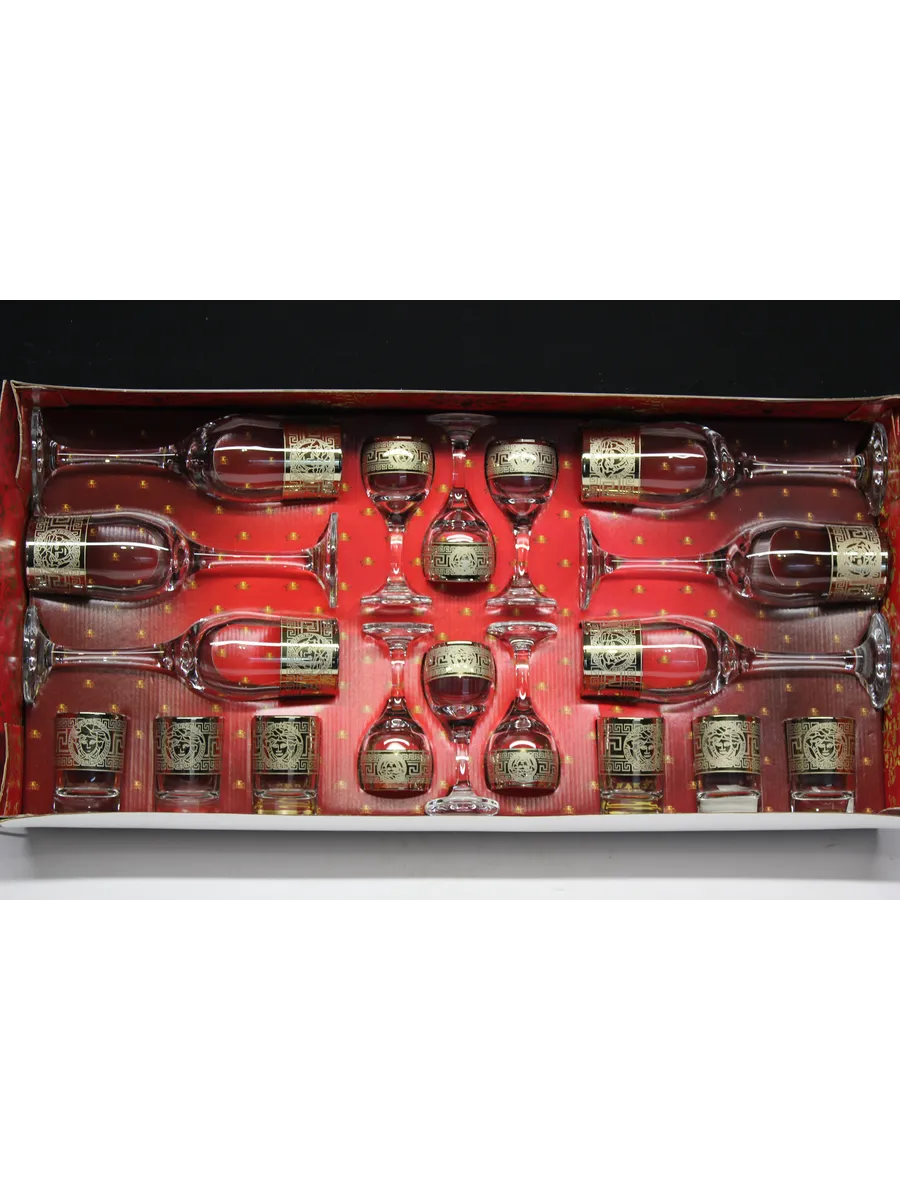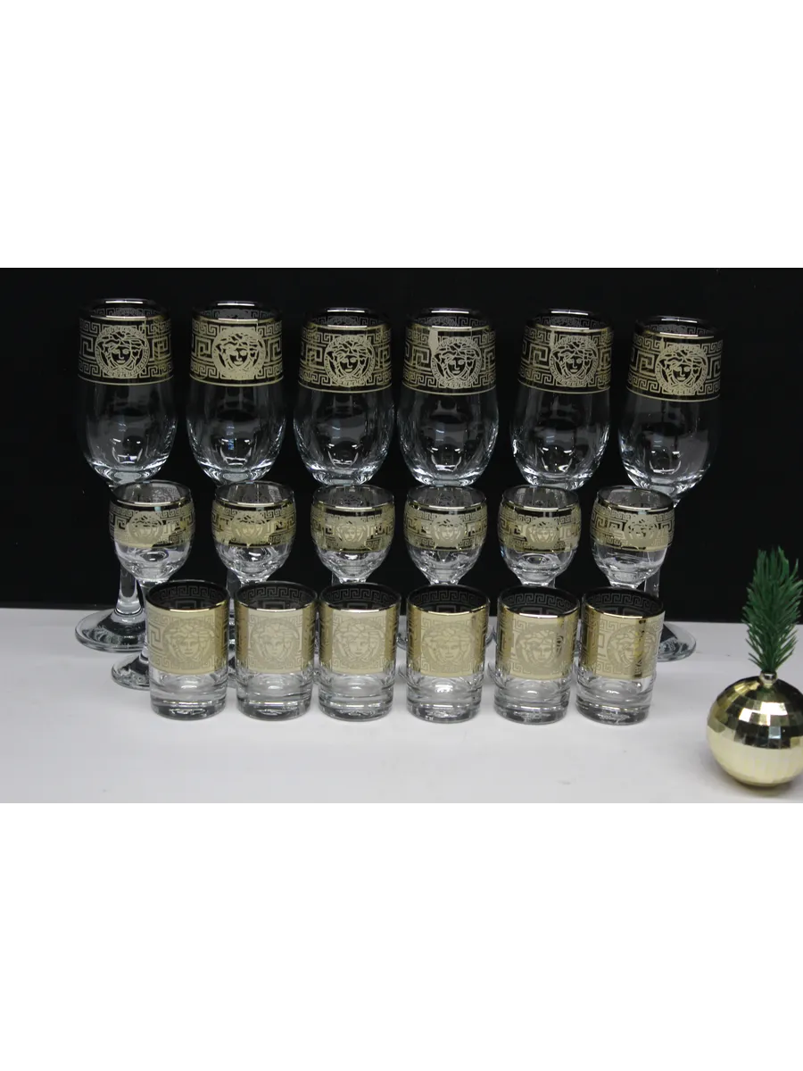 Этот роскошный подарочный набор — воплощение великолепия и изысканности. В набор входят 6 бокалов объемом 190 мл, 6 рюмок объемом 60 мл и 6 стопок объемом 50 мл, украшенных гравировкой в стиле версаче и золотым напылением. Идеальный выбор для тех, кто ценит роскошь и утонченность.