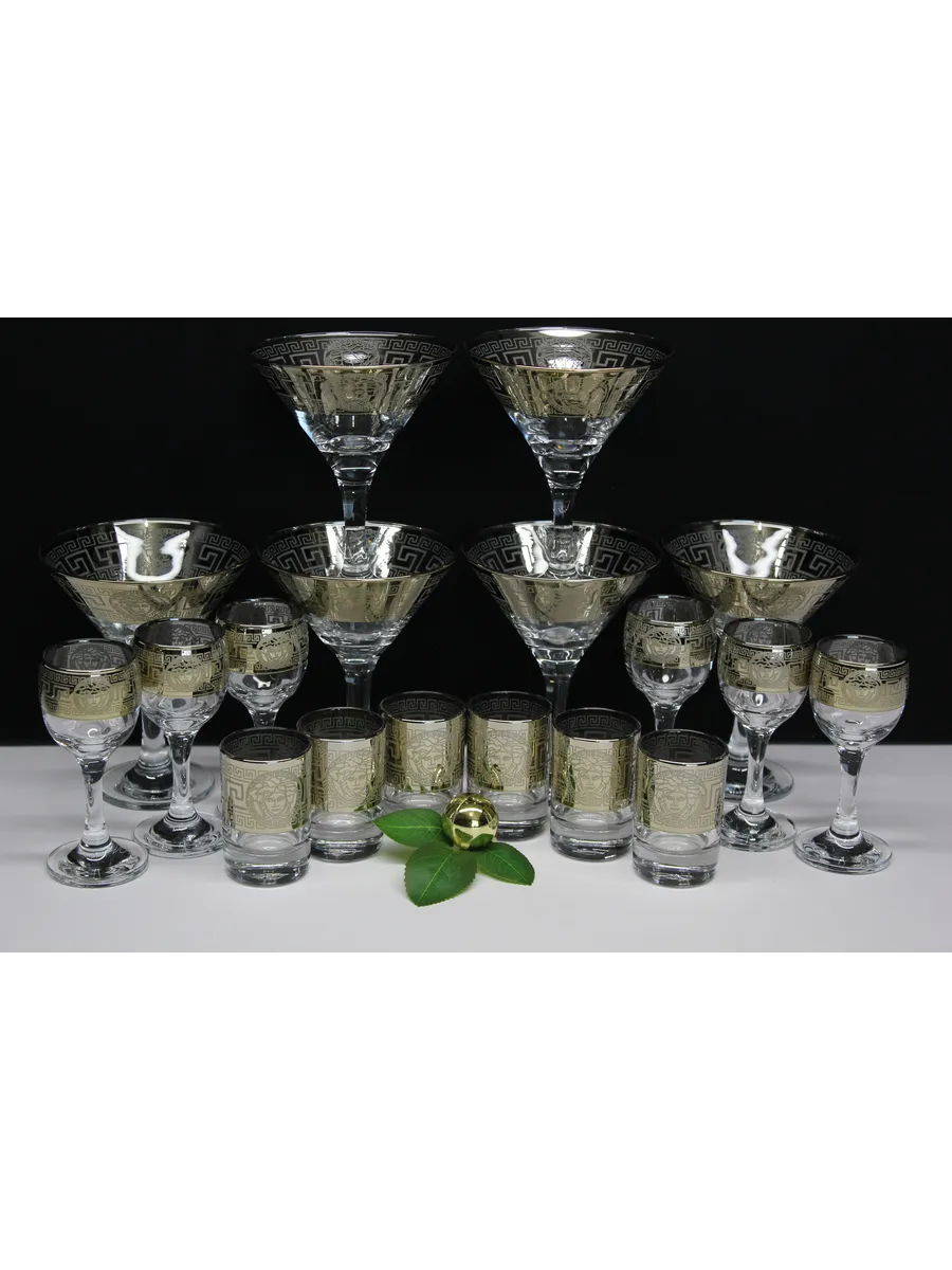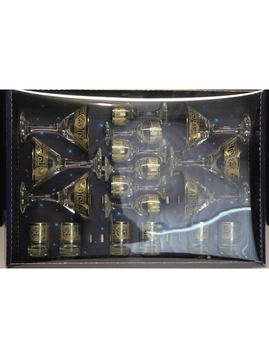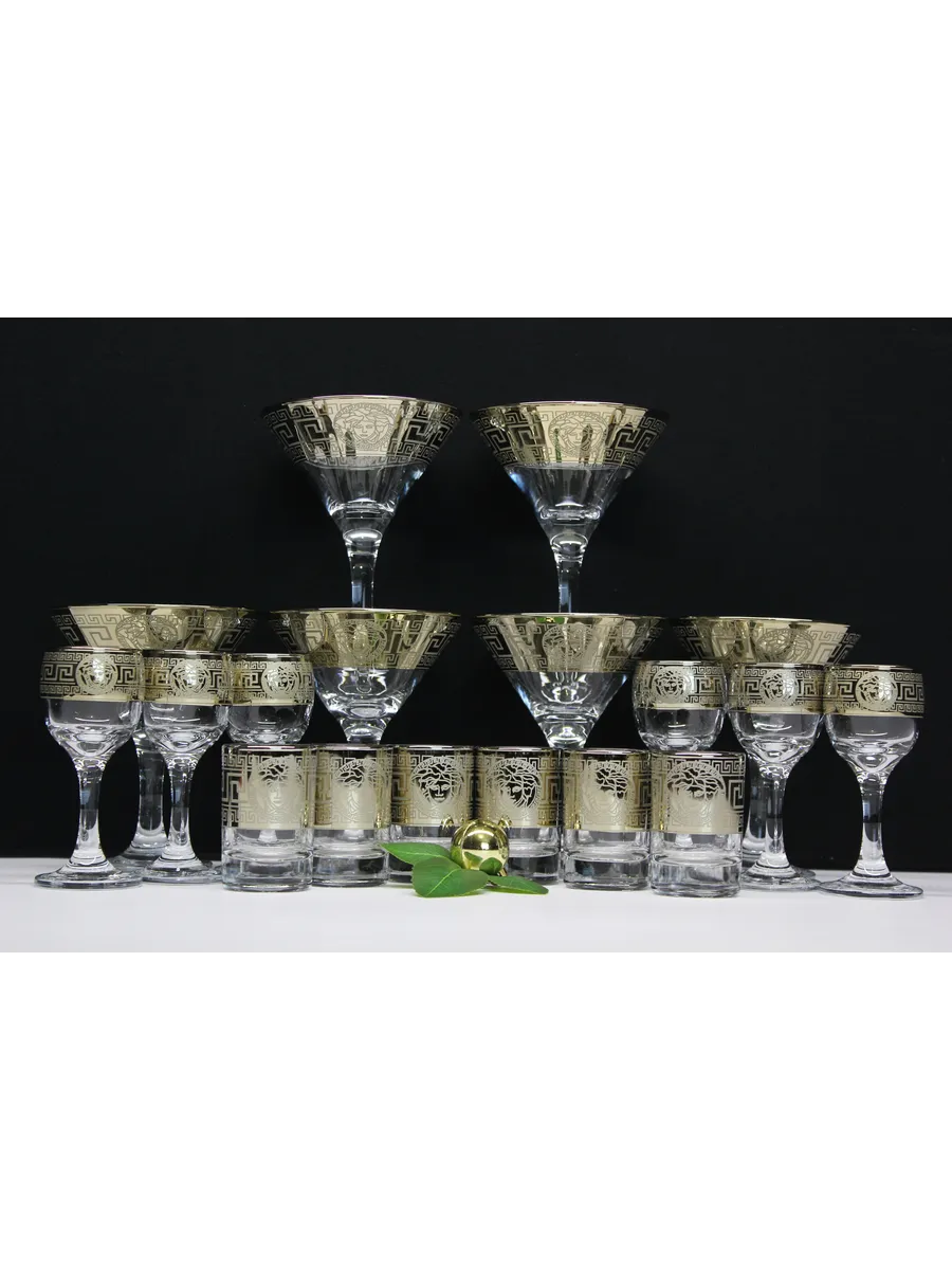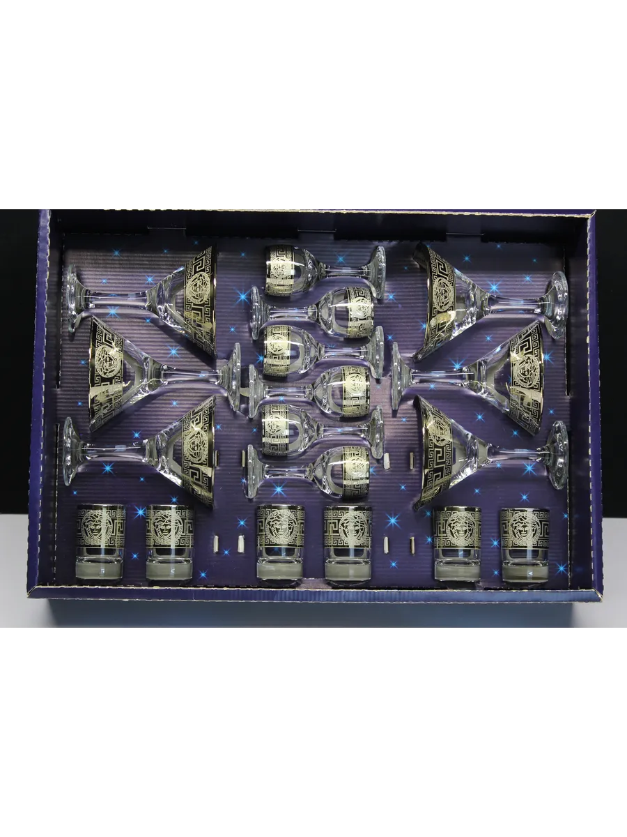 Этот элегантный и стильный подарочный набор "Версаче" включает 6 фужеров для мартини, 6 рюмок и 6 стопок, украшенных гравировкой "Версаче" с золотым богемным напылением. Набор поставляется в стильной подарочной упаковке, что делает его идеальным подарком для любителей изысканности и утонченности.