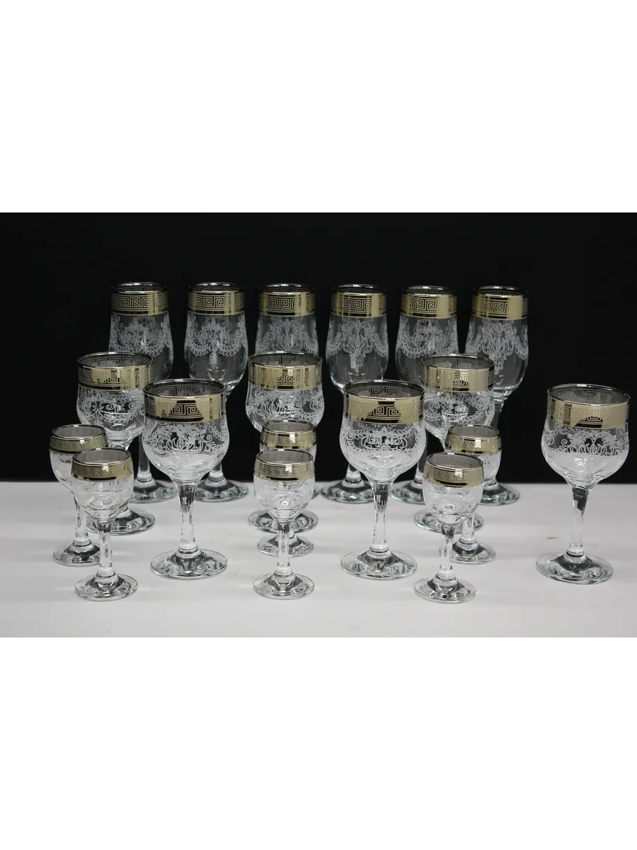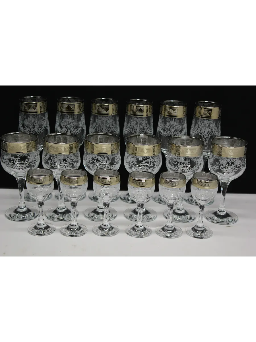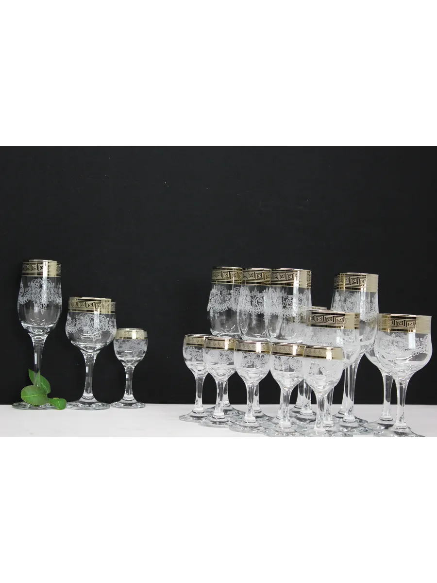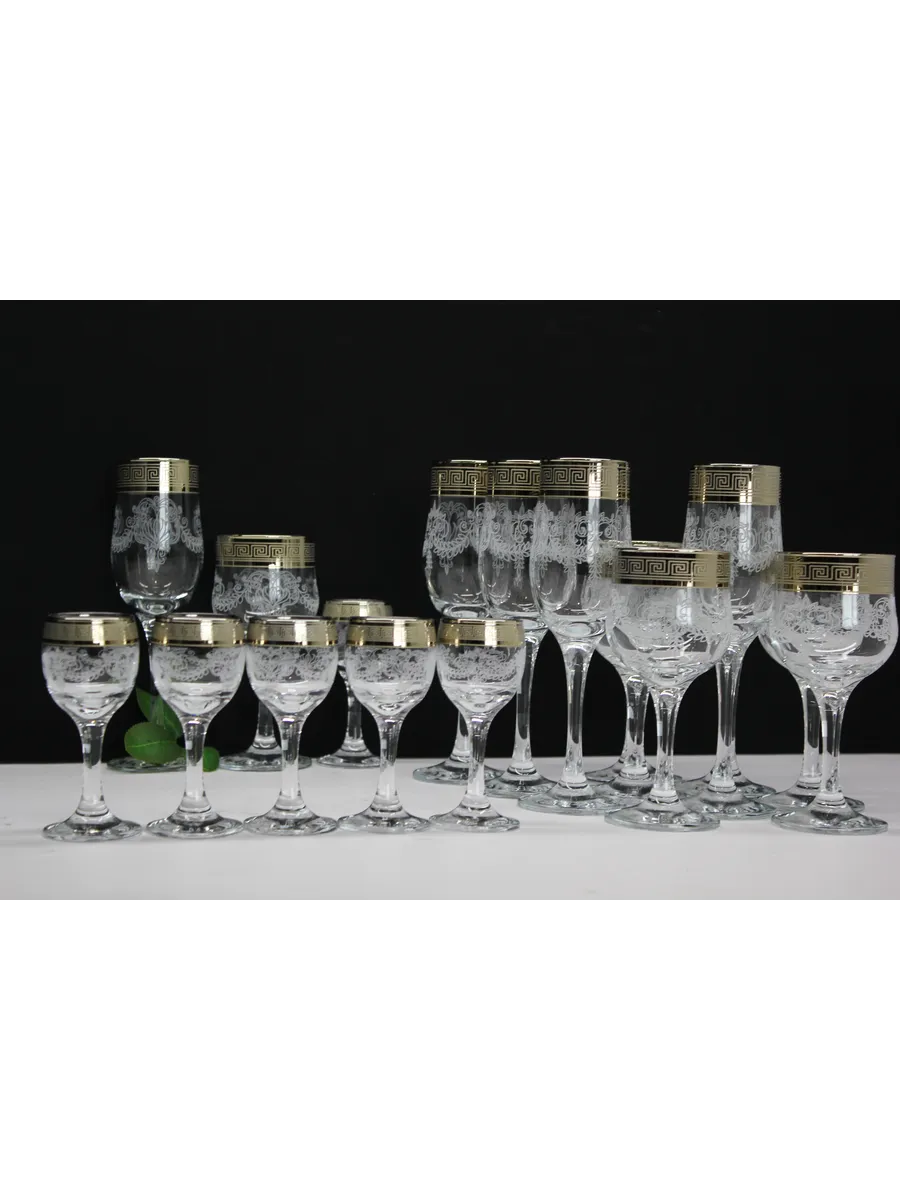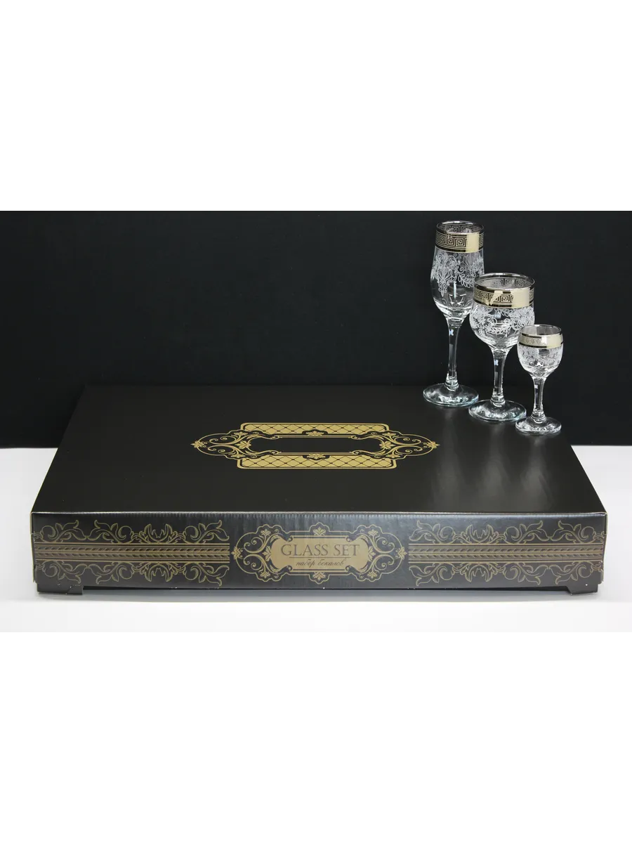 Подарочные бокалы и фужеры станут замечательным презентом на любое торжество.Каждый предмет набора изготовлен из прочного стекла и обладает красивой формой, которая придает ему дополнительный шик. Но главным элементом дизайна являются рисунок цветов и золотая отводка, которыми украшен каждые фужер, бокал и рюмка. Мягкие и изящные линии рисунка замечательно сочетаются с блеском фужеров, бокалов и рюмок и создают неповторимый эффект. Этот набор станет отличным подарком для тех, кто ценит красоту, изысканность и гармонию во всем. Он также подойдет для оформления свадебного стола или другого торжества. Набор подарочный «Венецианская нить» — это не просто элемент сервировки стола, это настоящее произведение искусства, где каждый бокал станет символом роскоши и изысканности.