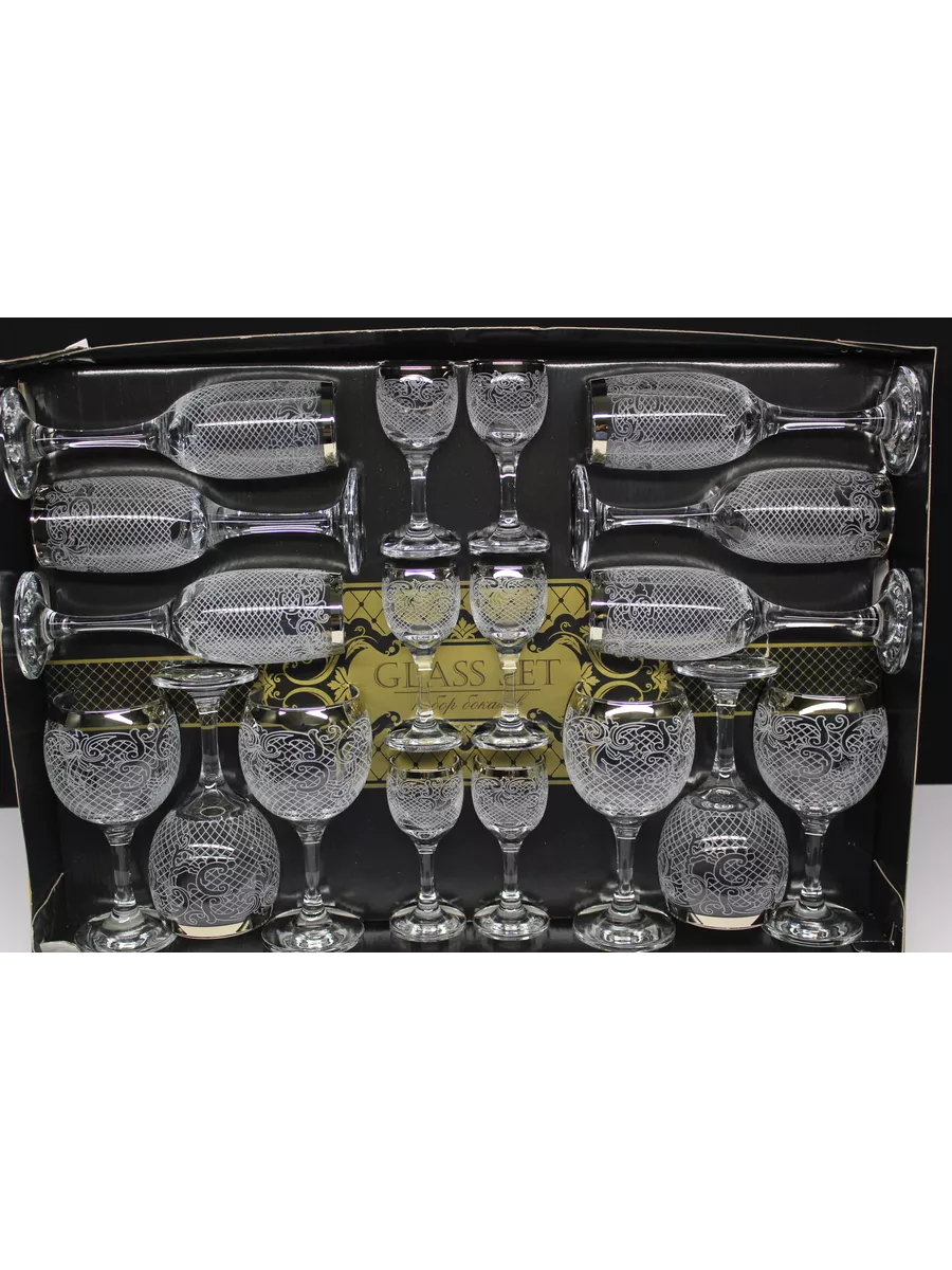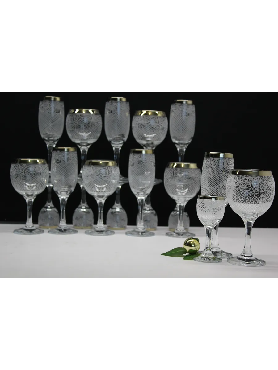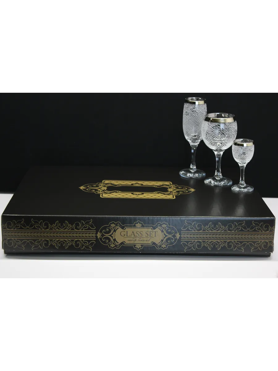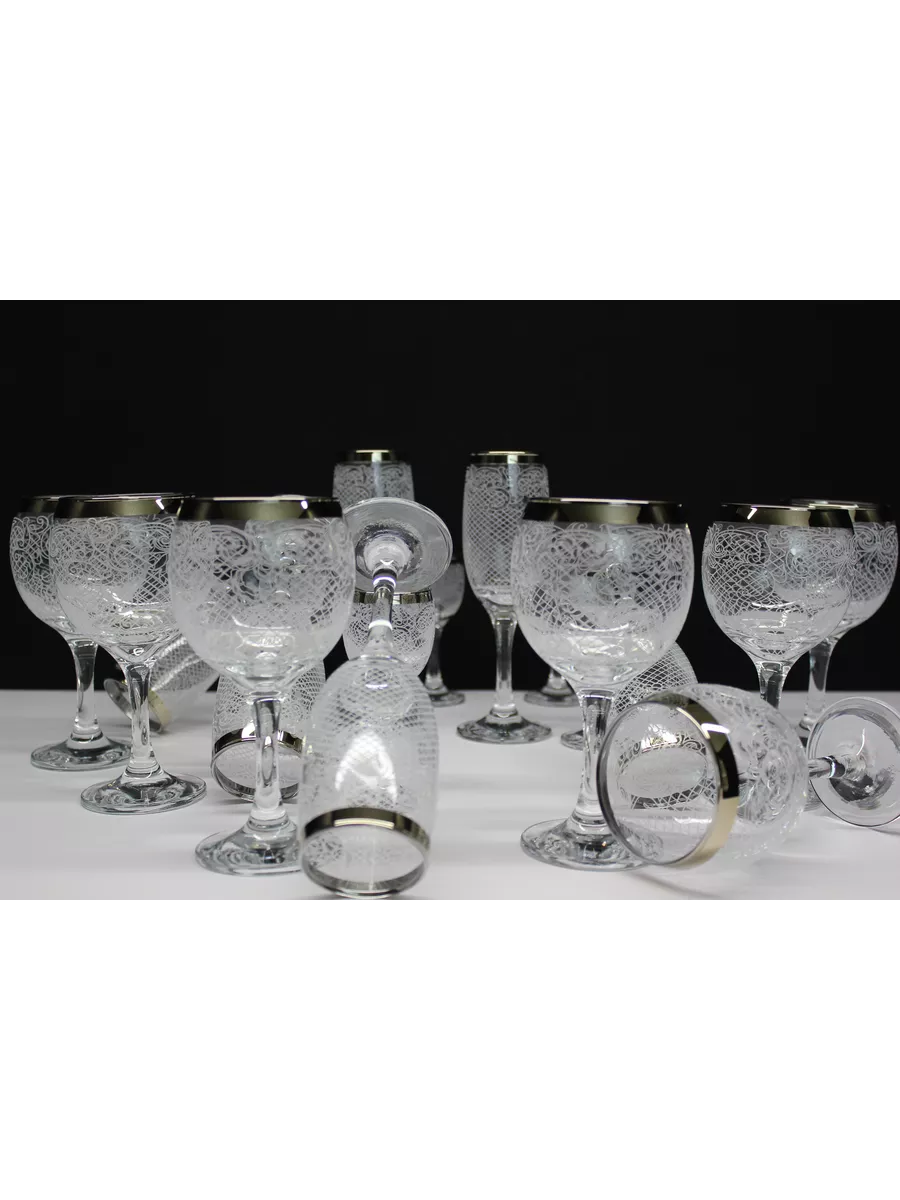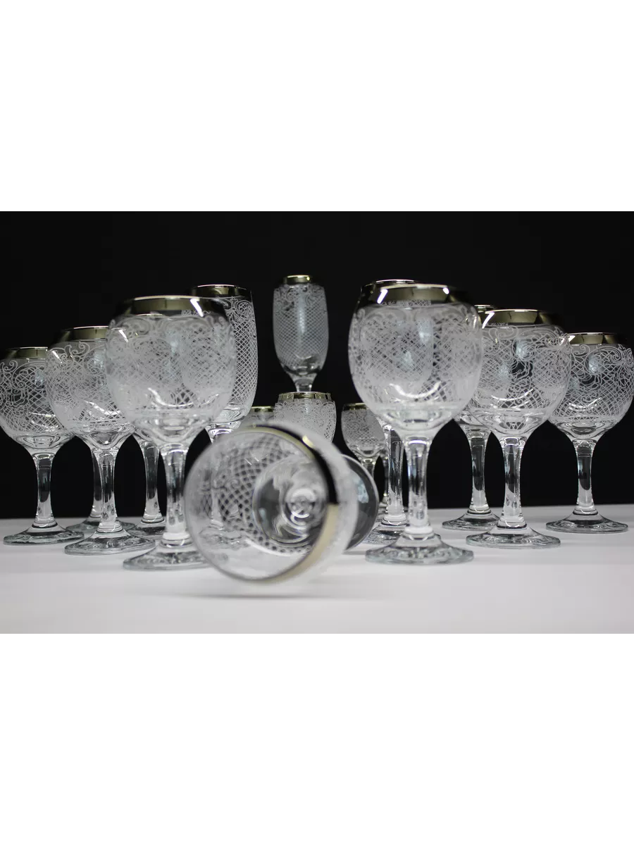 Подарочные бокалы и фужеры станут замечательным презентом на любое торжество.Каждый предмет набора изготовлен из прочного стекла и обладает красивой формой, которая придает ему дополнительный шик. Но главным элементом дизайна являются рисунок цветов и золотая отводка, которыми украшен каждые фужер, бокал и рюмка. Мягкие и изящные линии рисунка замечательно сочетаются с блеском фужеров, бокалов и рюмок и создают неповторимый эффект. Этот набор станет отличным подарком для тех, кто ценит красоту, изысканность и гармонию во всем. Он также подойдет для оформления свадебного стола или другого торжества. Набор подарочный «Венецианская нить» — это не просто элемент сервировки стола, это настоящее произведение искусства, где каждый бокал станет символом роскоши и изысканности.