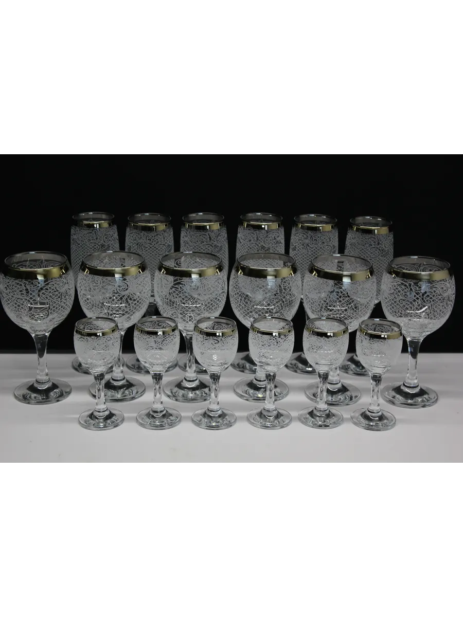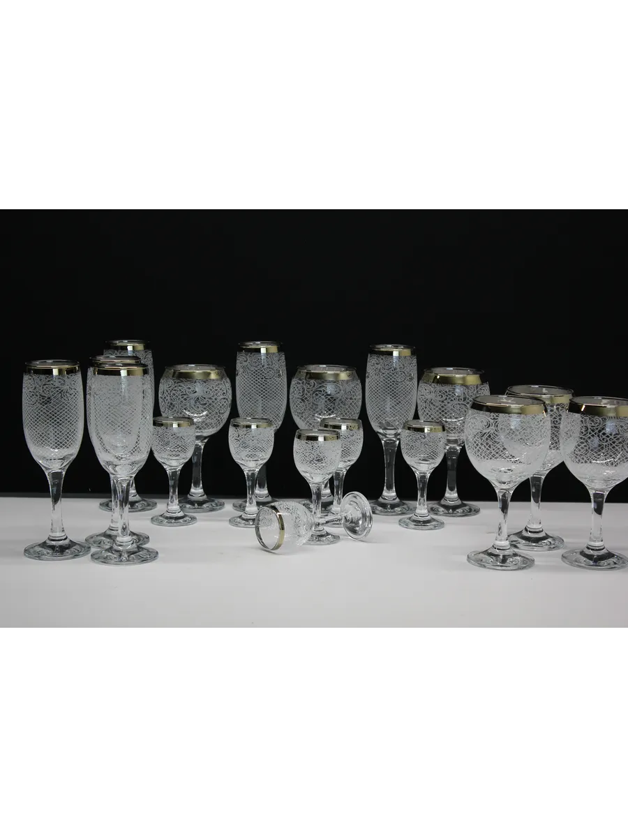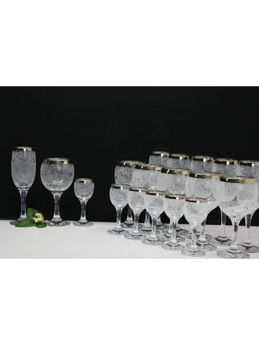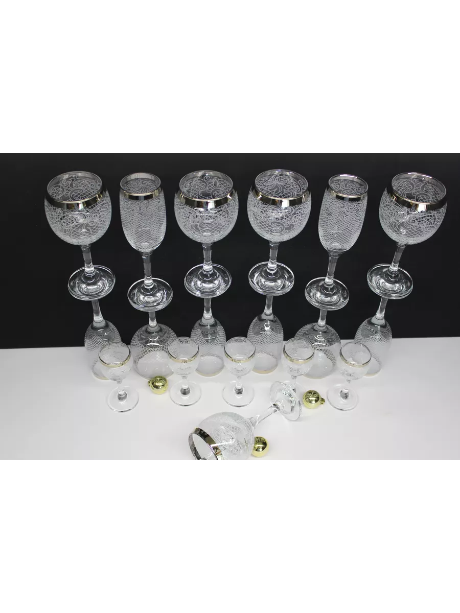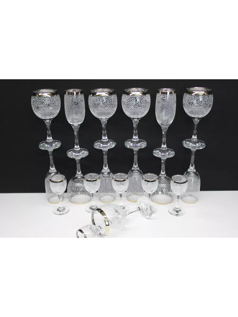 Подарочные бокалы и фужеры станут замечательным презентом на любое торжество.Каждый предмет набора изготовлен из прочного стекла и обладает красивой формой, которая придает ему дополнительный шик. Но главным элементом дизайна являются рисунок цветов и золотая отводка, которыми украшен каждые фужер, бокал и рюмка. Мягкие и изящные линии рисунка замечательно сочетаются с блеском фужеров, бокалов и рюмок и создают неповторимый эффект. Этот набор станет отличным подарком для тех, кто ценит красоту, изысканность и гармонию во всем. Он также подойдет для оформления свадебного стола или другого торжества. Набор подарочный «Венецианская нить» — это не просто элемент сервировки стола, это настоящее произведение искусства, где каждый бокал станет символом роскоши и изысканности.