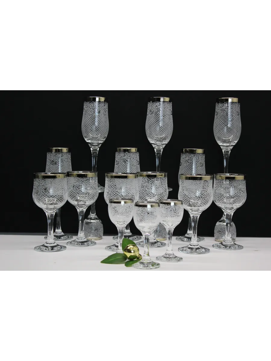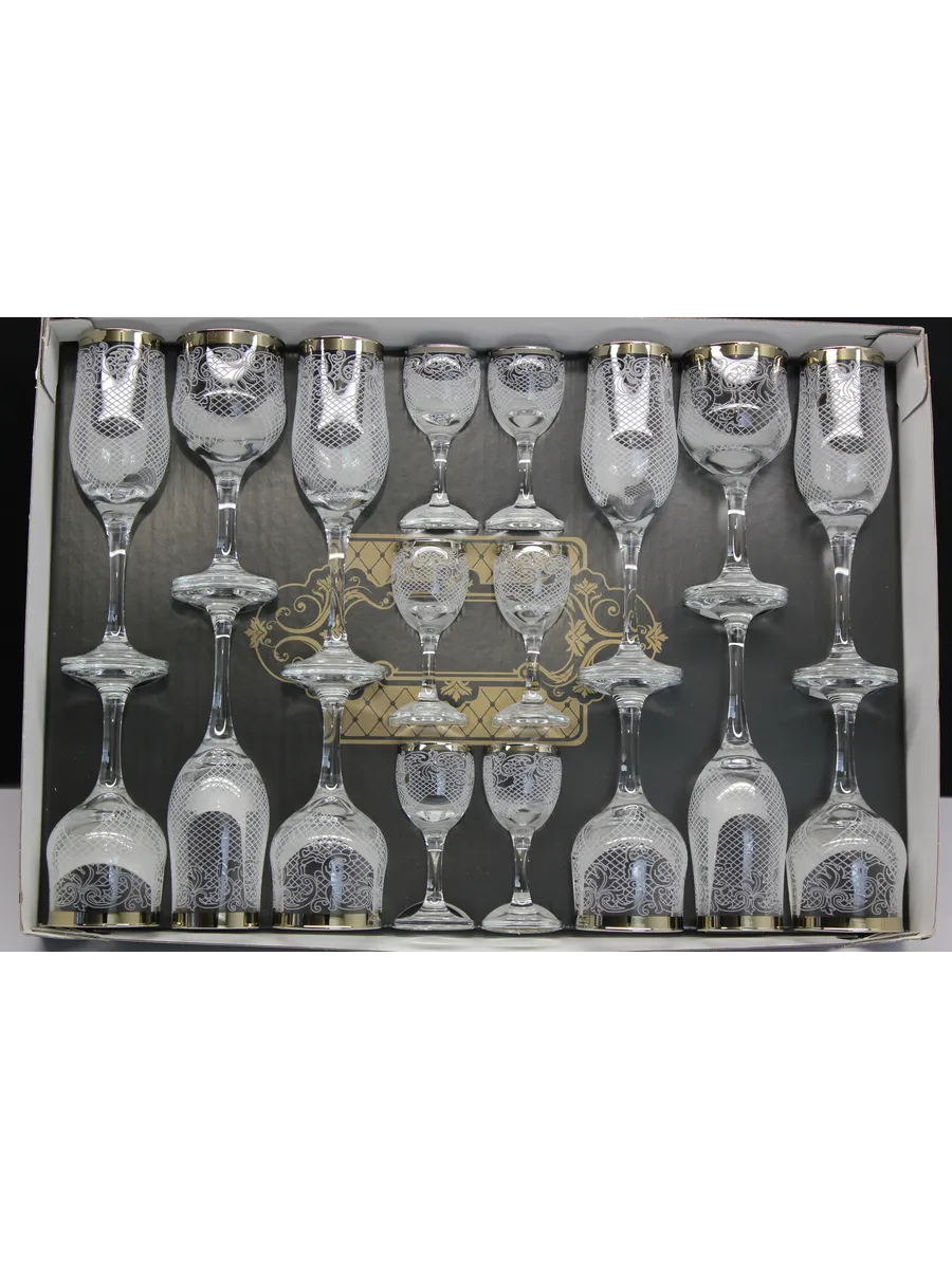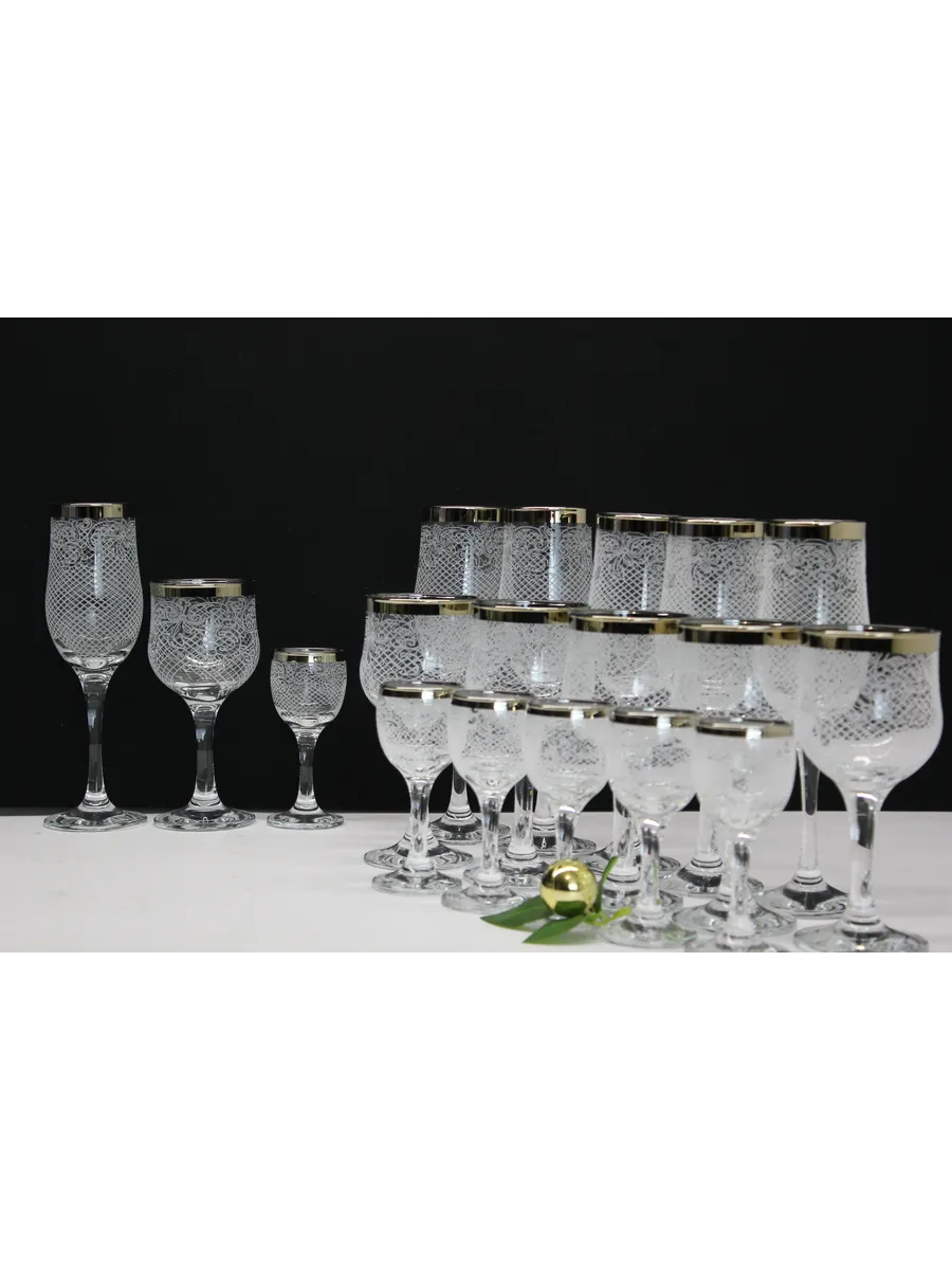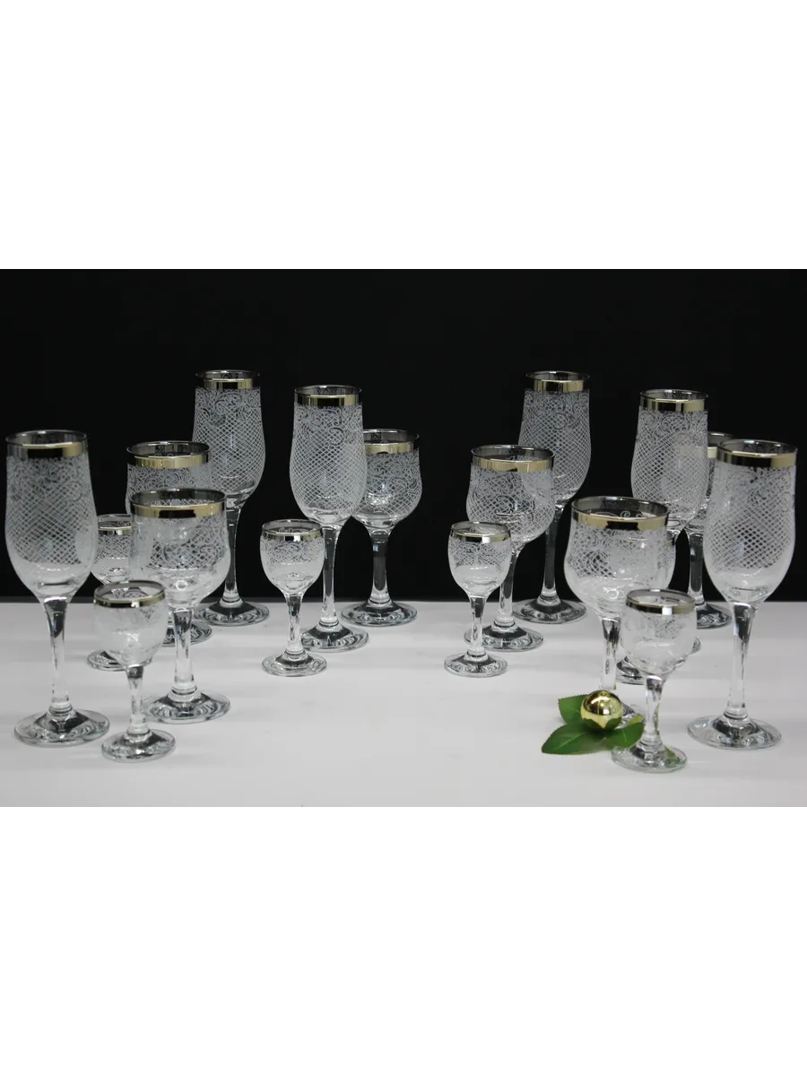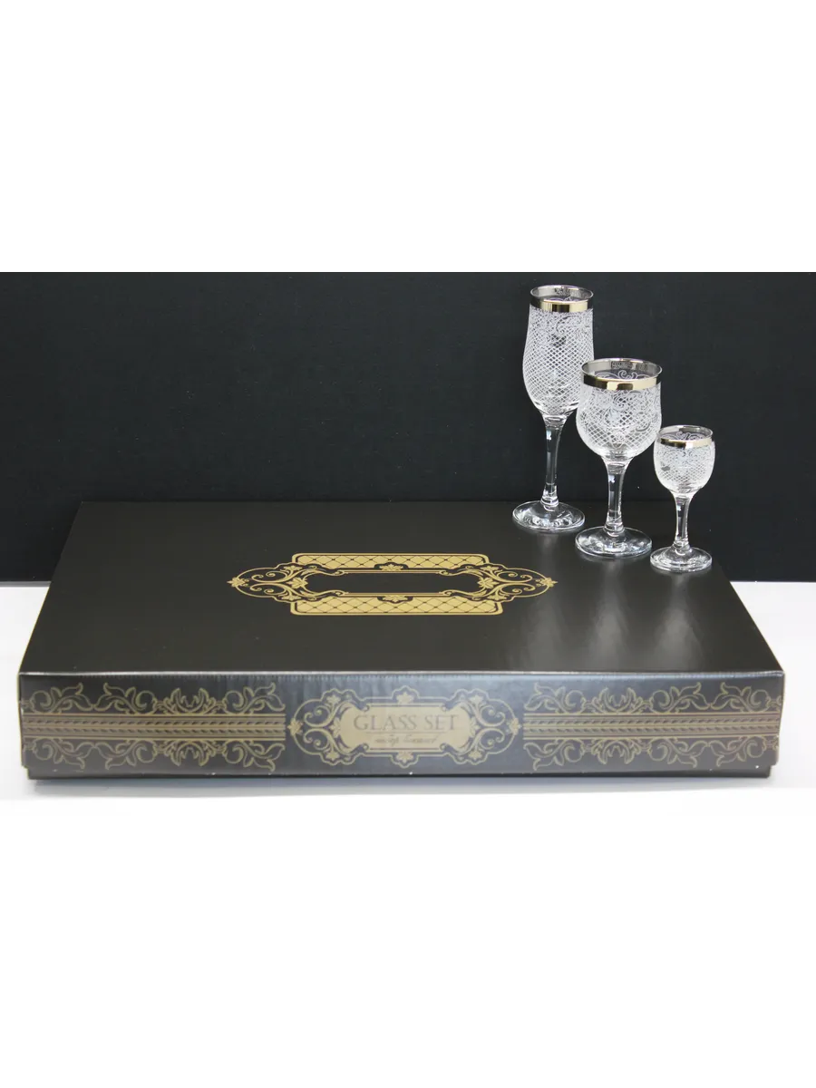 Подарочные бокалы и фужеры станут замечательным презентом на любое торжество.Каждый предмет набора изготовлен из прочного стекла и обладает красивой формой, которая придает ему дополнительный шик. Но главным элементом дизайна являются рисунок цветов и золотая отводка, которыми украшен каждые фужер, бокал и рюмка. Мягкие и изящные линии рисунка замечательно сочетаются с блеском фужеров, бокалов и рюмок и создают неповторимый эффект. Этот набор станет отличным подарком для тех, кто ценит красоту, изысканность и гармонию во всем. Он также подойдет для оформления свадебного стола или другого торжества. Набор подарочный «Венецианская нить» — это не просто элемент сервировки стола, это настоящее произведение искусства, где каждый бокал станет символом роскоши и изысканности.