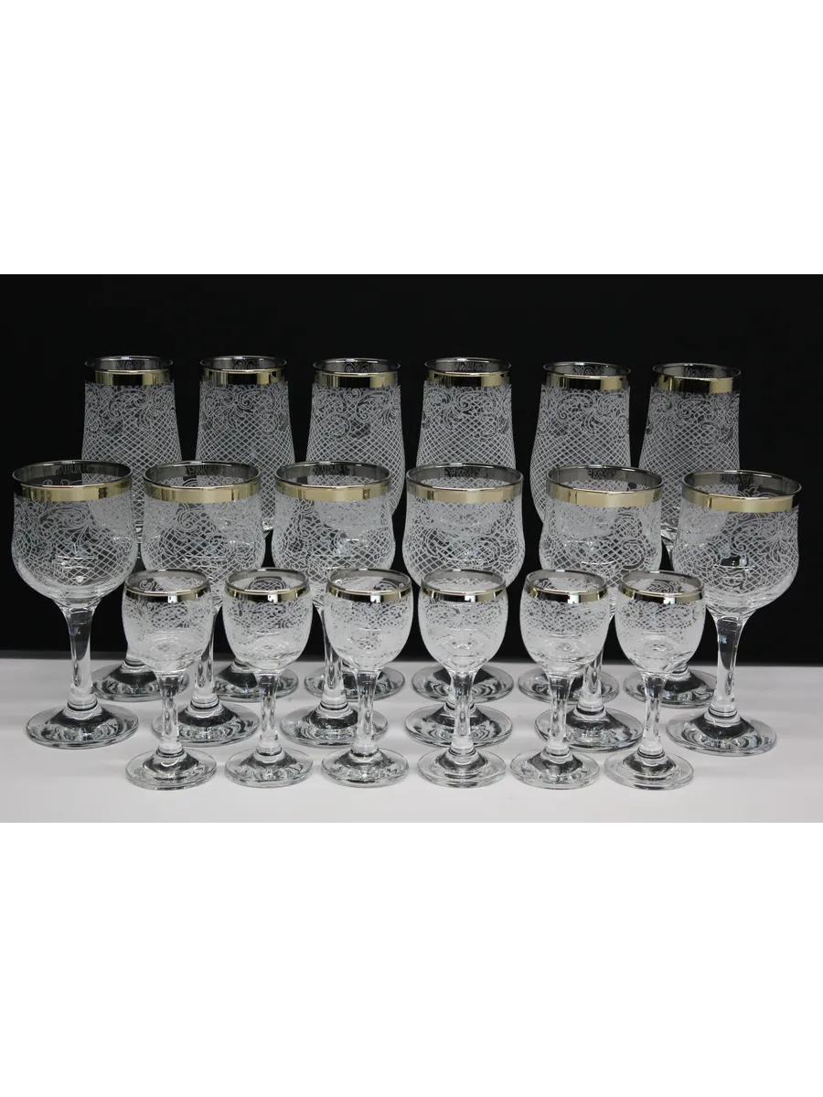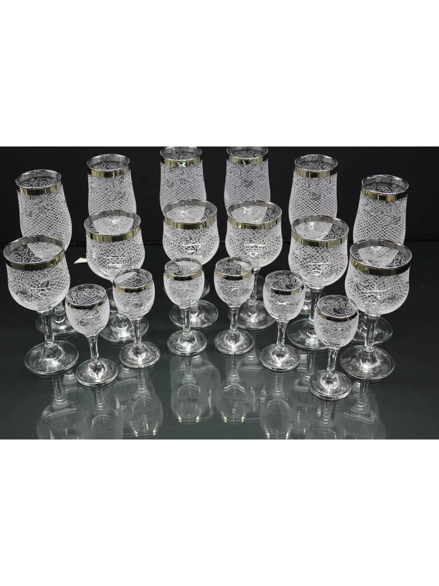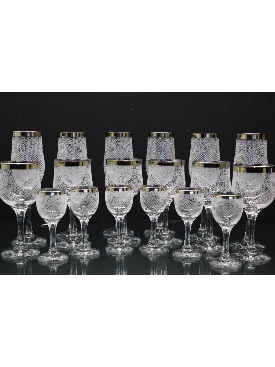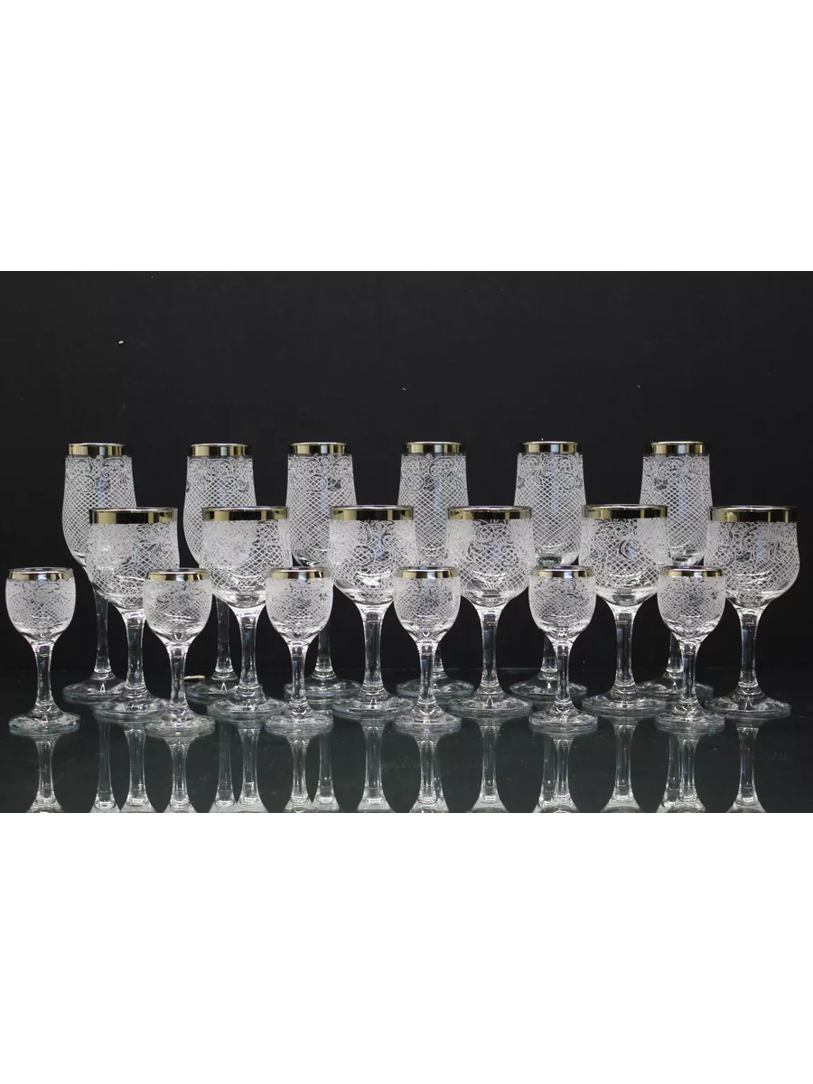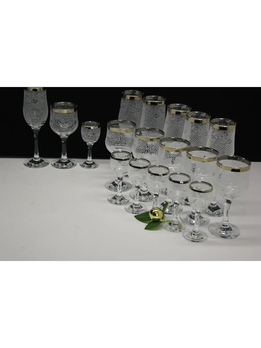 Подарочные бокалы и фужеры станут замечательным презентом на любое торжество.Каждый предмет набора изготовлен из прочного стекла и обладает красивой формой, которая придает ему дополнительный шик. Но главным элементом дизайна являются рисунок цветов и золотая отводка, которыми украшен каждые фужер, бокал и рюмка. Мягкие и изящные линии рисунка замечательно сочетаются с блеском фужеров, бокалов и рюмок и создают неповторимый эффект. Этот набор станет отличным подарком для тех, кто ценит красоту, изысканность и гармонию во всем. Он также подойдет для оформления свадебного стола или другого торжества. Набор подарочный «Венецианская нить» — это не просто элемент сервировки стола, это настоящее произведение искусства, где каждый бокал станет символом роскоши и изысканности.