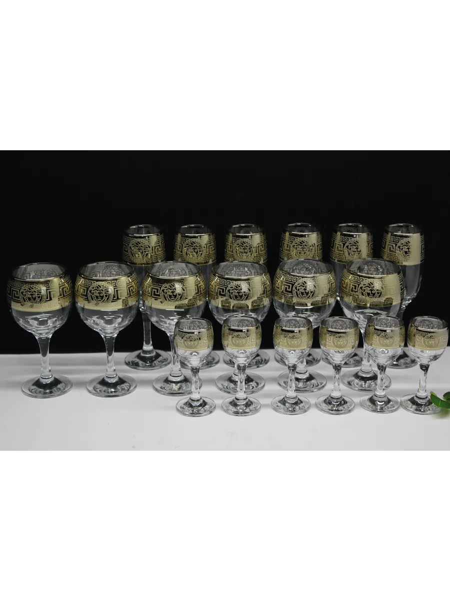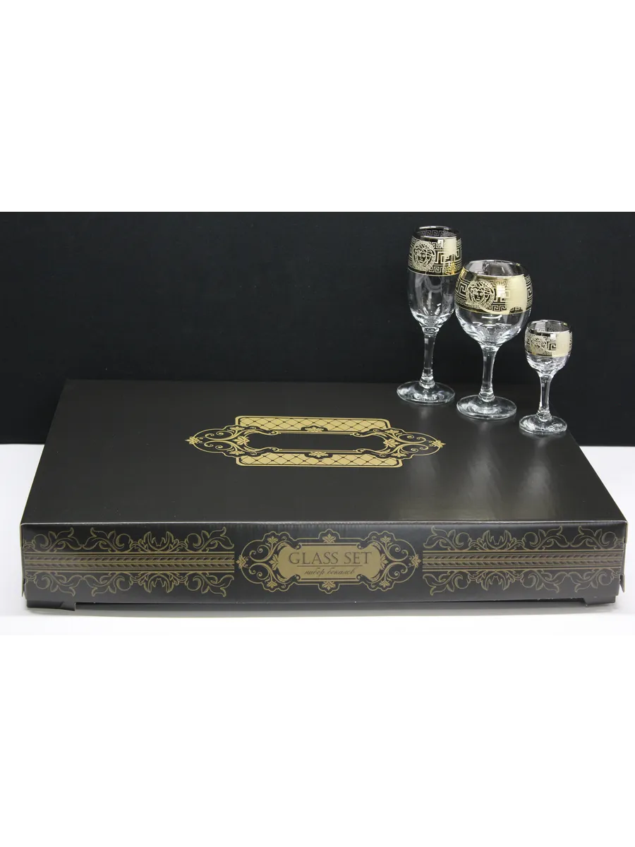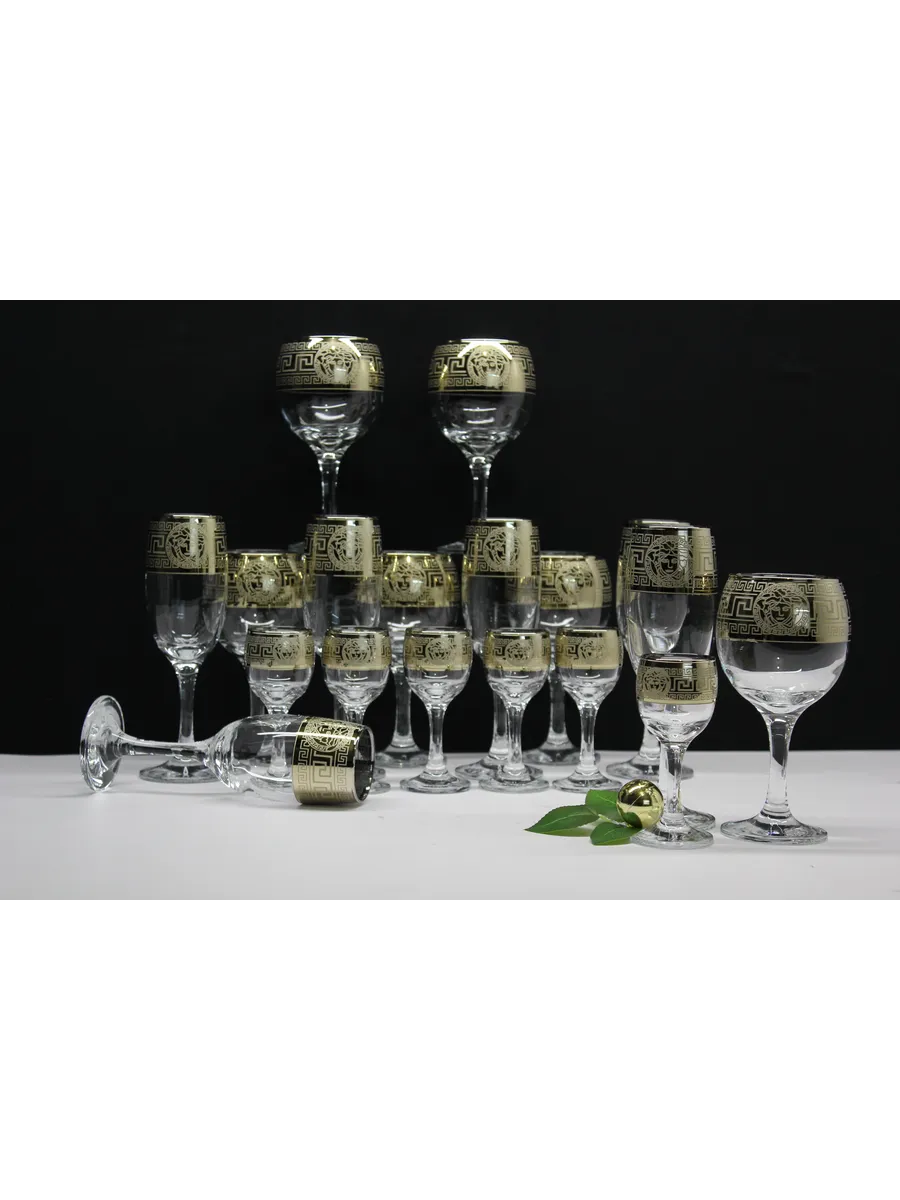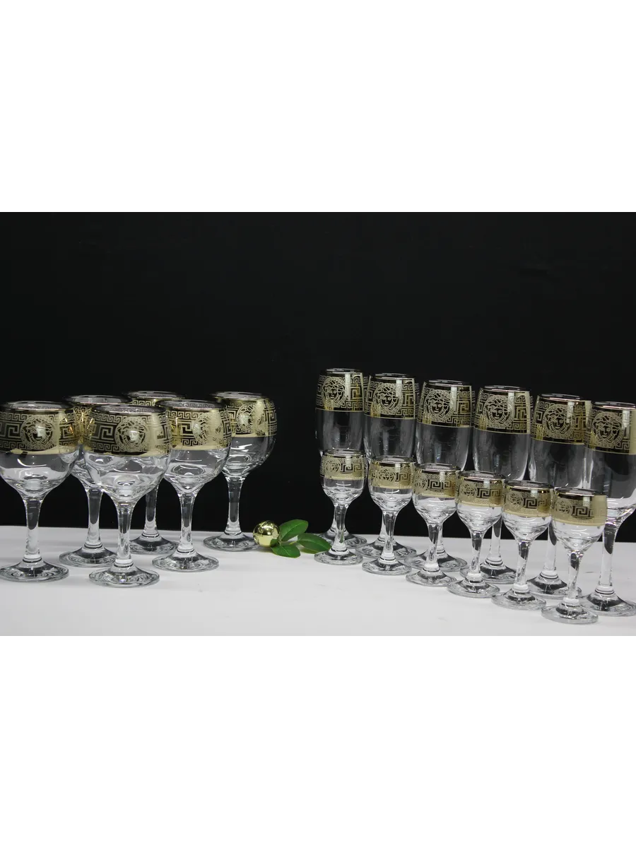 Подарочные бокалы и фужеры станут замечательным презентом на любое торжество.Каждый предмет набора изготовлен из прочного стекла и обладает красивой формой, которая придает ему дополнительный шик. Но главным элементом дизайна является богемная золотая гравировка Версаче, которая изыскано украшает фужер, бокал и рюмку, придавая набору боржуазный шик. Золотая и изящная гравировка замечательно сочетаются с блеском фужеров, бокалов и рюмок и создают неповторимый эффект. Этот набор станет отличным подарком для тех, кто ценит красоту, изысканность и гармонию во всем. Он также подойдет для оформления свадебного стола или другого торжества. Набор подарочный «Версаче» — это не просто элемент сервировки стола, это настоящее произведение искусства, где каждый бокал станет символом роскоши и изысканности.
