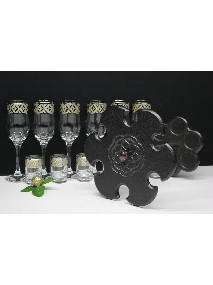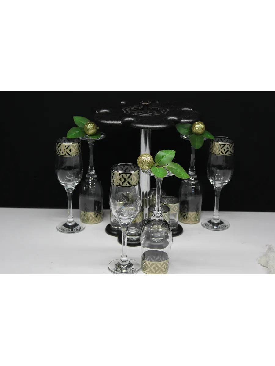 Барный набор 12 предметов из 6 бокалов 6 стопок с гравировкой и золотым напылением на барной стойке из МДФ - это не только функциональная вещь, но и настоящий предмет искусства, который будет радовать глаз и душу на многие годы. Закажите сейчас и наслаждайтесь настоящими напитками в стильном и роскошном дизайне!