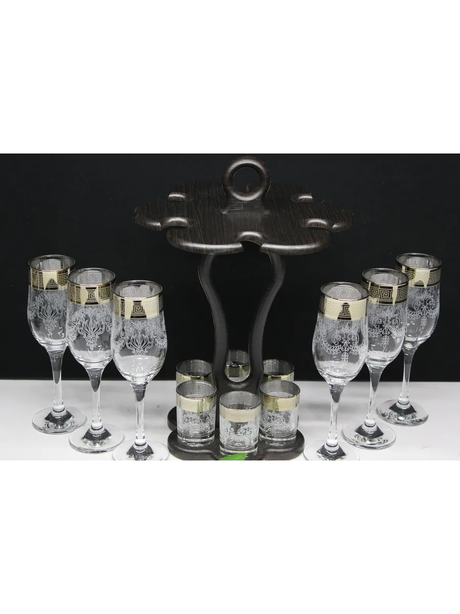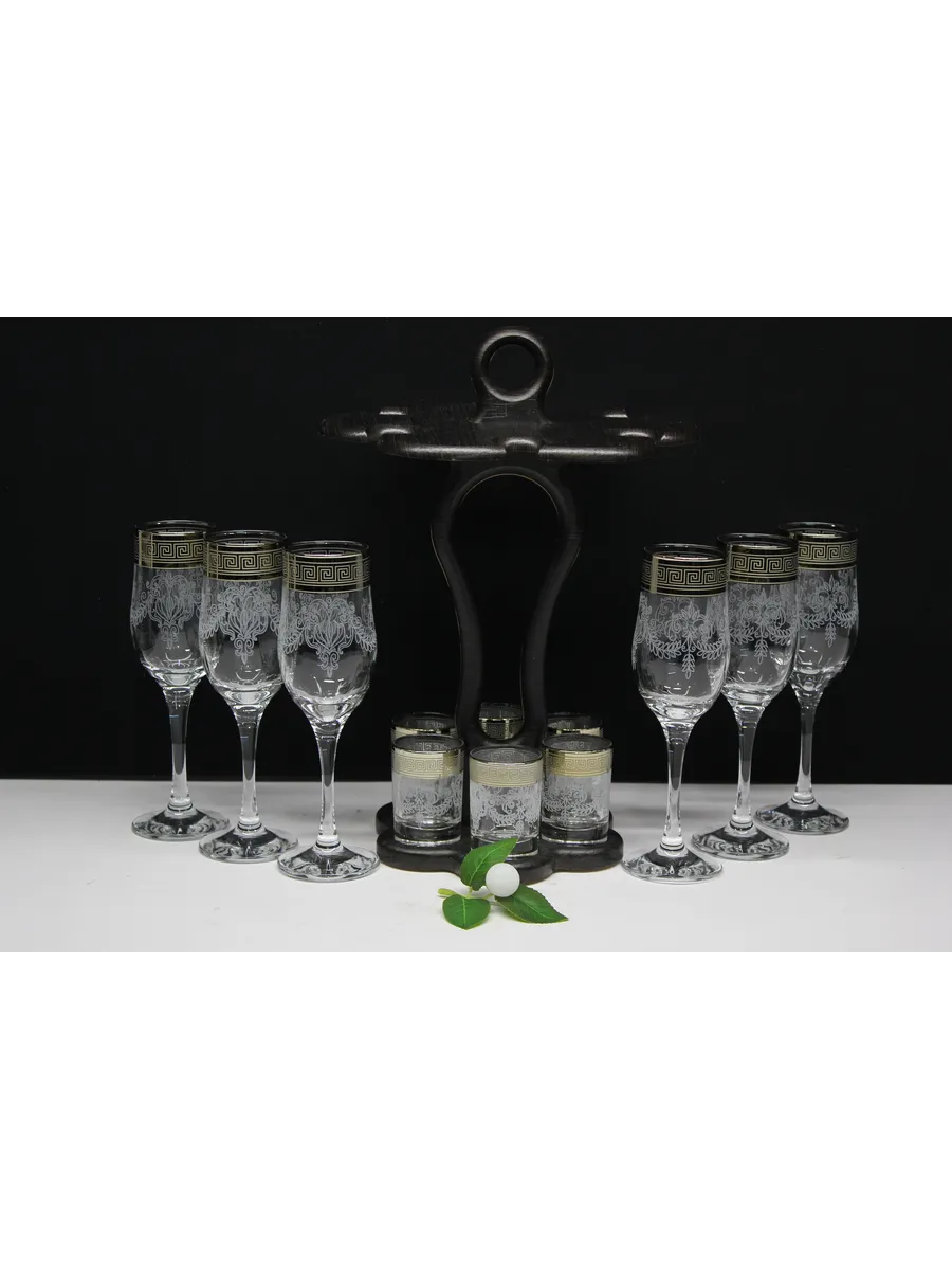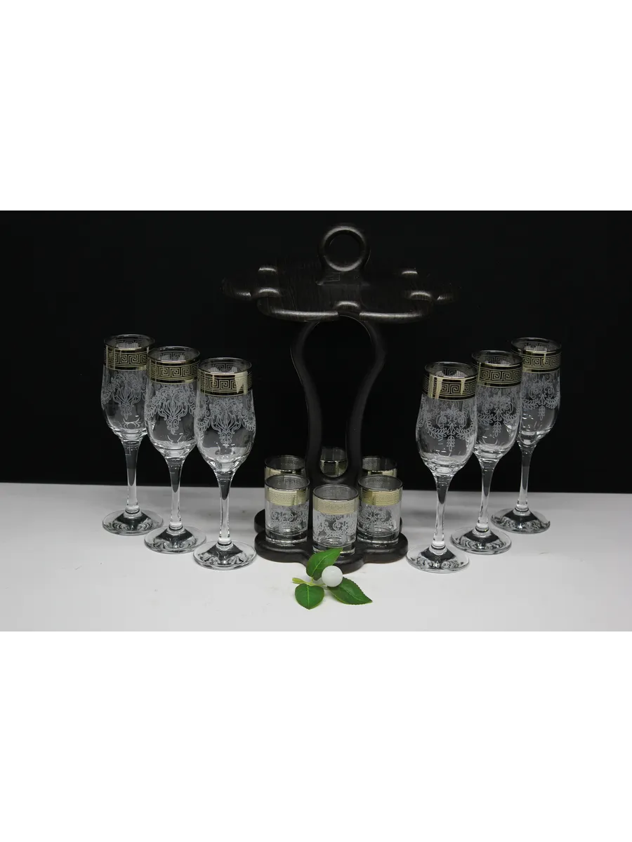 Барный набор 12 предметов из 6 бокалов 6 стопок с гравировкой и золотым напылением на барной стойке из МДФ - это не только функциональная вещь, но и настоящий предмет искусства, который будет радовать глаз и душу на многие годы. Закажите сейчас и наслаждайтесь настоящими напитками в стильном и роскошном дизайне!