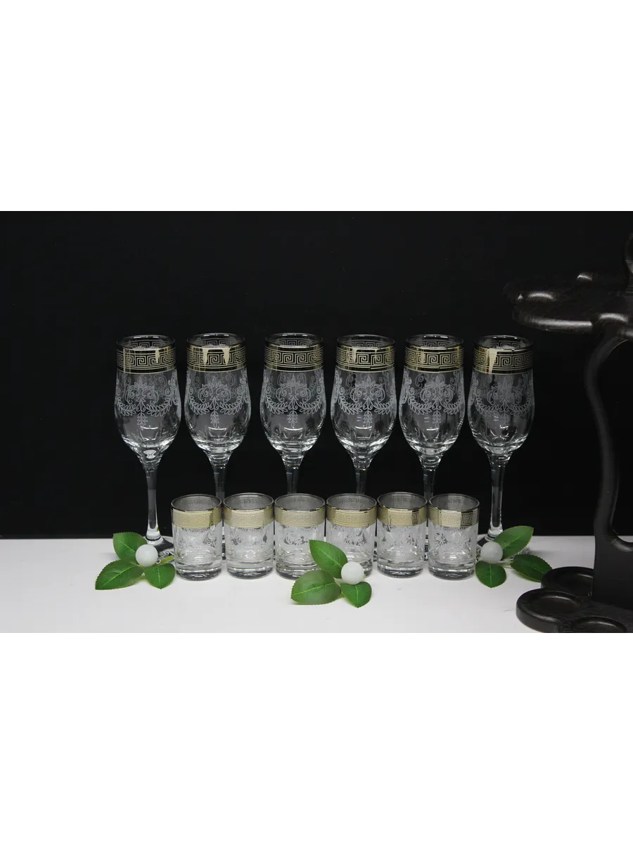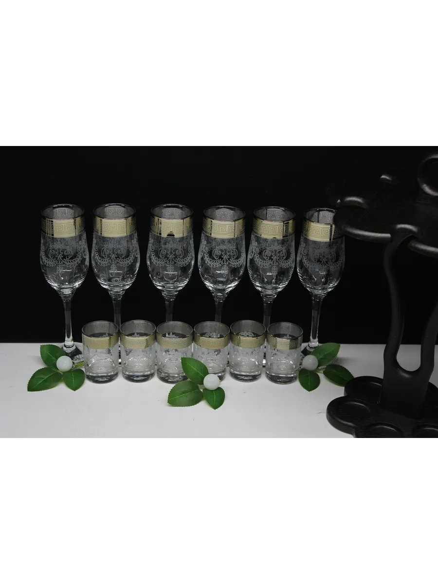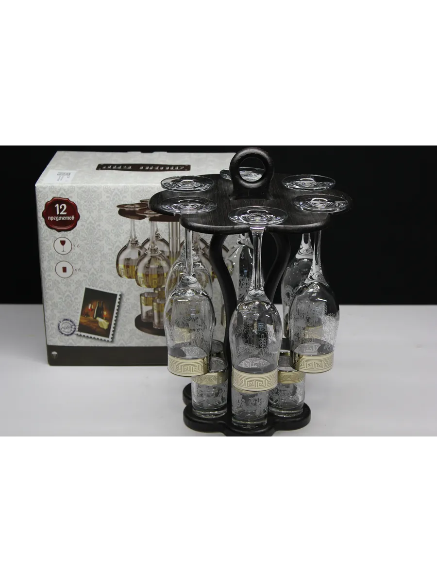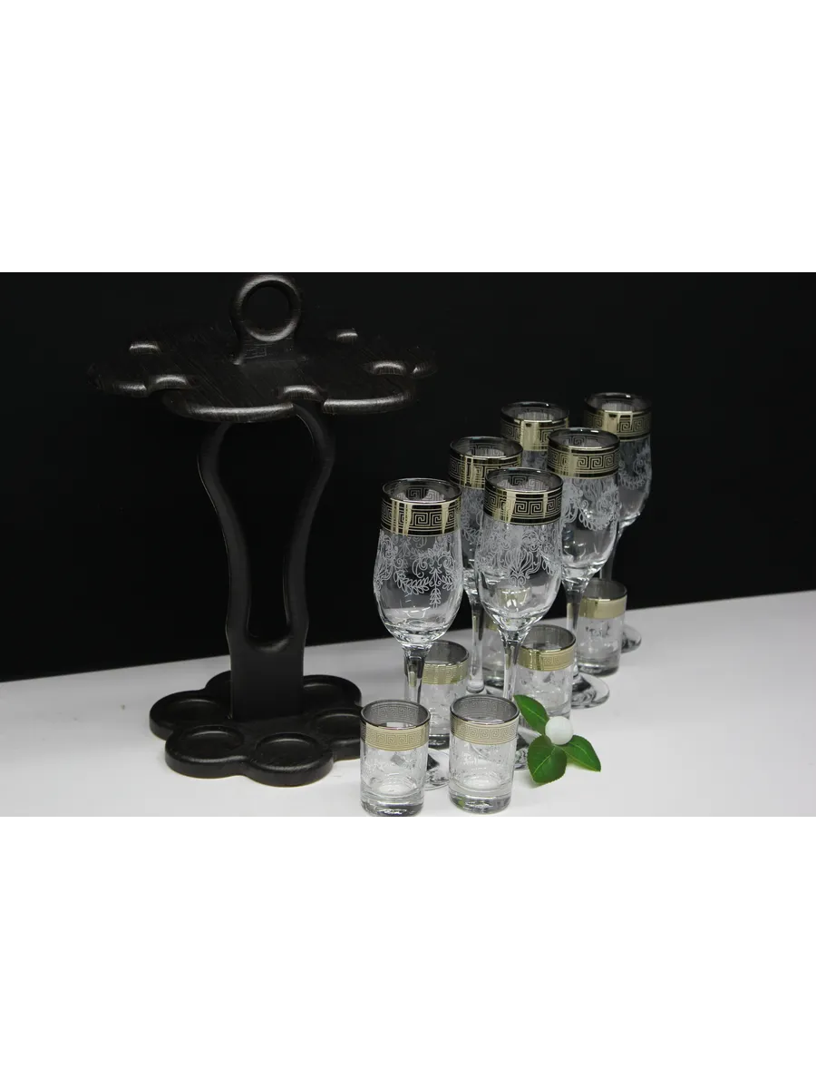 Барный набор 12 предметов из 6 бокалов 6 стопок с гравировкой и золотым напылением на барной стойке из МДФ - это не только функциональная вещь, но и настоящий предмет искусства, который будет радовать глаз и душу на многие годы. Закажите сейчас и наслаждайтесь настоящими напитками в стильном и роскошном дизайне!