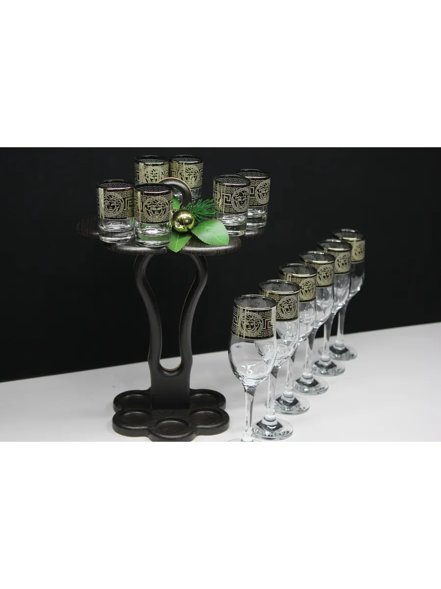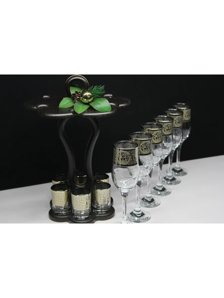Гравировка в стиле версаче и золотое напыление придают набору оригинальный и роскошный вид. Барная стойка из МДФ имеет современный и стильный дизайн, который будет выглядеть отлично в любом интерьере. Она оснащена специальными отсеками для хранения Бокалов и стопок, что позволяет экономить место и поддерживать порядок на барной стойке.