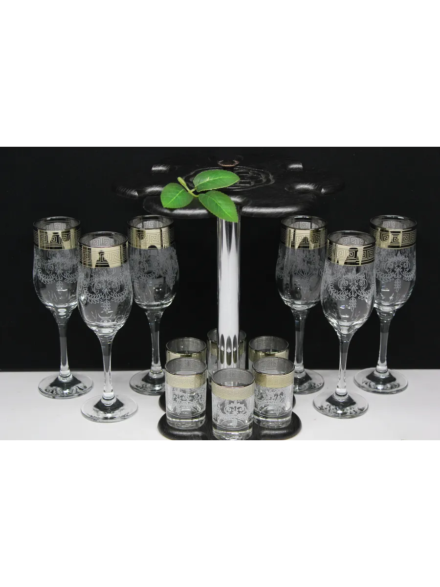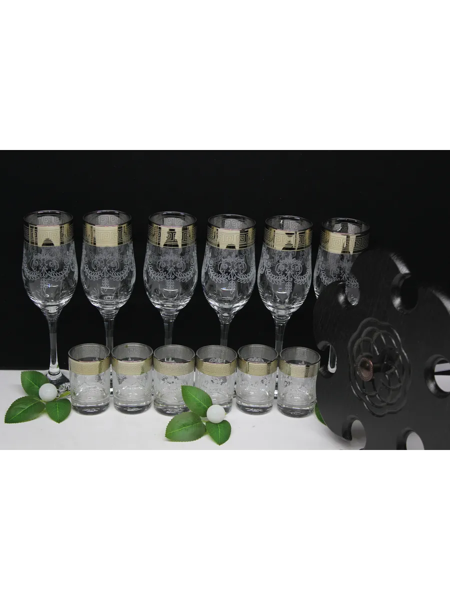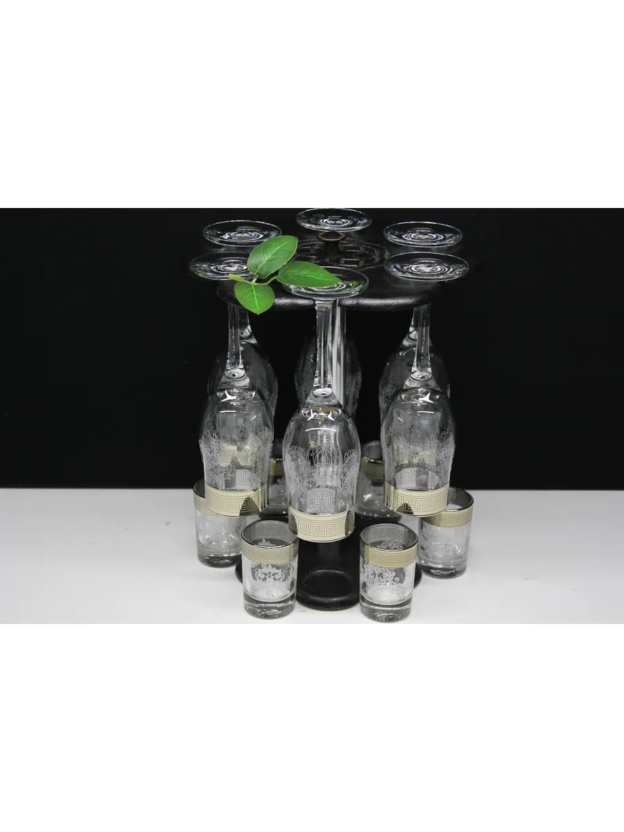 Этот стильный барный набор включает в себя 12 предметов, среди которых 6 боколов и 6 стопок, украшенных гравировкой в стиле барокко и золотым напылением, расположенных на барной стойке из МДФ. Набор изготовлен из высококачественного стекла и МДФ, которые прочны и легко очищаются. Фужеры имеют удобную форму, которая позволяет легко наливать напиток, а их объем позволяет насладиться полной меркой напитка. Стопки идеальны для разлива других напитков и смешивания коктейлей.