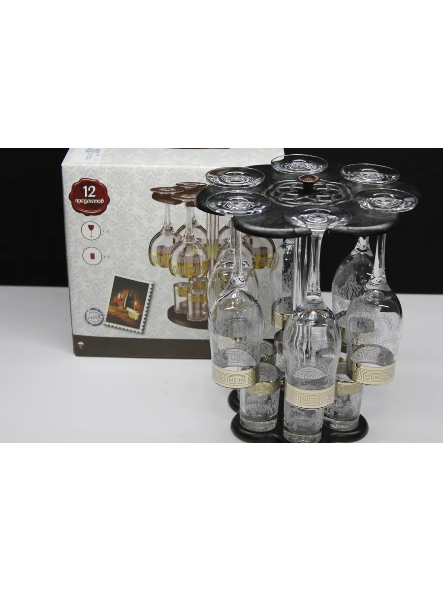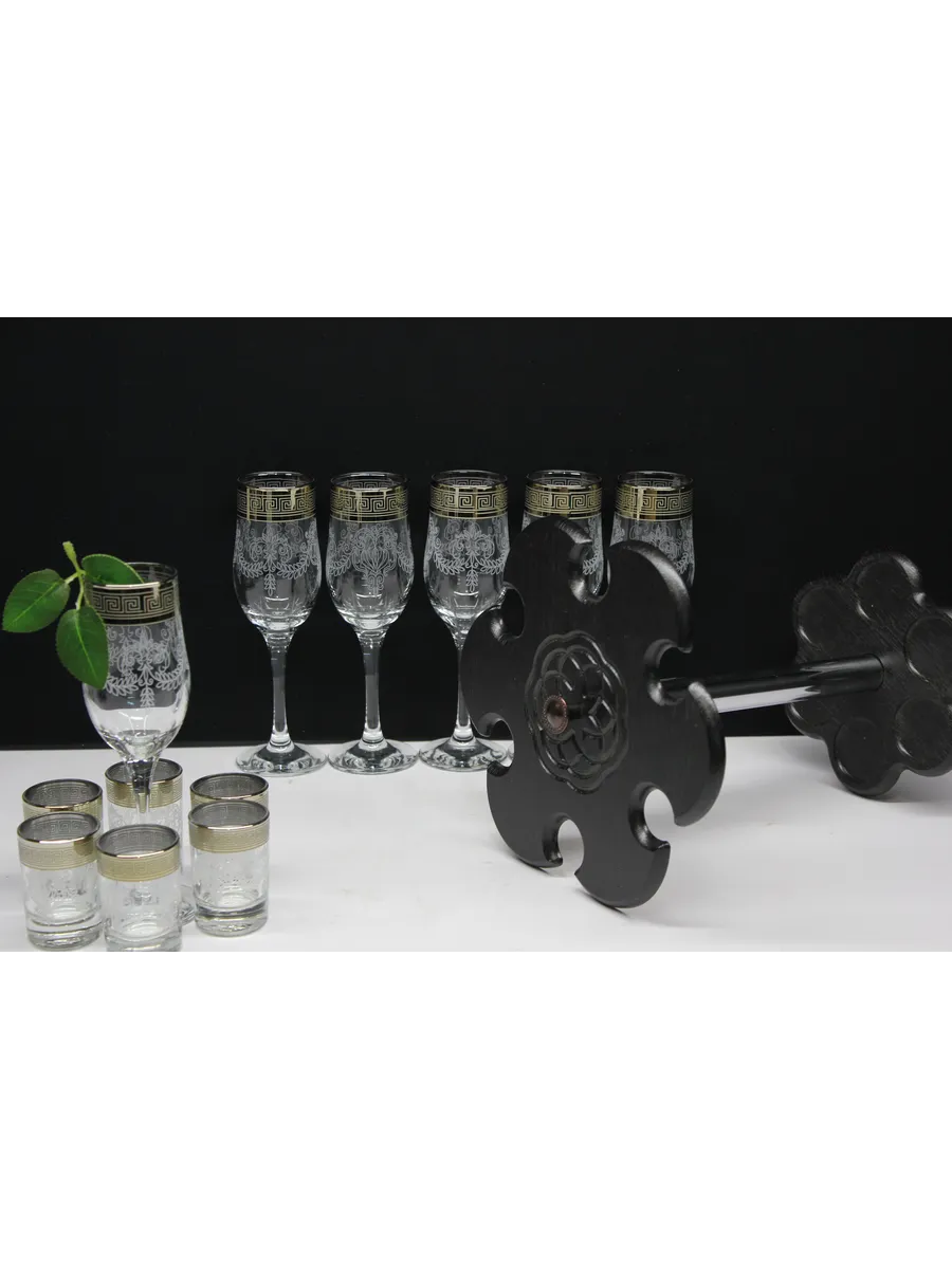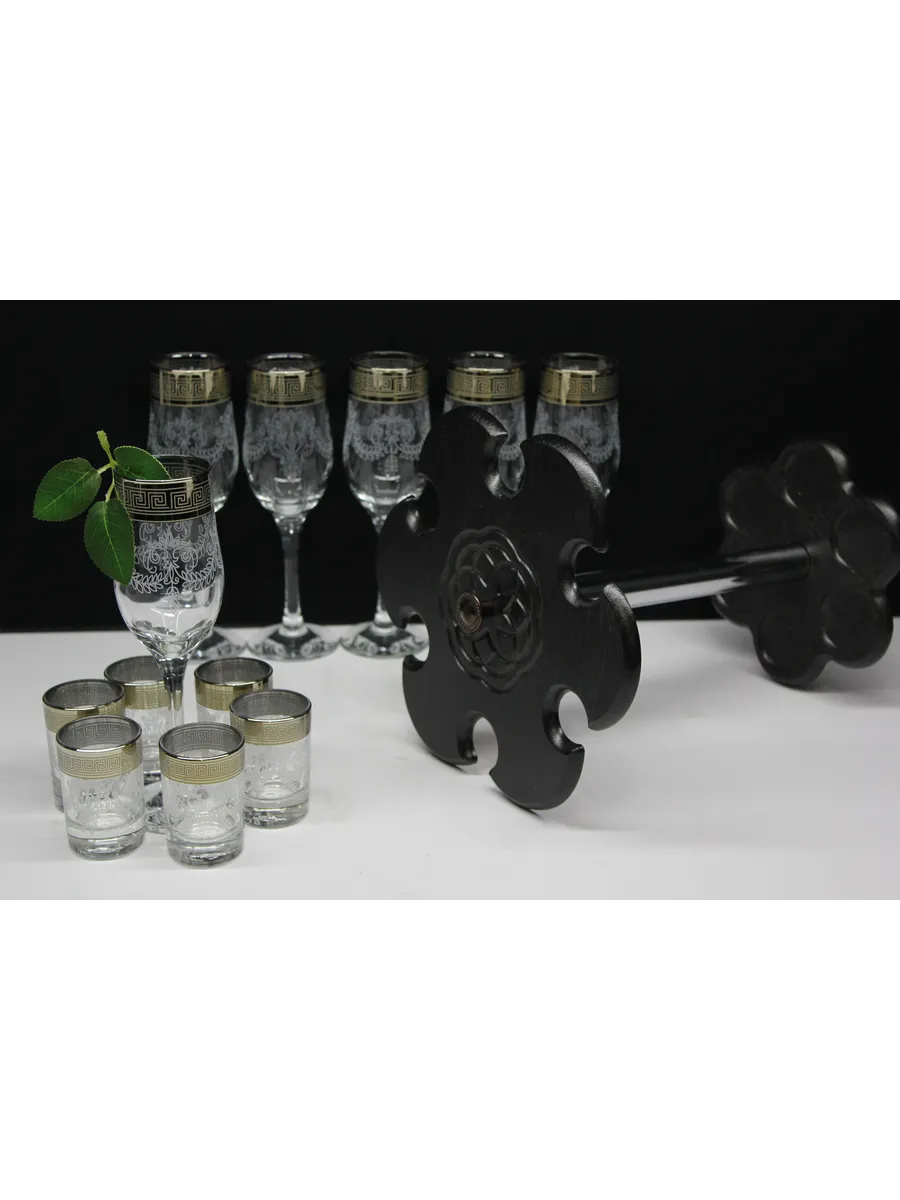 Барный набор 12 предметов из 6 бокалов 6 стопок с гравировкой и золотым напылением на барной стойке из МДФ - это не только функциональная вещь, но и настоящий предмет искусства, который будет радовать глаз и душу на многие годы. Закажите сейчас и наслаждайтесь настоящими напитками в стильном и роскошном дизайне!