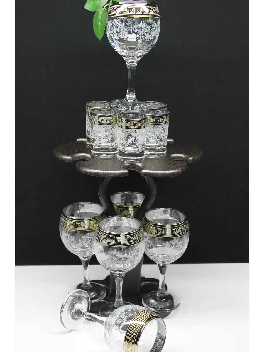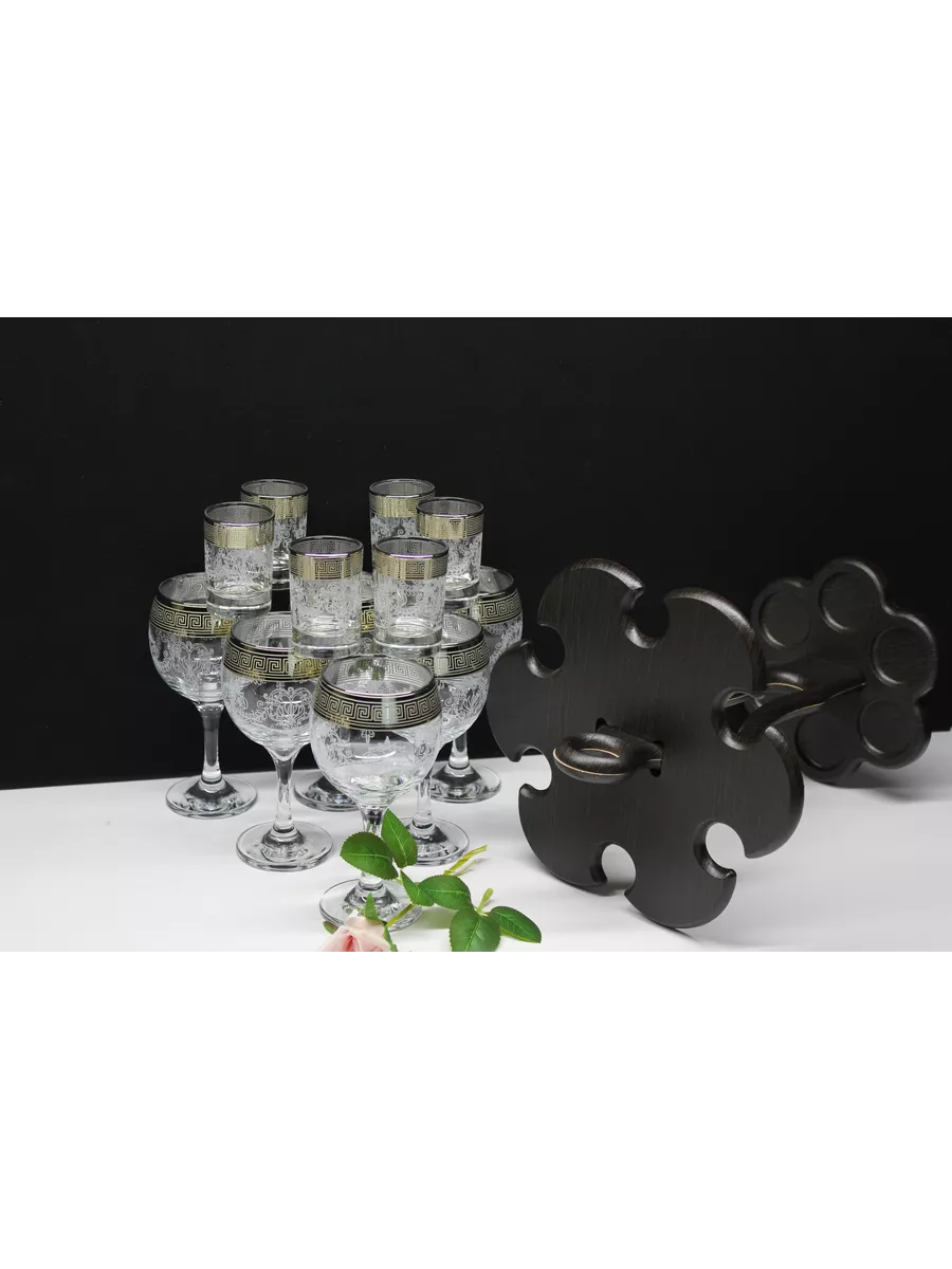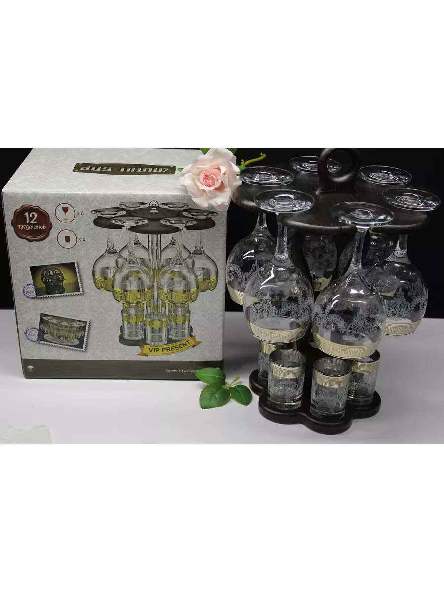 Барный набор 12 предметов из 6 фужеров 6 стопок с гравировкой барокко и золотым напылением на барной стойке из МДФ - это не только функциональная вещь, но и настоящий предмет искусства, который будет радовать глаз и душу на многие годы. Закажите сейчас и наслаждайтесь настоящими напитками в стильном и роскошном дизайне!