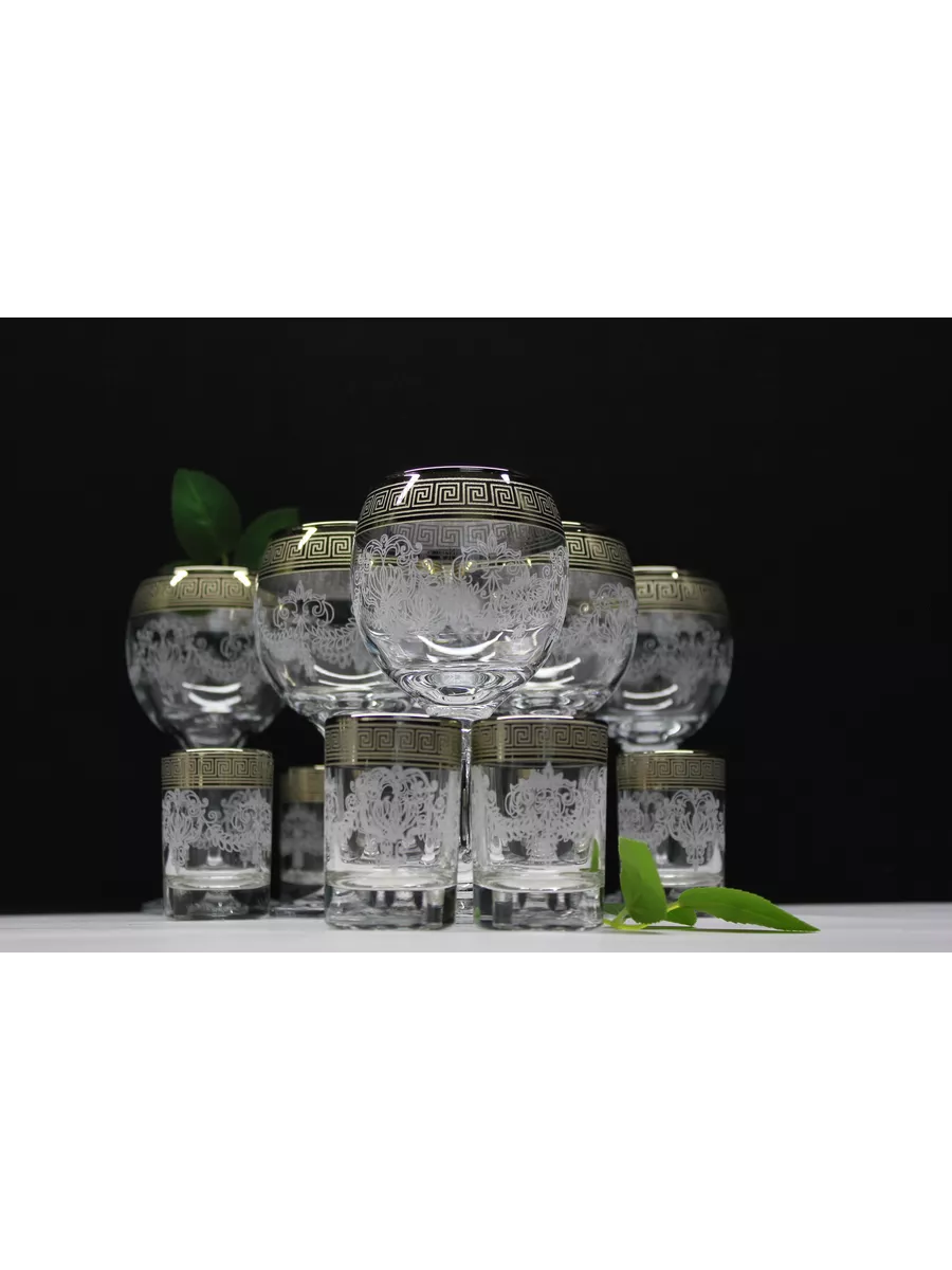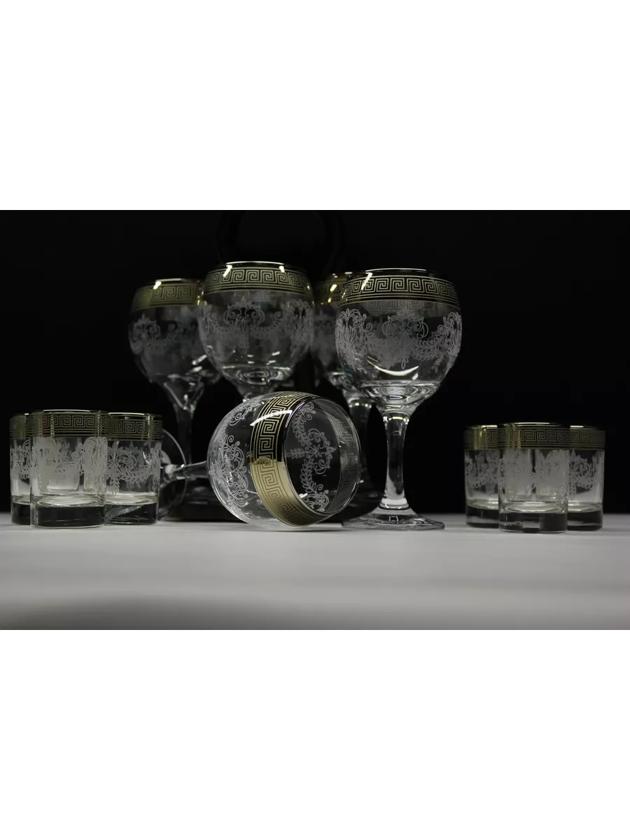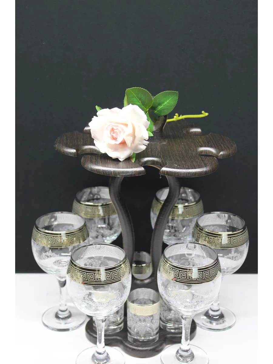 Барный набор 12 предметов из 6 фужеров 6 стопок с гравировкой барокко и золотым напылением на барной стойке из МДФ - это не только функциональная вещь, но и настоящий предмет искусства, который будет радовать глаз и душу на многие годы. Закажите сейчас и наслаждайтесь настоящими напитками в стильном и роскошном дизайне!